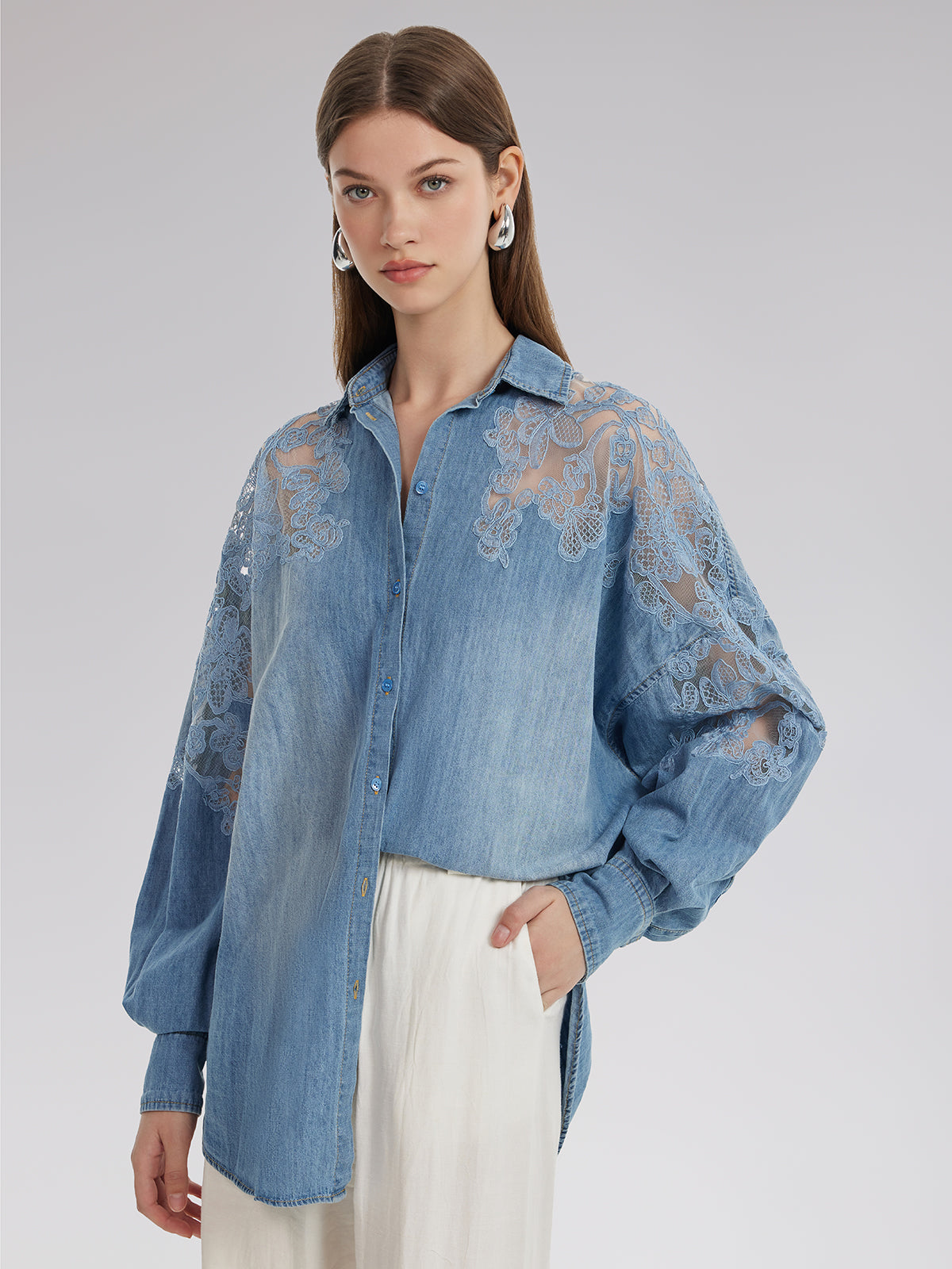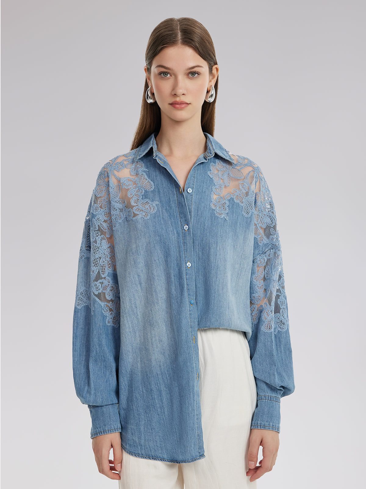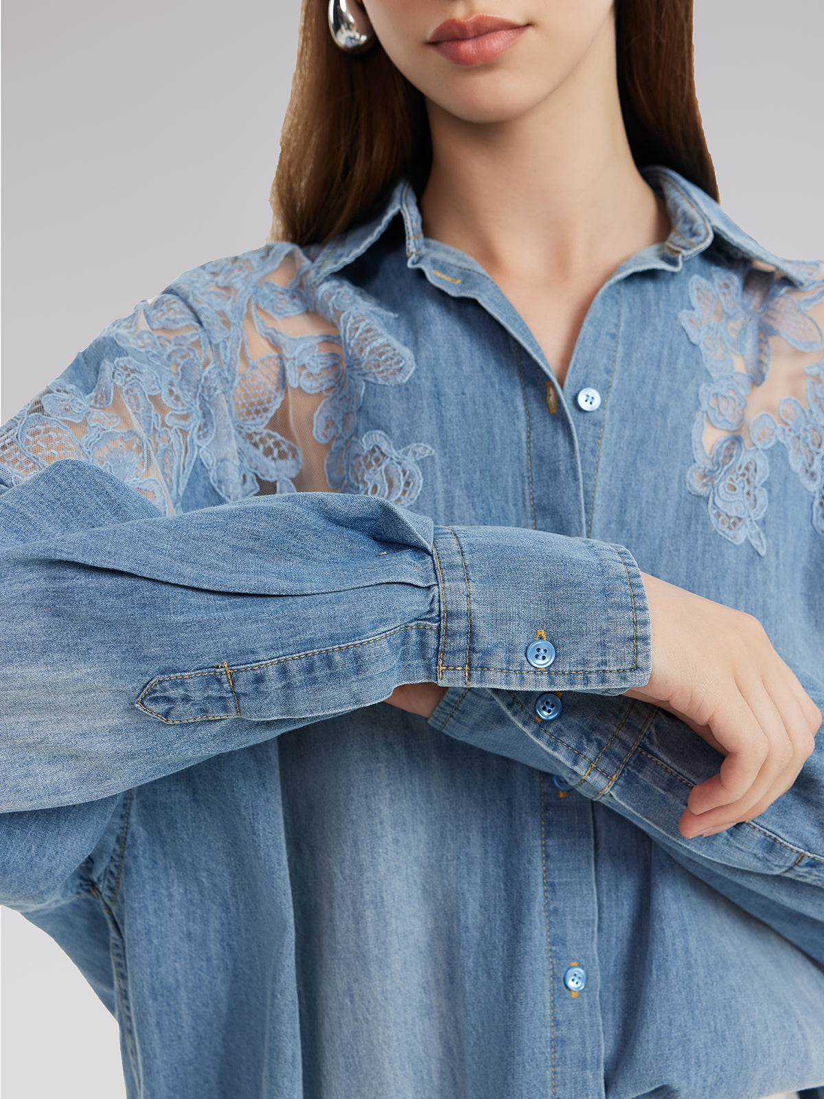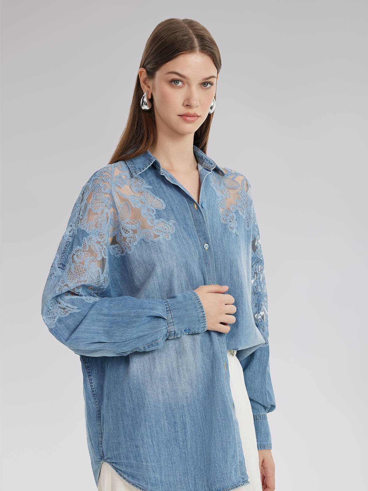 Floral Lace Panel Denim Shirt