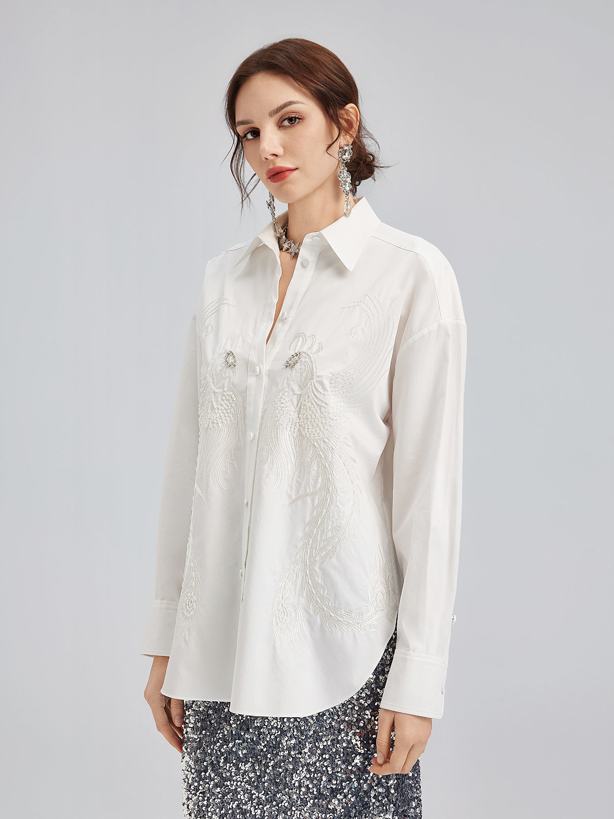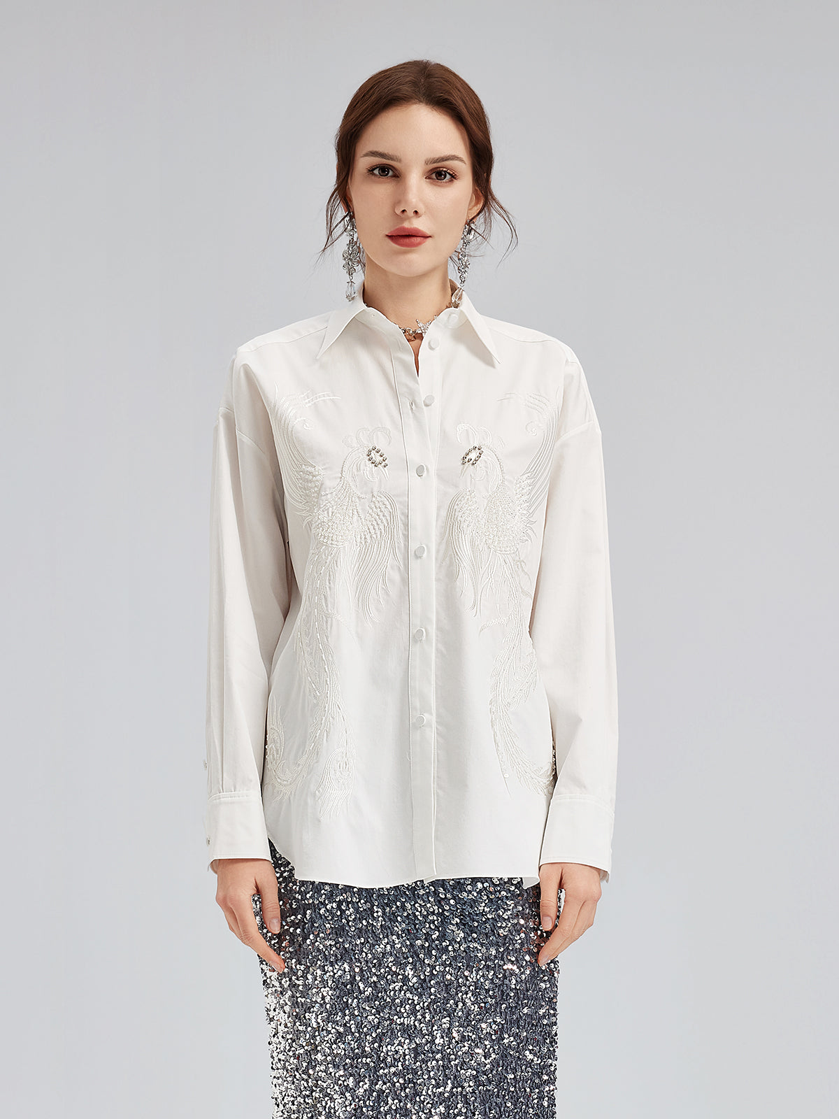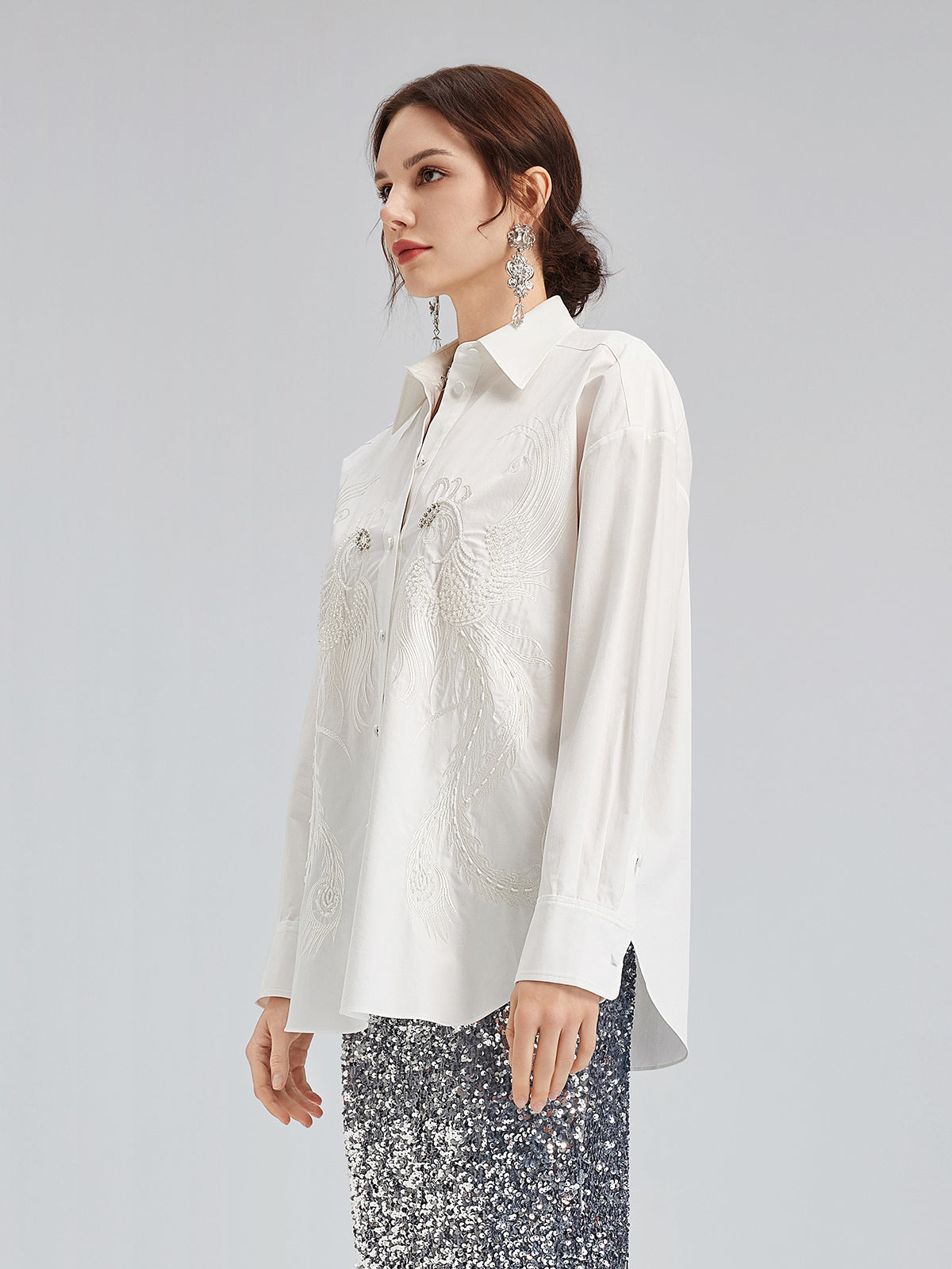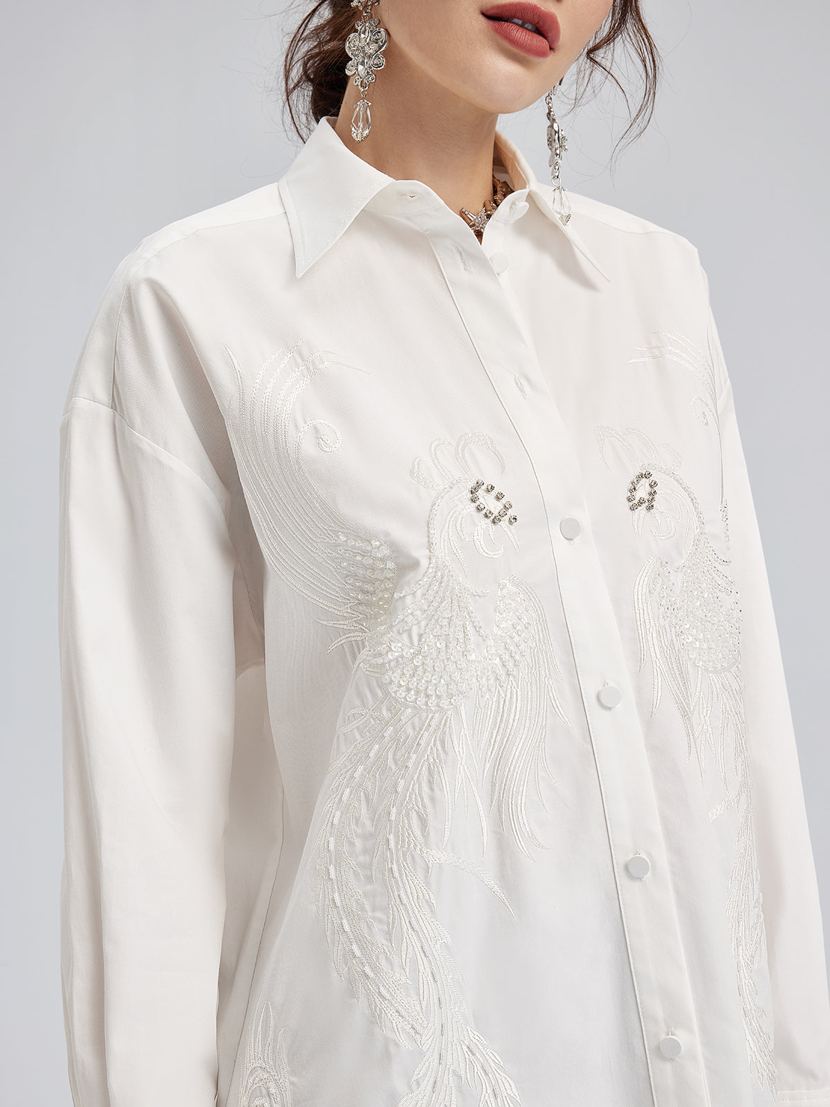 Crafted from 100% high-quality cotton, this shirt offers a soft, breathable feel. The elegant phoenix embroidery, paired with hand-applied beads, adds a luxurious dimension, while the classic collar enhances its refined, modern appeal.