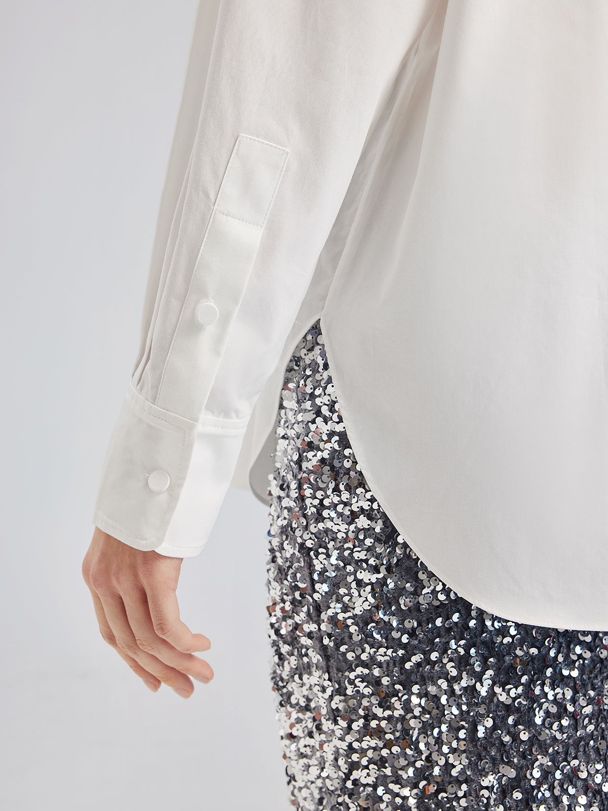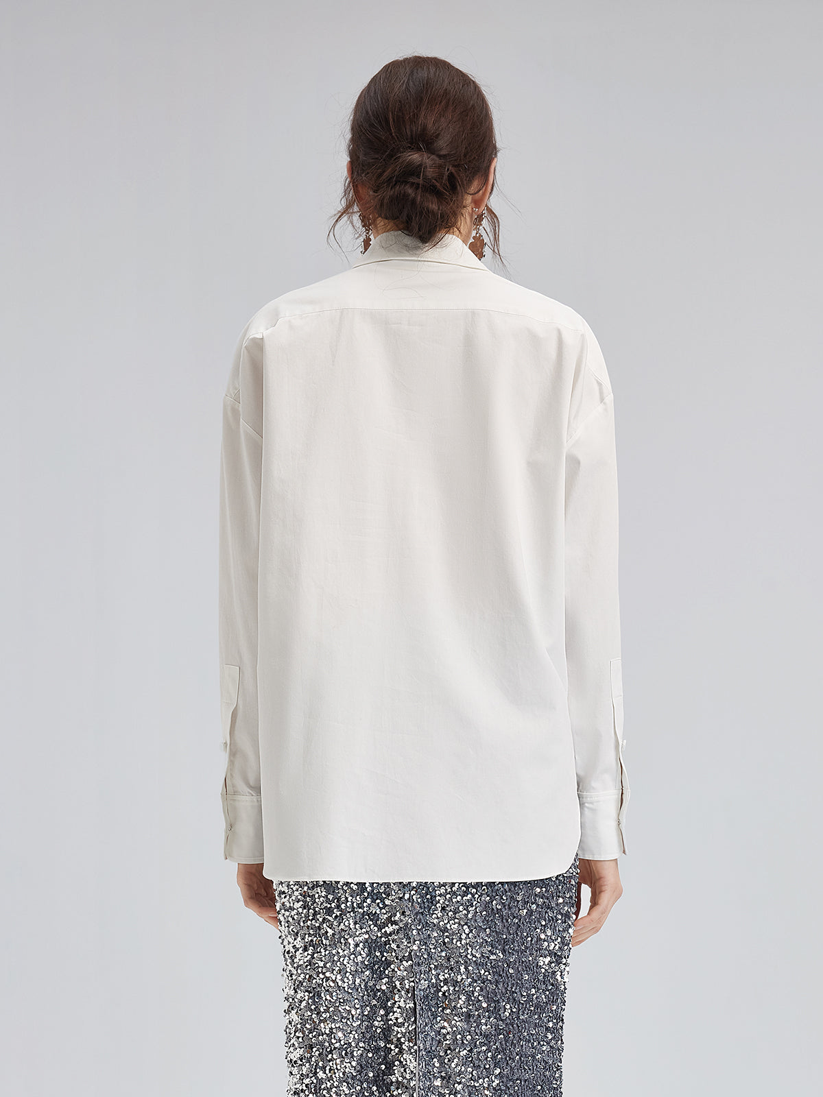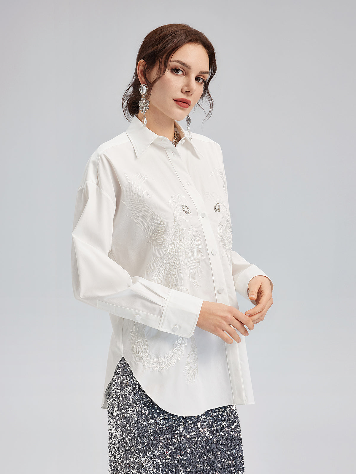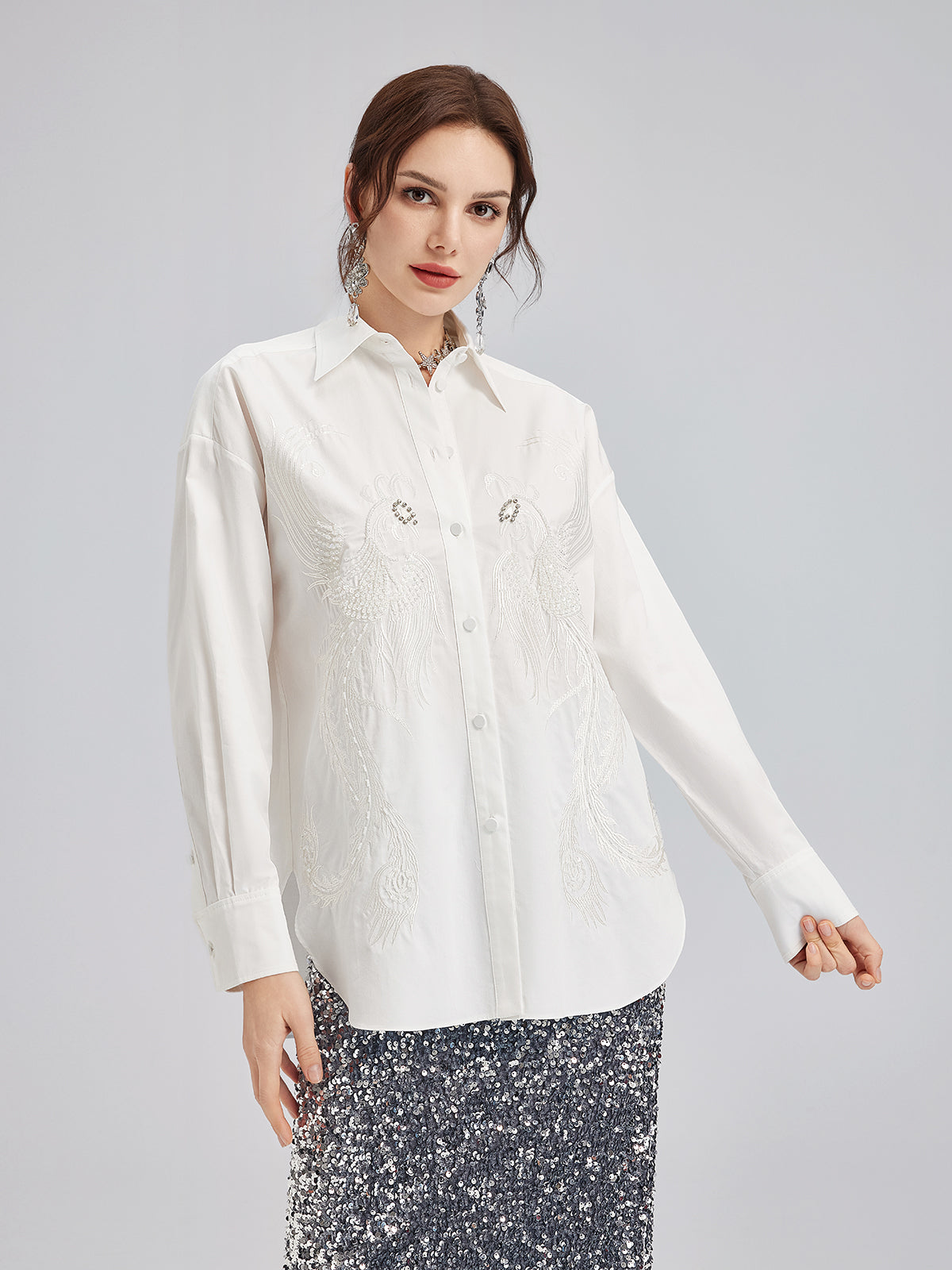Crafted from 100% high-quality cotton, this shirt offers a soft, breathable feel. The elegant phoenix embroidery, paired with hand-applied beads, adds a luxurious dimension, while the classic collar enhances its refined, modern appeal.