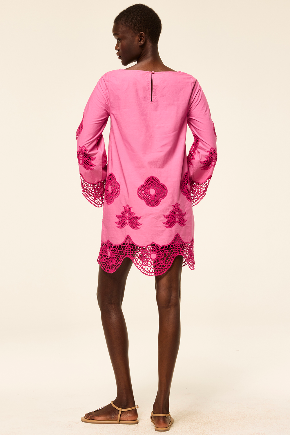 Gallica is a versatile silhouette perfect for transitioning from spring to summer. Made from vibrant fuchsia cotton, it features embroidered lace details along the body, sleeves, cuffs, and hem. The boat neckline and three-quarter length sleeves add a refined touch, while the dress is fully lined for comfort. Hits at the mid thigh. Pair it with sandals for an effortless daytime look.