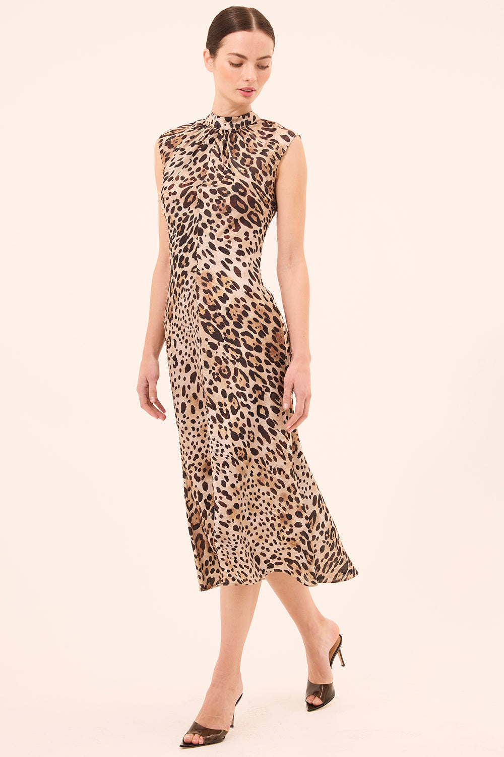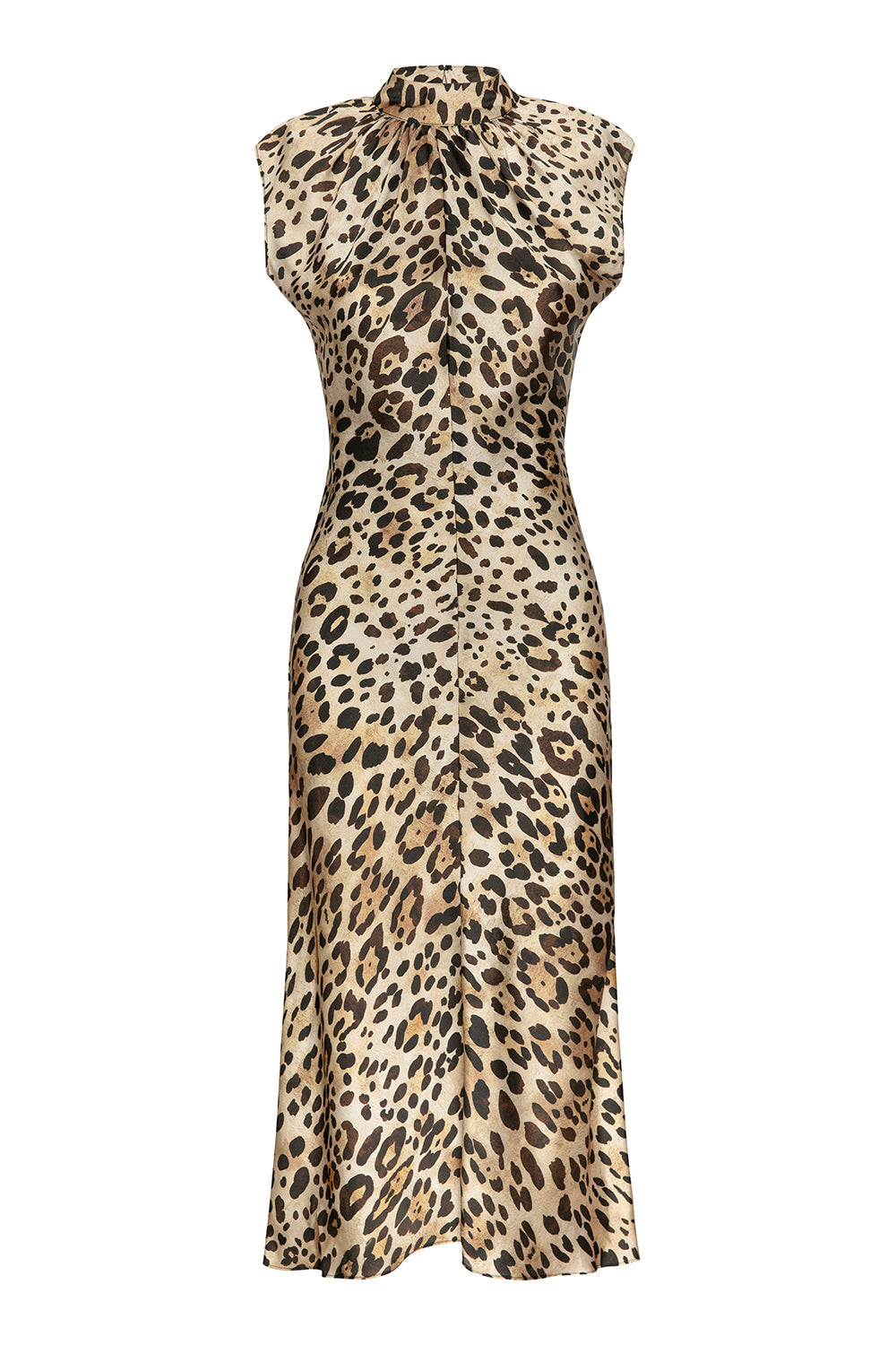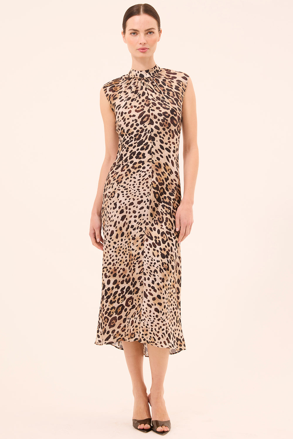 Giselle is a sophisticated high-neck midi dress cut from timeless leopard print satin. Designed with a sleeveless silhouette, mock neckline, and subtle gathering at the collar, it features a flattering center front seam and a slight high-low hem. Style with an oversized blazer and boots for an elevated daytime look or with strappy heels for evening.