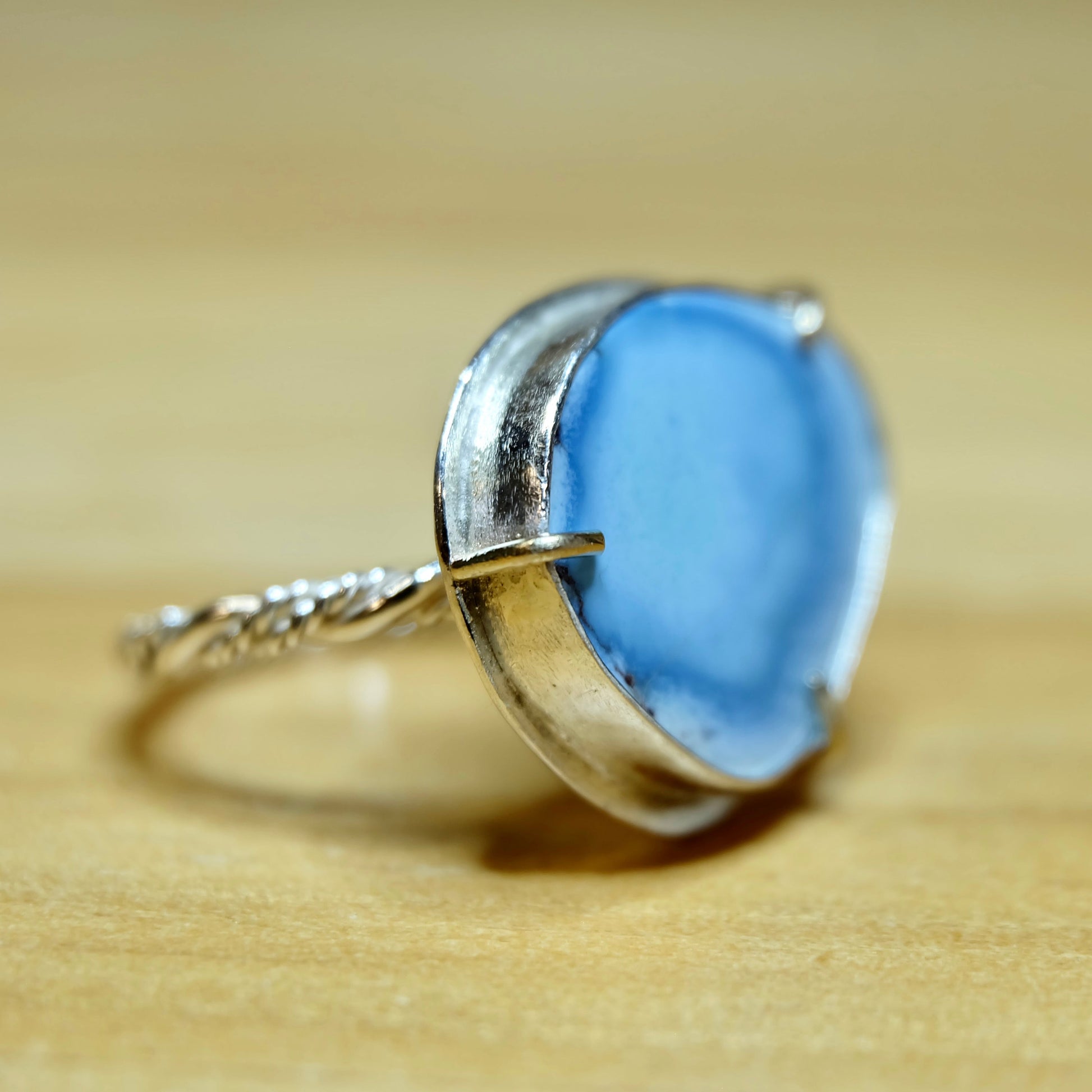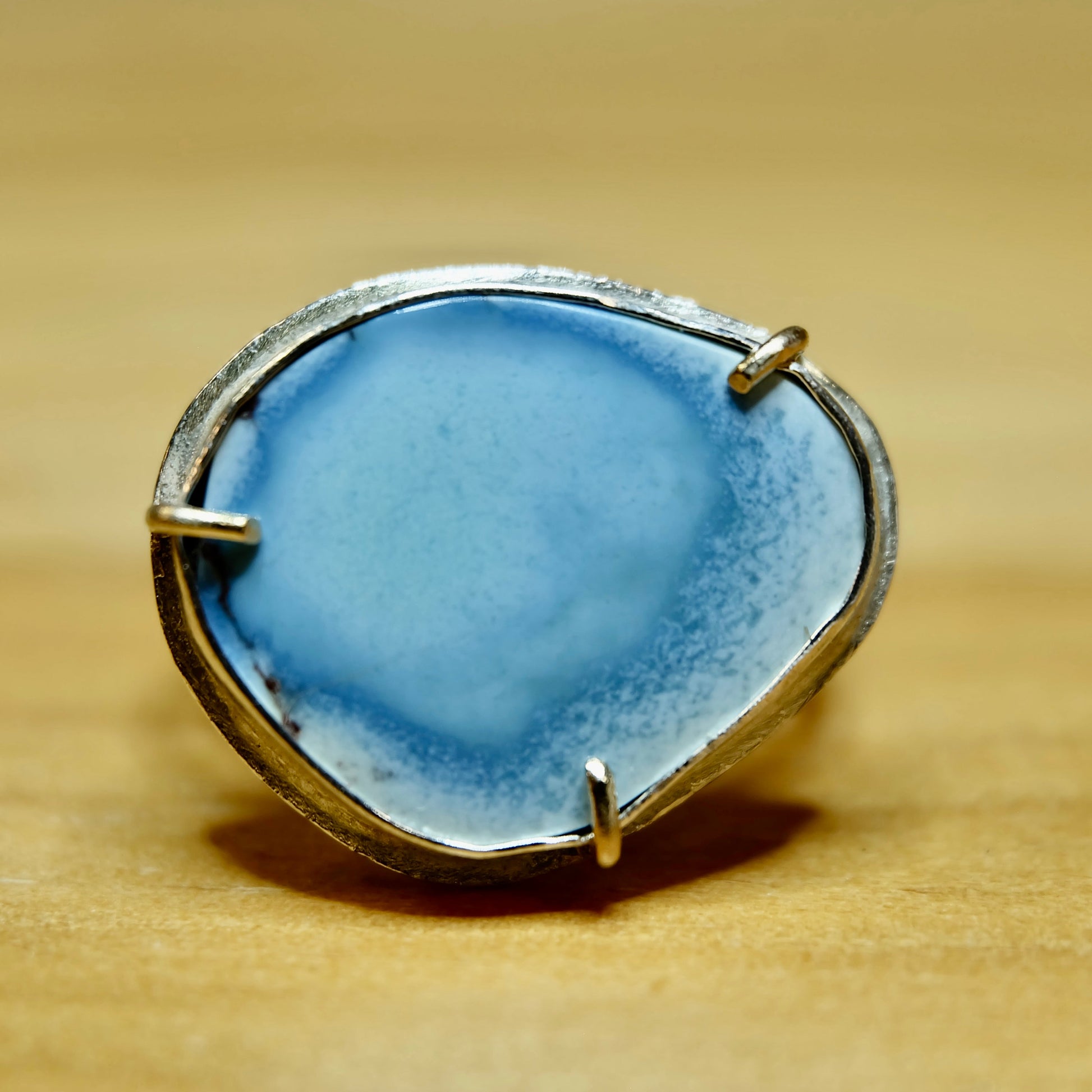 Our turquoise rings are designed and finished by hand, using mine to market turquoise and ethically sourced sterling silver and 14k gold. The braided silver band adds movement and texture, while 14K gold gold prongs raise this rare Golden Hills turquoise into the light—highlighting every swirl of matrix and pale lavender-blue tone. Handmade with exceptional detail, this piece features the finest artistry to ensure a stunning statement ring. Available in limited stock, this ring is a unique addition to any jewelry store’s collection.