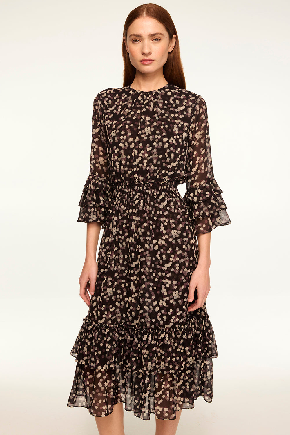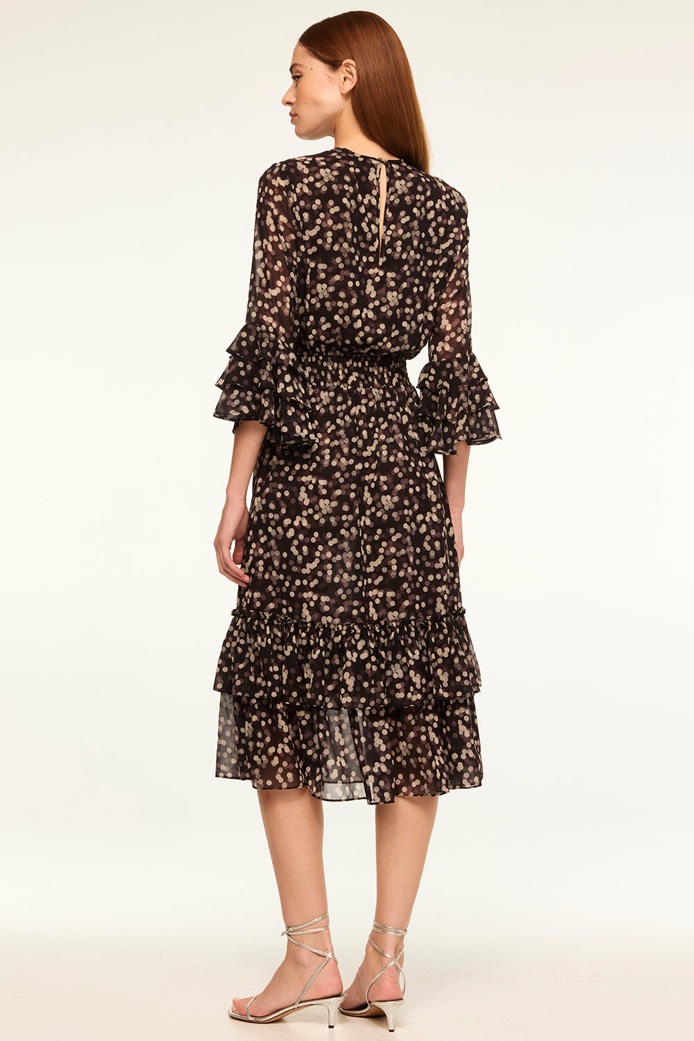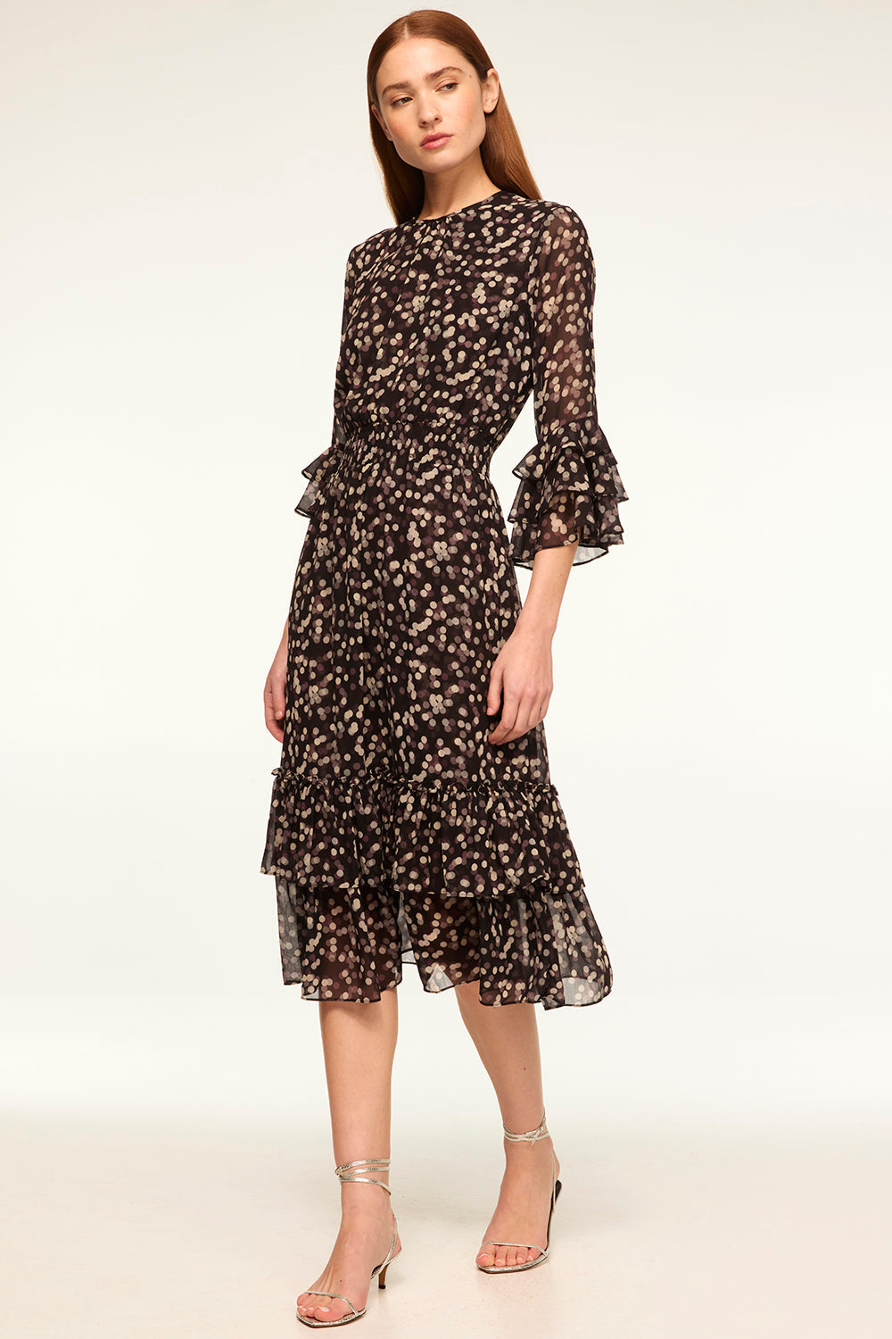 We brought back our best-selling silhouette. The Gordana dress is pure sophistication cut from a polka dot printed chiffon. The back features a keyhole with button closure. Three-quarter semi-sheer sleeves are accented with a tiered ruffle detail at the cuffs. A covered elasticized waist flatters the figure and leads into a midi length skirt with a double ruffle hem. This versatile style seamlessly takes you from workdays to weeknights and weekend events.
