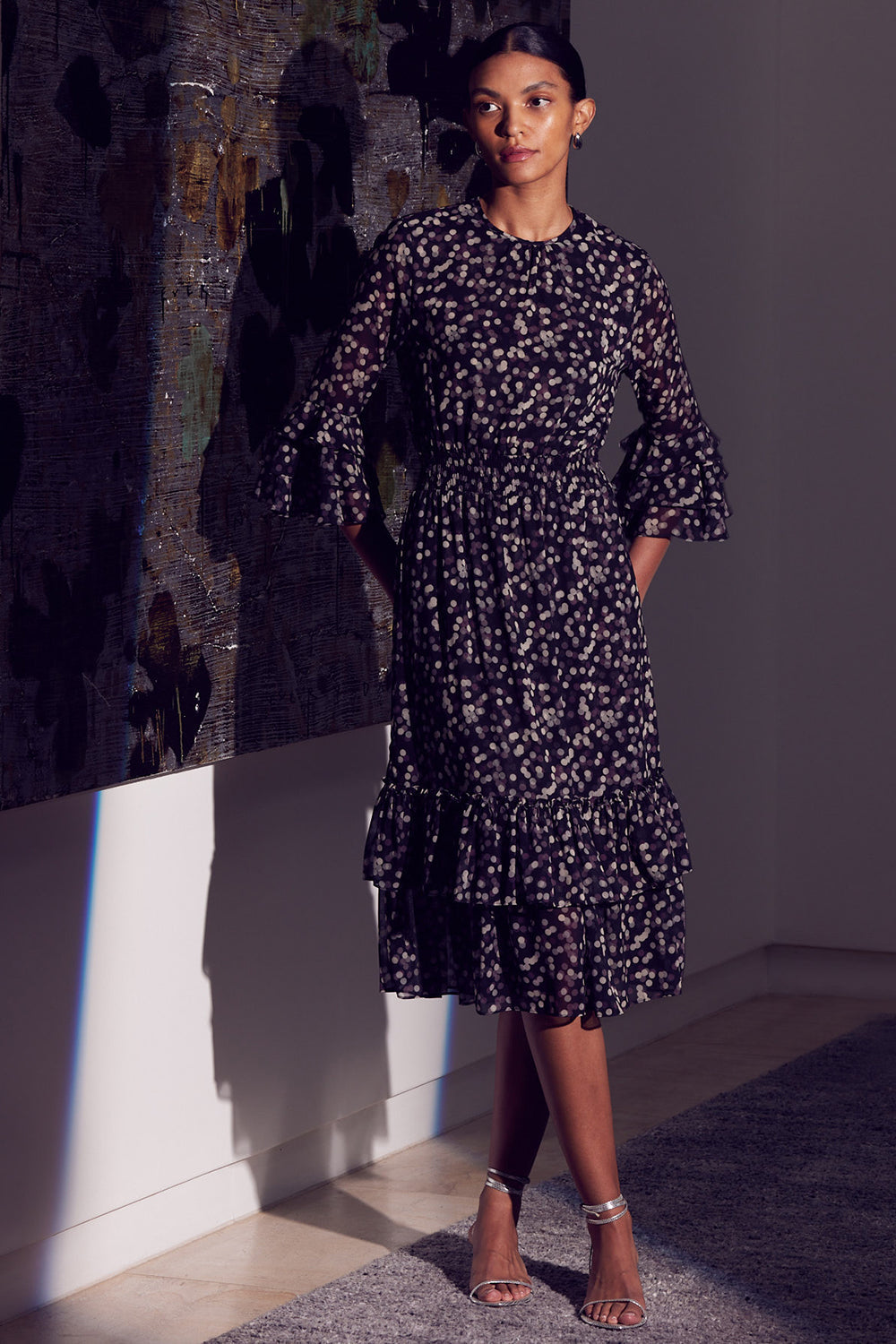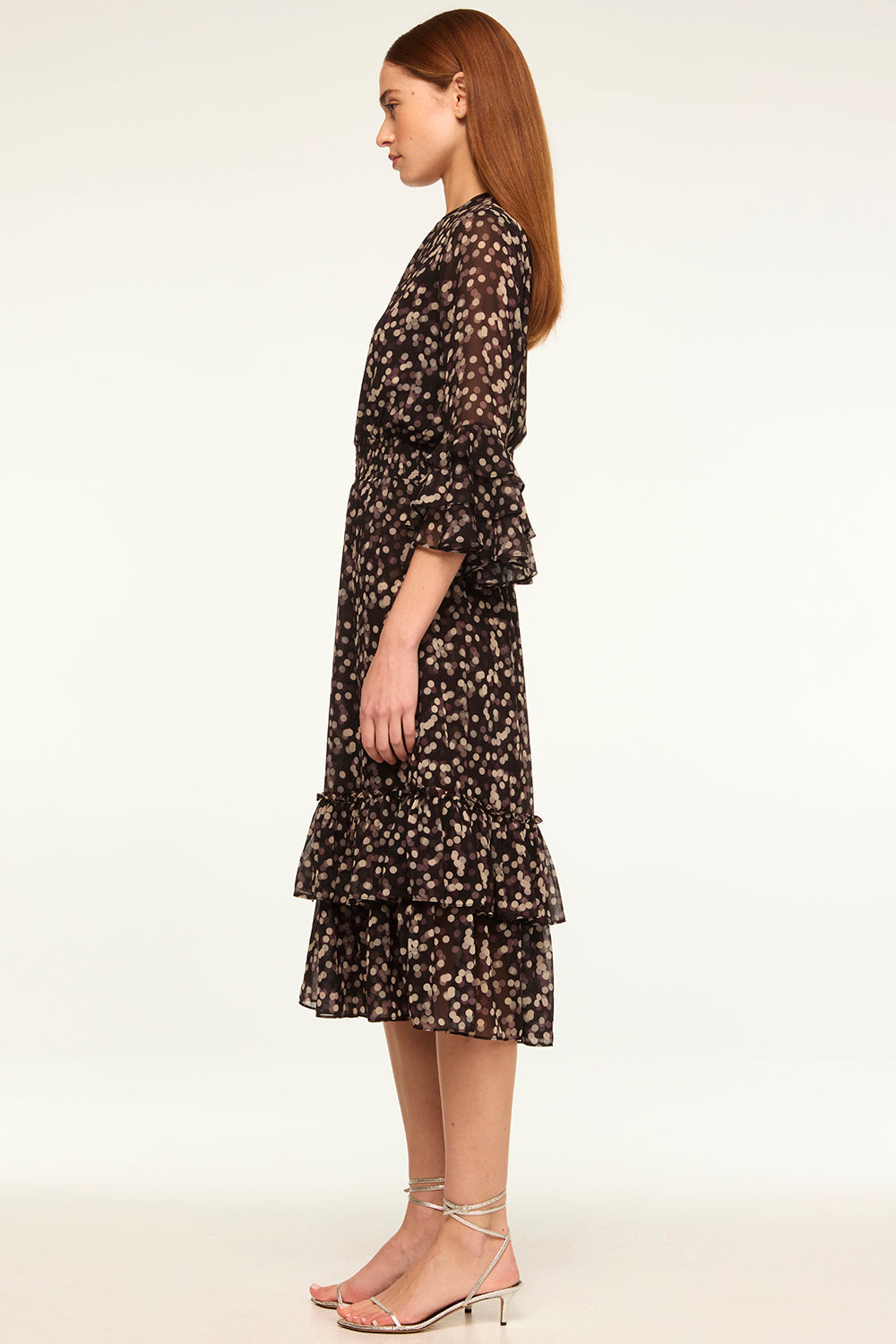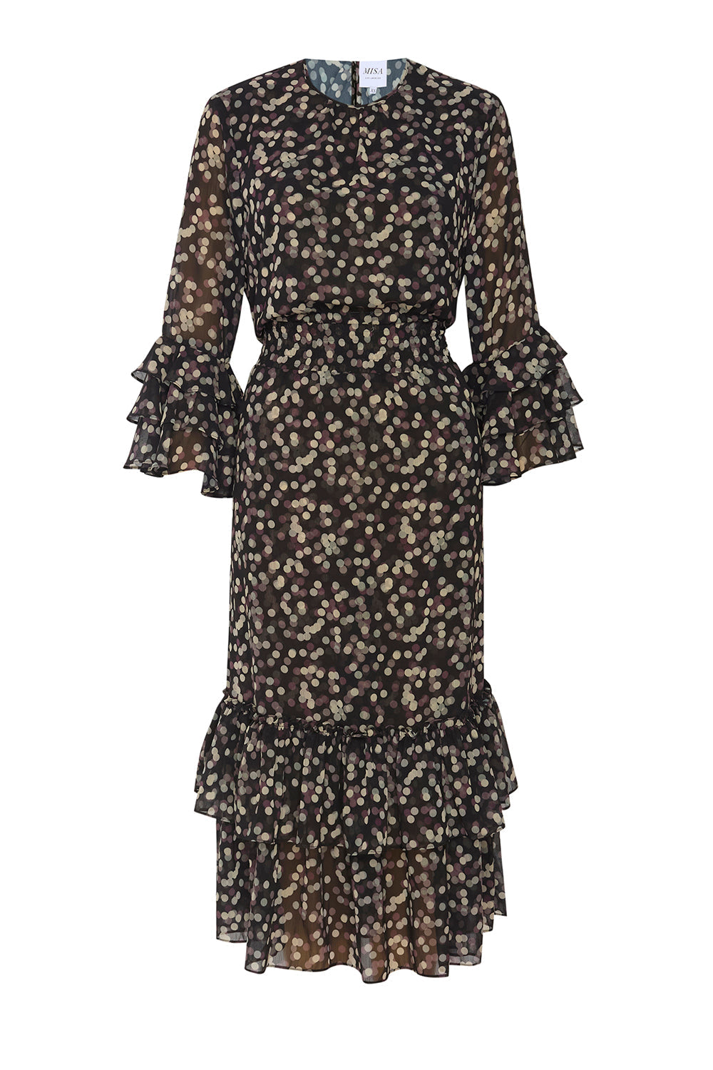 We brought back our best-selling silhouette. The Gordana dress is pure sophistication cut from a polka dot printed chiffon. The back features a keyhole with button closure. Three-quarter semi-sheer sleeves are accented with a tiered ruffle detail at the cuffs. A covered elasticized waist flatters the figure and leads into a midi length skirt with a double ruffle hem. This versatile style seamlessly takes you from workdays to weeknights and weekend events.