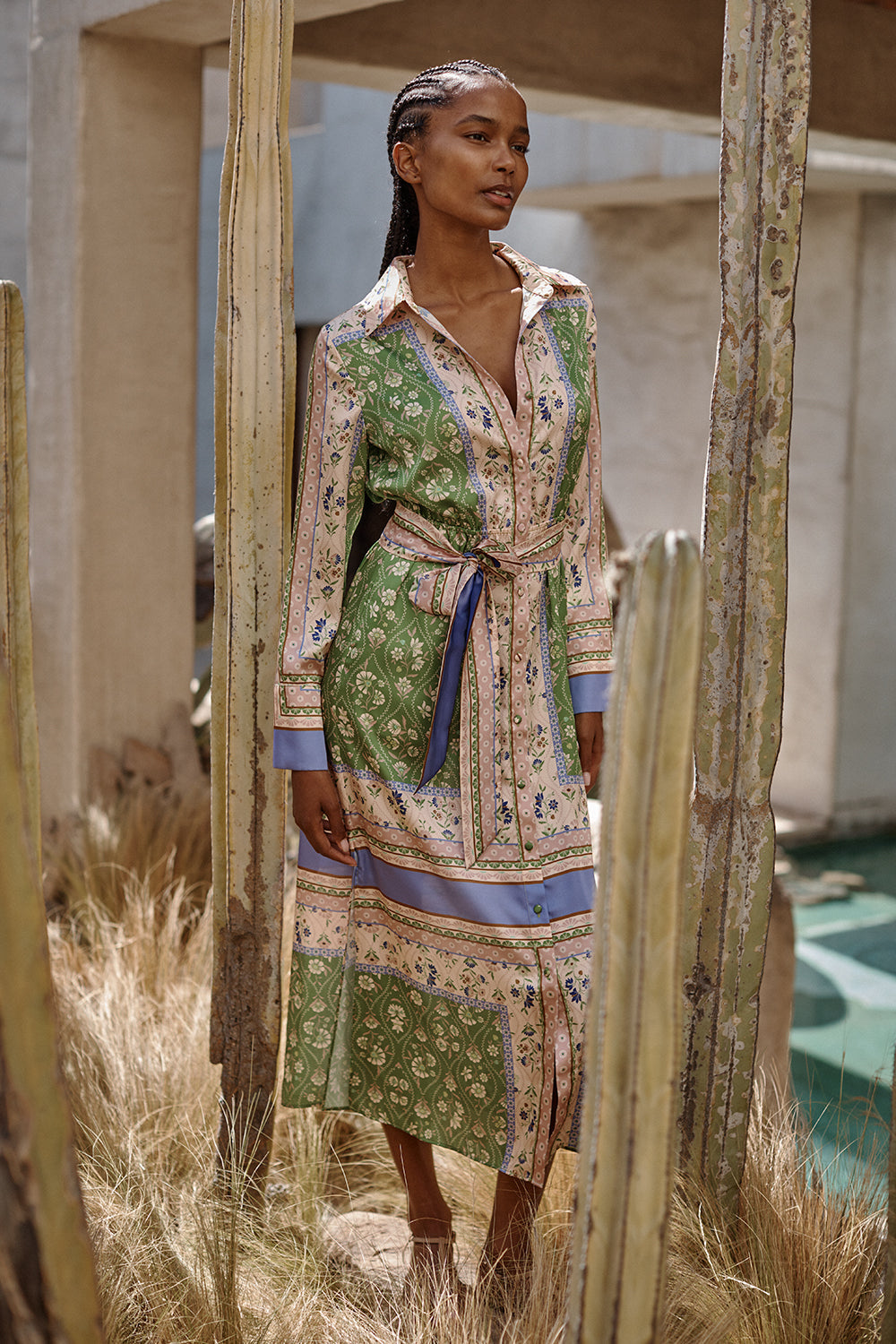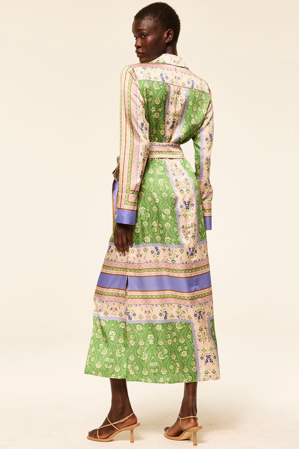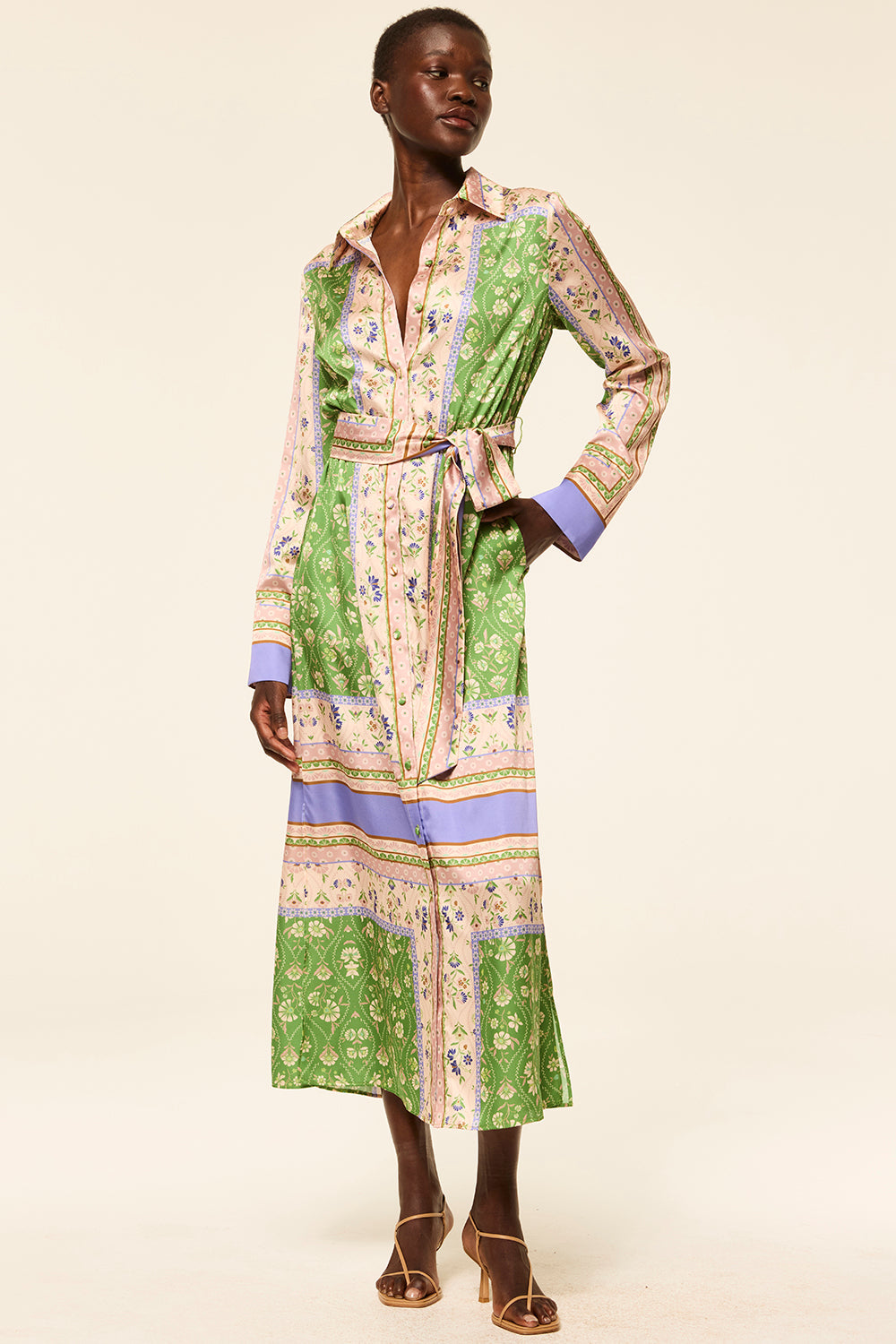 Griselda is an all new stunning shirtdress cut from an eye-catching Matcha Love printed satin. This chic long-sleeve, midi silhouette features a full button front closure, spread collar, yoked back and a self-tie sash belt. Thigh high double side slits. Dress down with flats or pair with heels for your next spring event.