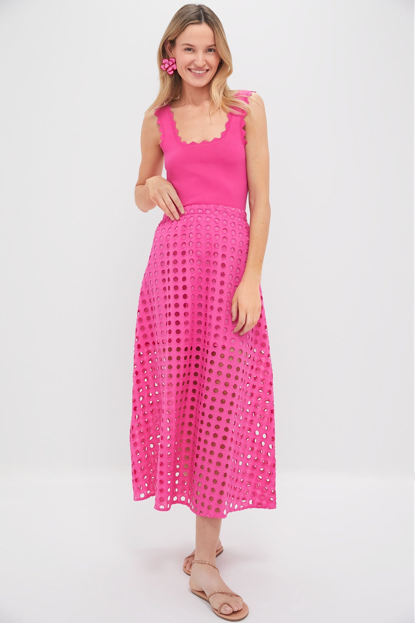 The Hot Pink Eve Skirt boasts a flattering A-line silhouette that flows effortlessly with every step. With a mini slip underneath, embroidered eyelet detailing and an elastic waistband, this chic maxi is ideal for warm-weather days, we are pairing this with a white tank and sneakers for strolling around town, or over a swimsuit and a raffia tote for a sunny day by the sea.