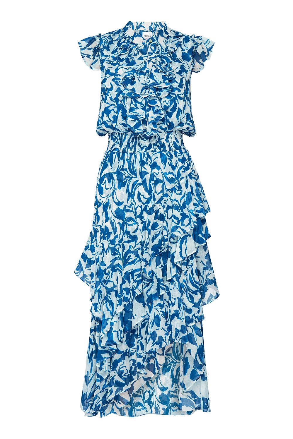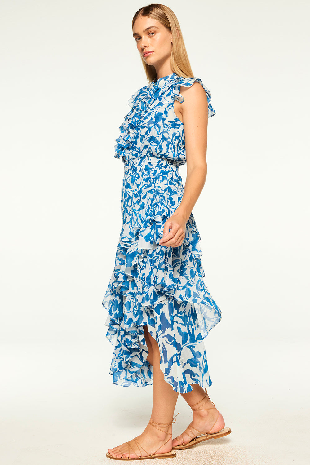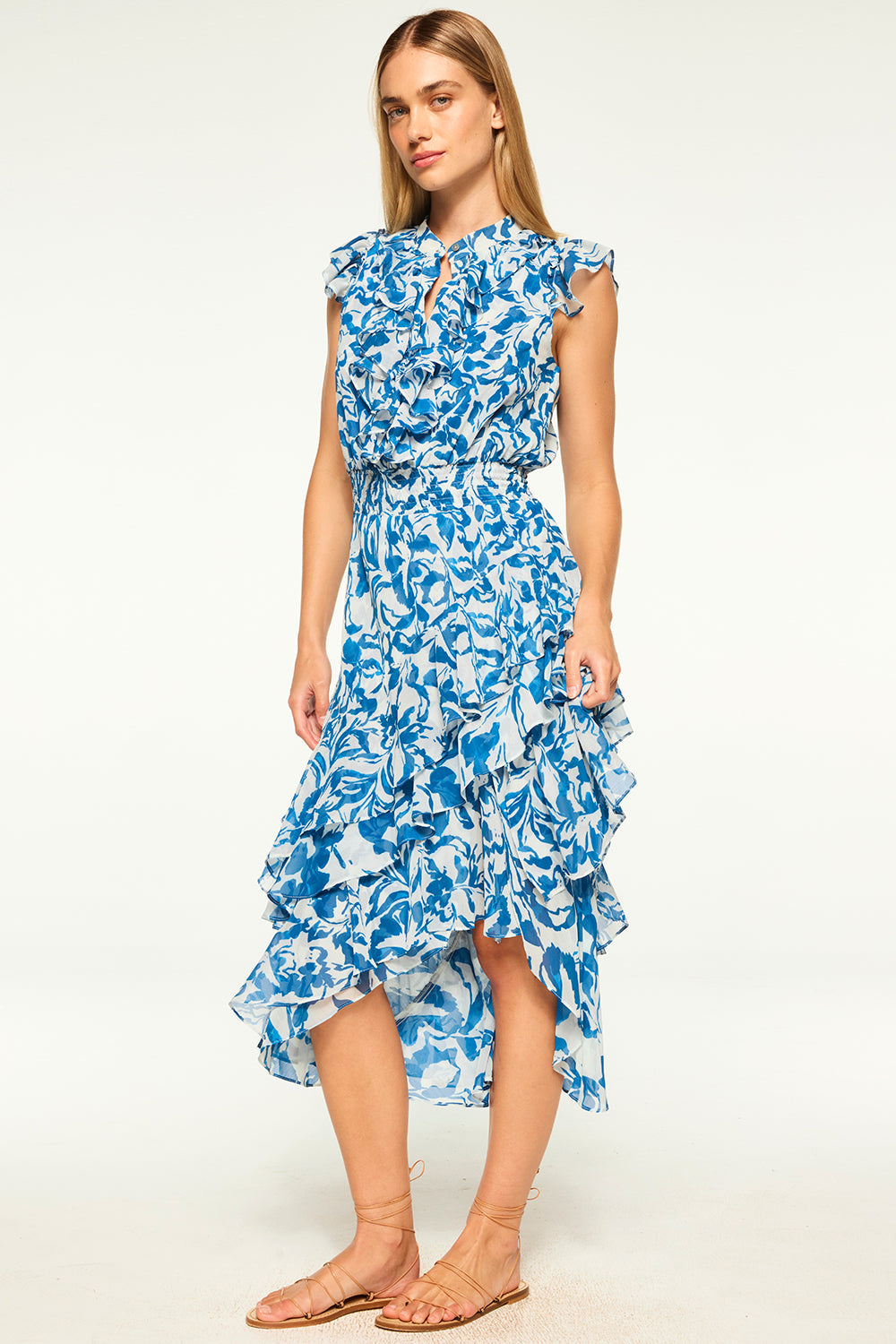 The Ilysa dress epitomizes effortless sophistication in a Blue Watercolor Mix print chiffon. Featuring ruffle-detailed cap sleeves to complement the ruffle trimmed placket with button closure. An elastic smocked waistband leads into a midi length asymmetric skirt with cascading ruffles and off-center side slit. This classic MISA silhouette will carry you through this season and beyond...