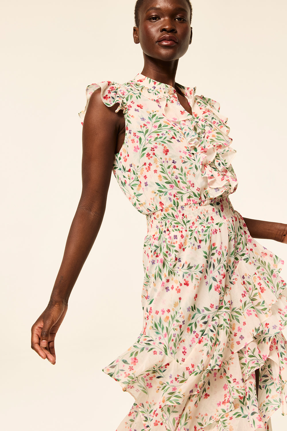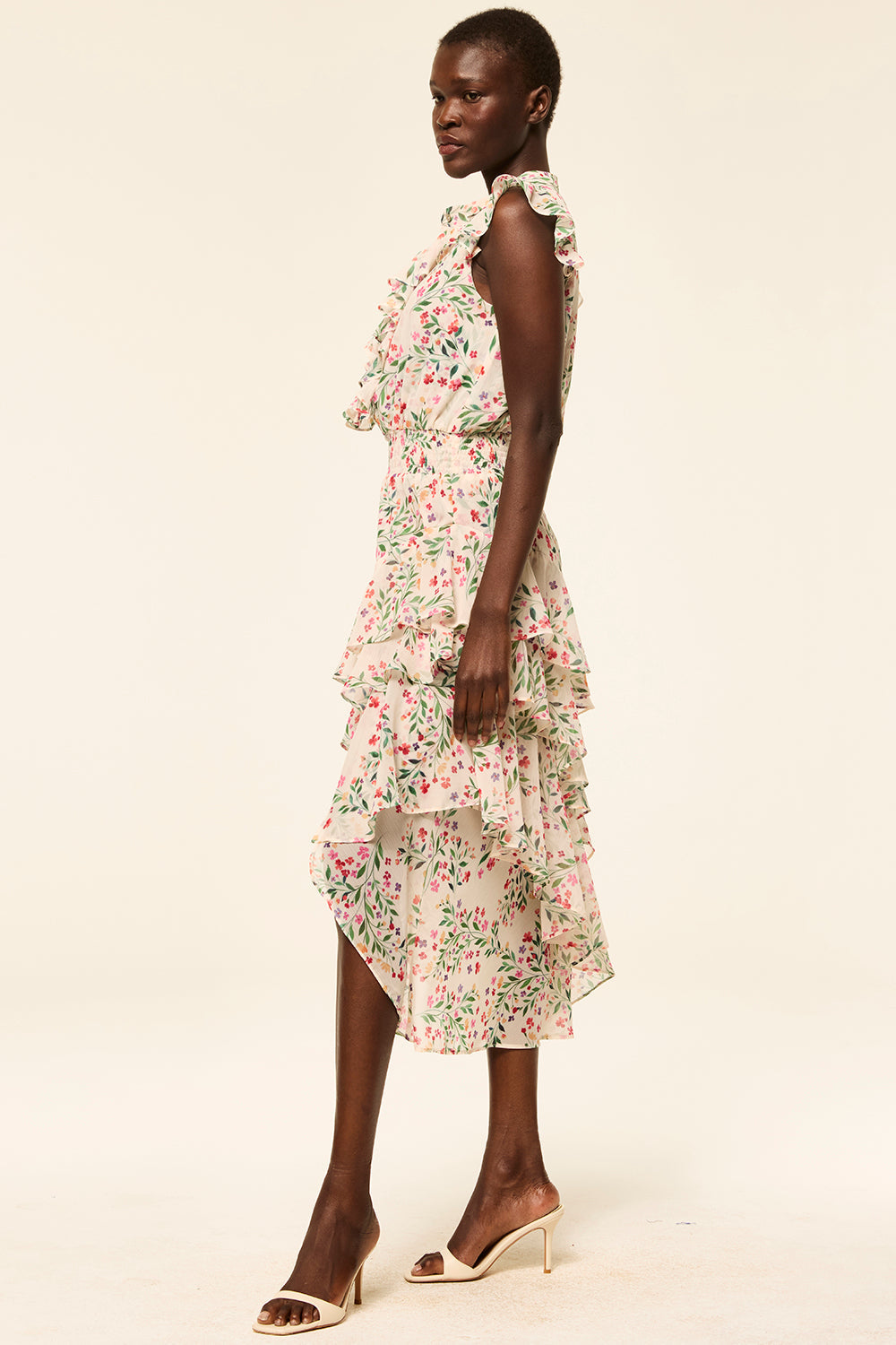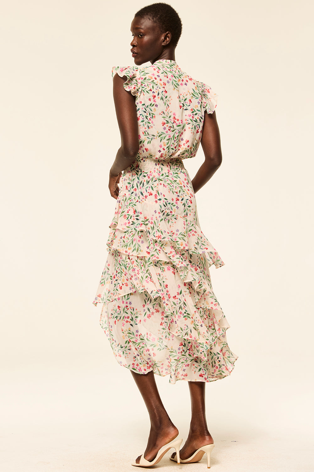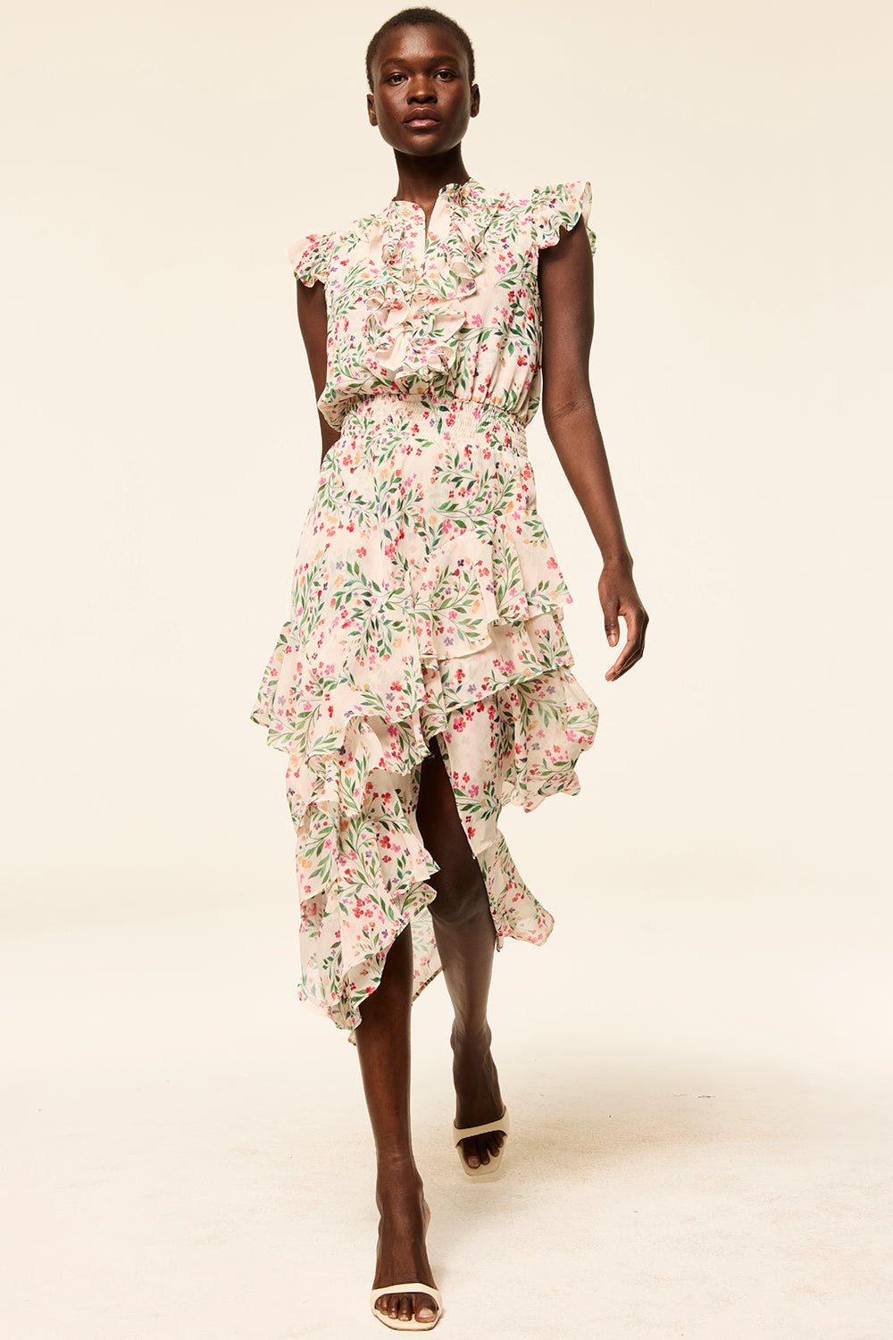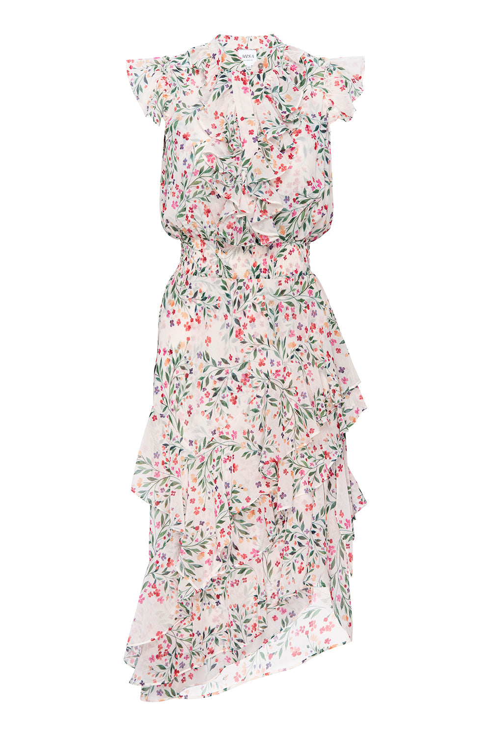 The Ilysa dress epitomizes effortless sophistication in a feminine Spring Ditsy print chiffon. Featuring ruffle-detailed cap sleeves to complement the ruffle trimmed placket with button closure. An elastic smocked waistband leads into a midi length asymmetric skirt with cascading ruffles and off-center side slit. This classic MISA silhouette will carry you through this season and beyond...