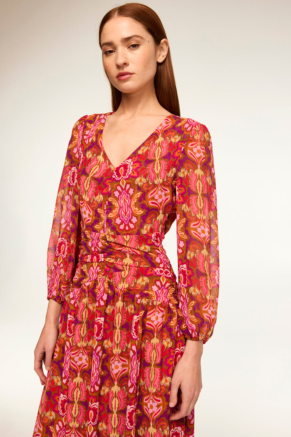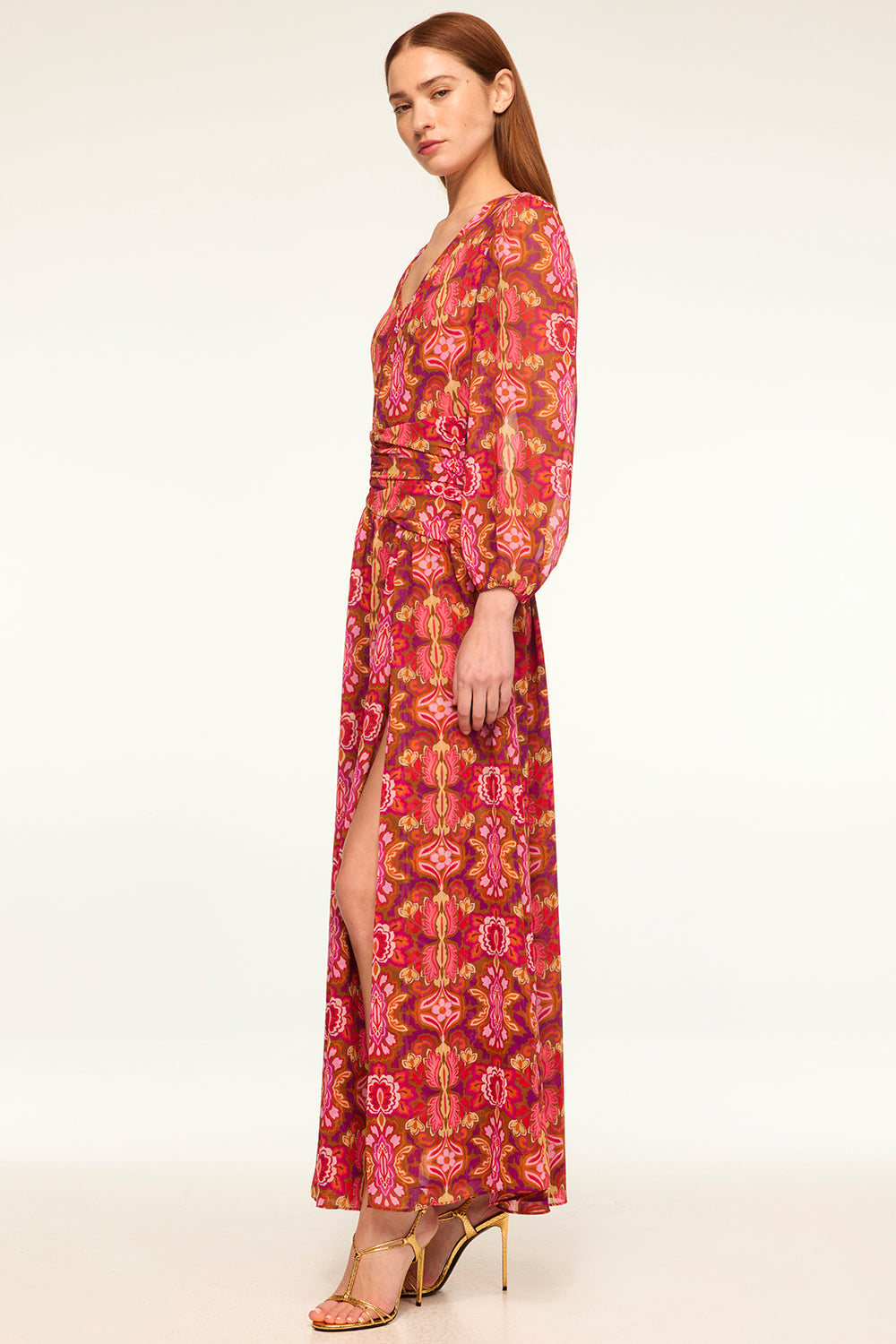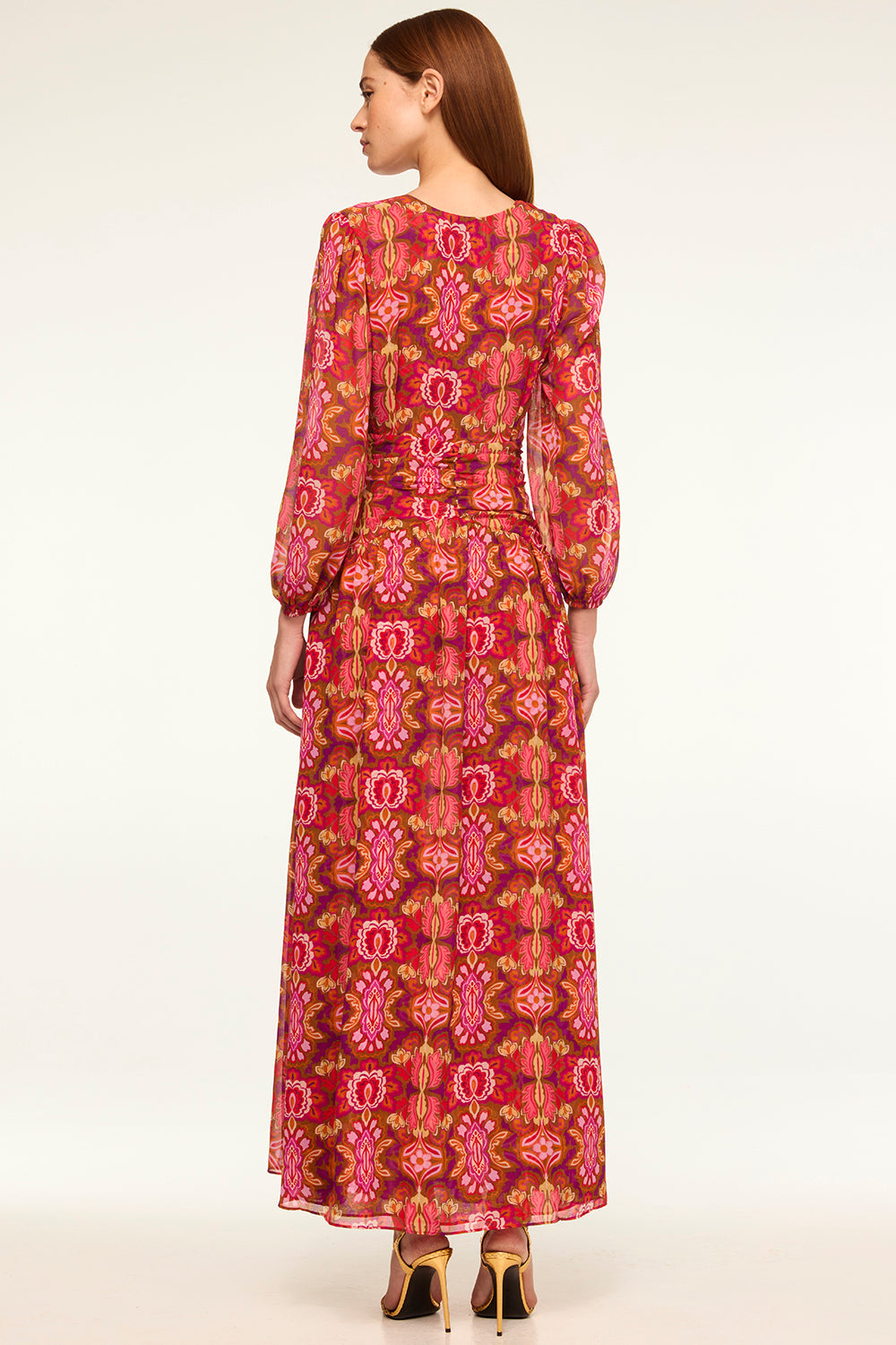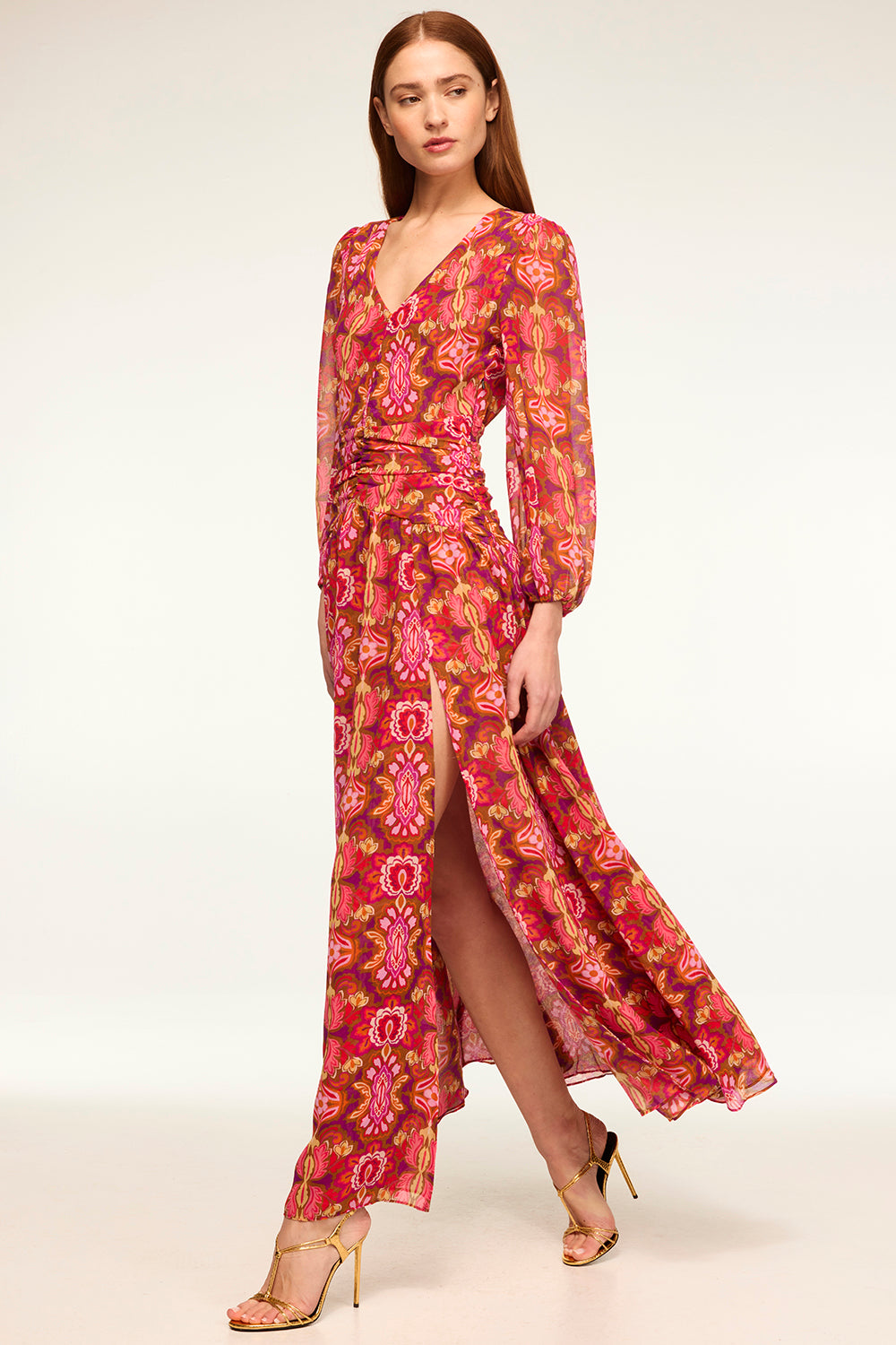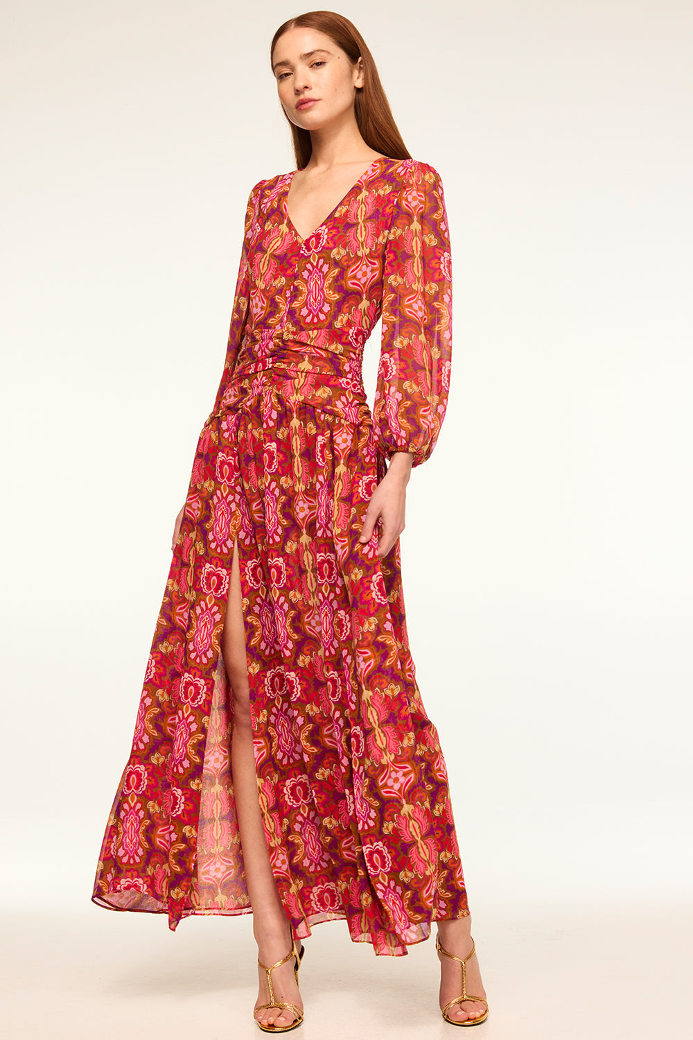 Embrace bohemian chic in our head-turning new maxi dress for all your special events and celebrations. Handcrafted from a bold Chic Nostalgic printed chiffon, Imelda is a feminine silhouette featuring a v neckline, gathered waist, long blouson sleeves, hidden side zipper closure and double leg slits.