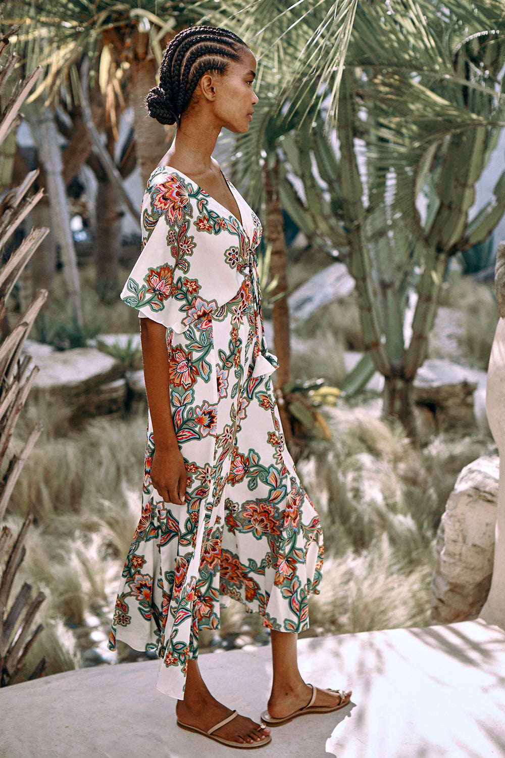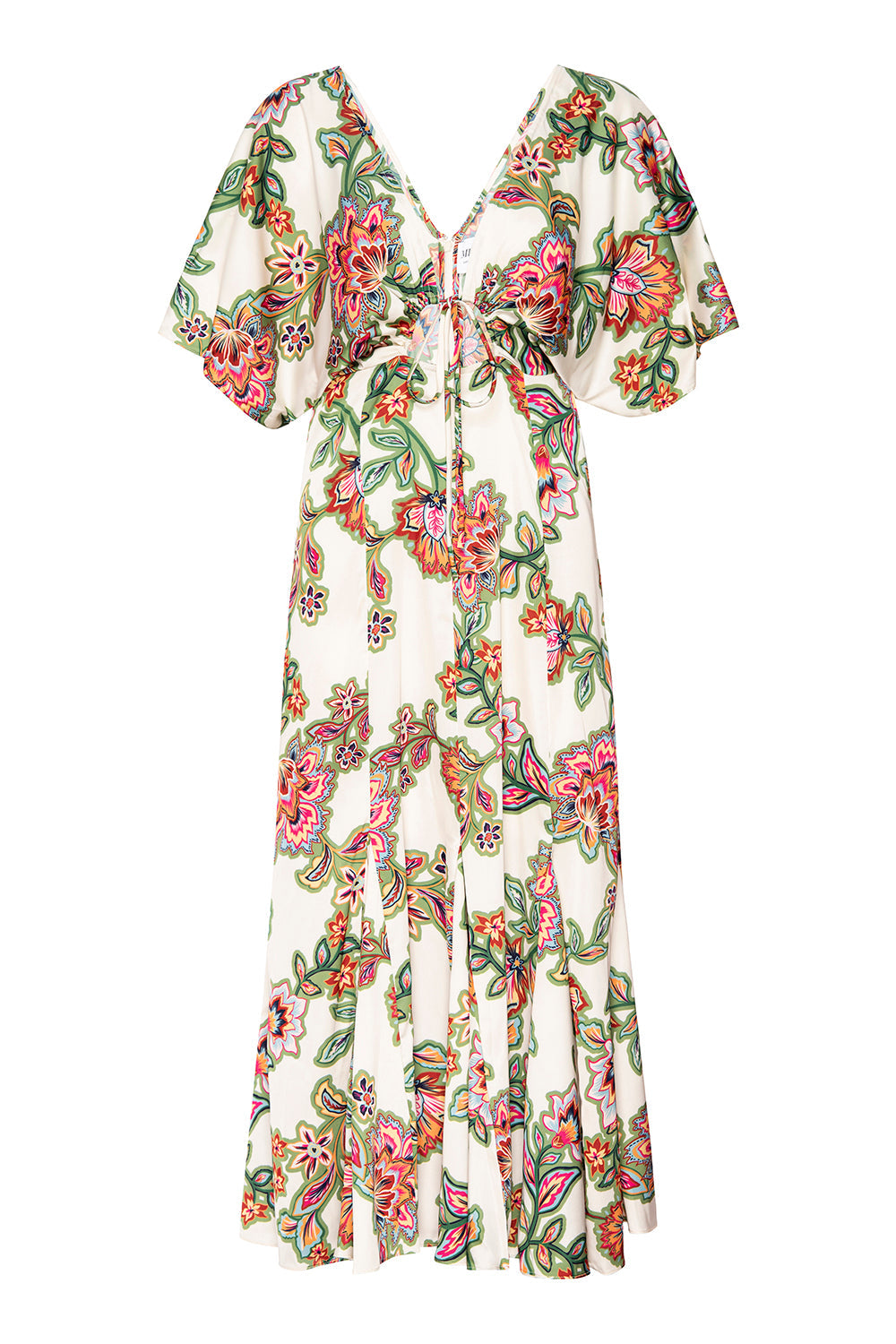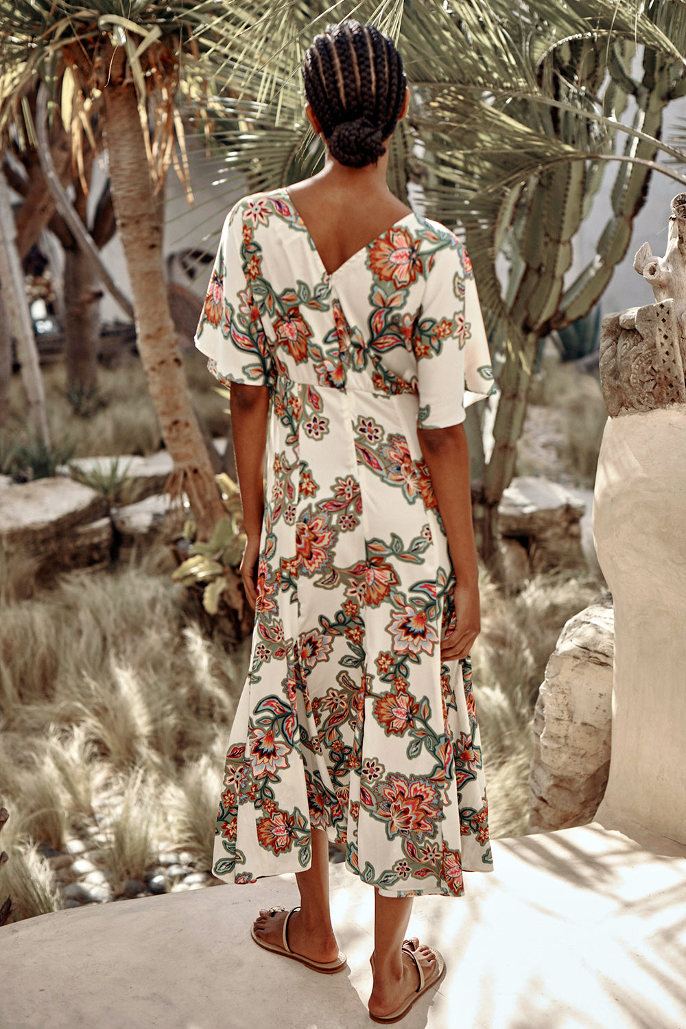 Irena is a flattering ankle-grazing silhouette cut from our Floral Lattice–printed satin. It features a deep V-neckline with a keyhole opening, finished with adjustable petal ties. Wide, short kimono-style sleeves and a hidden zip add to the effortless ease. The fitted skirt flows into a swingy, fluted hem. Style with strappy heels for an elegant occasion or flats for an elevated daytime look.