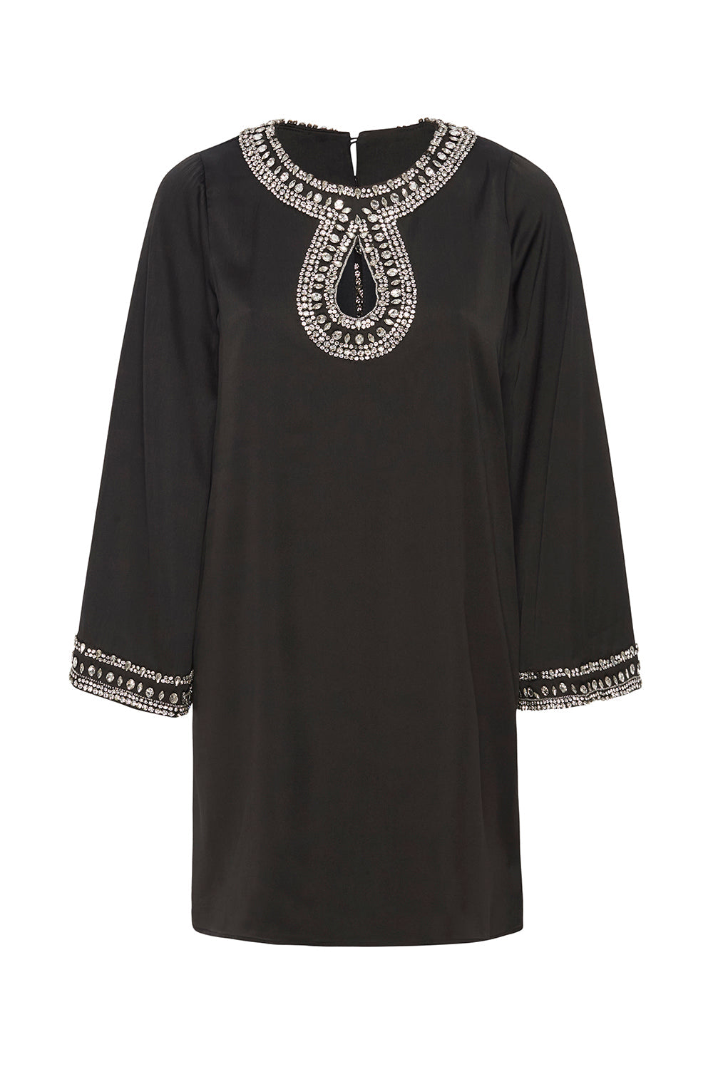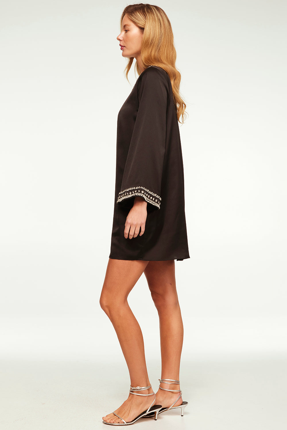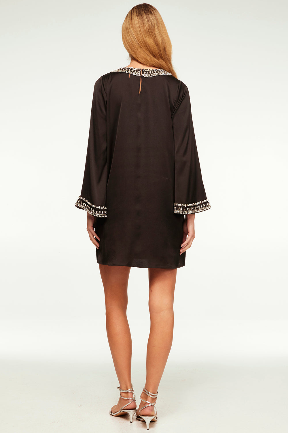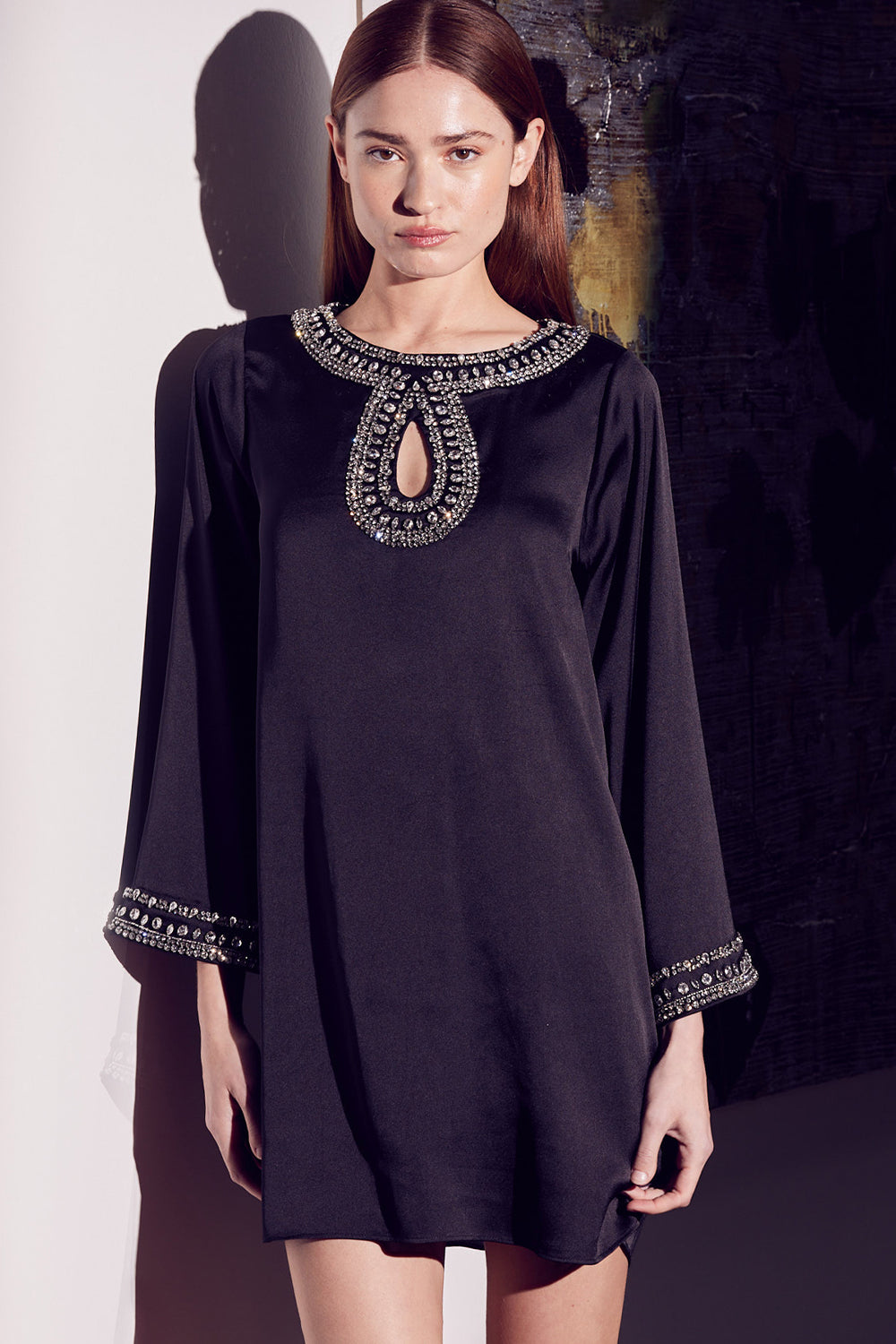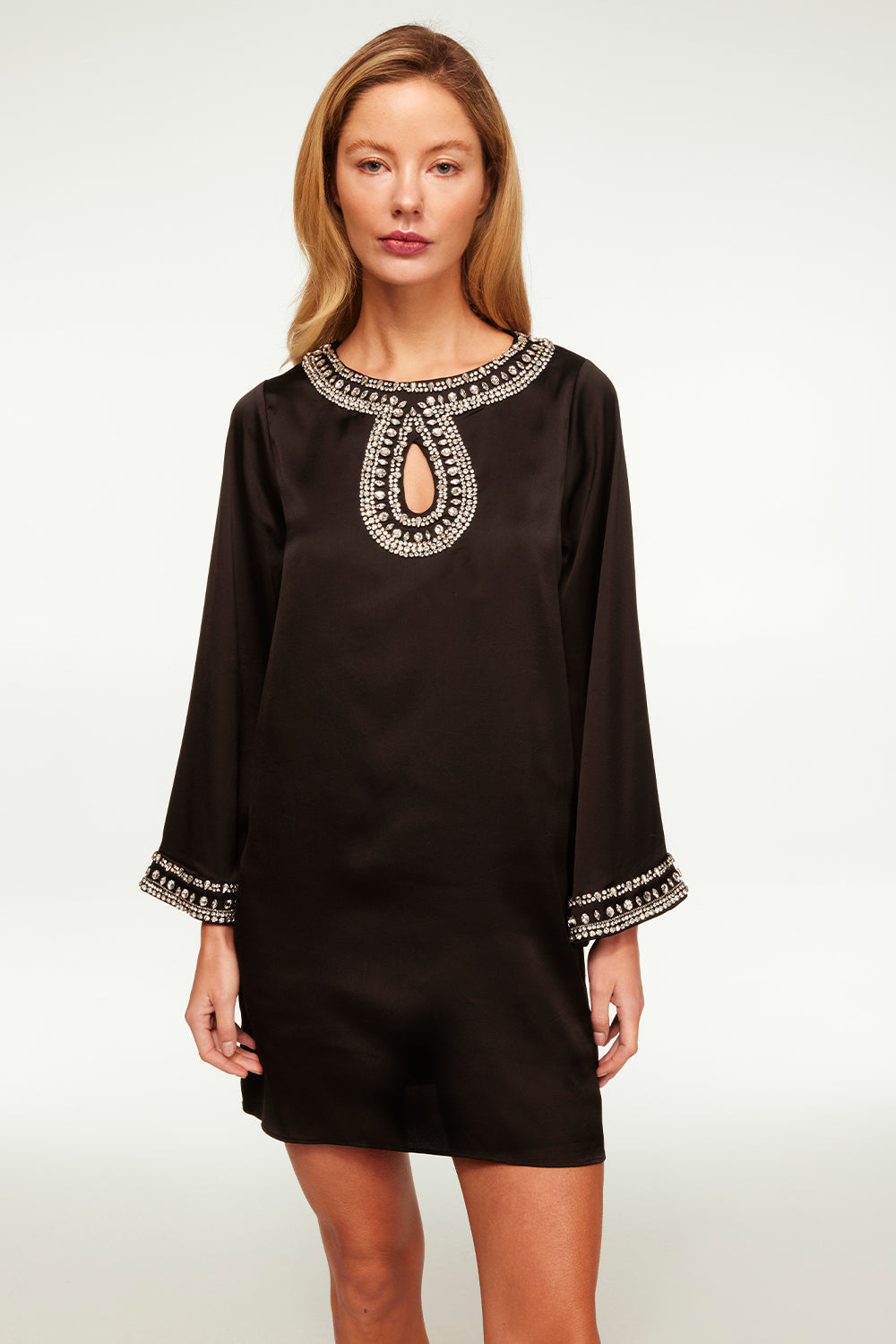Stun all holiday season in our new Ivy mini dress cut from a silky black satin finished with crystal-embellished trim. This mod-inspired style features a round neckline and front teardrop cutout with long flared sleeves finished with the same crystals and an optional self-tie belt. This a-line silhouette is double lined with a back hook and eye closure. Wear with shimmering heels for your next holiday soirée.