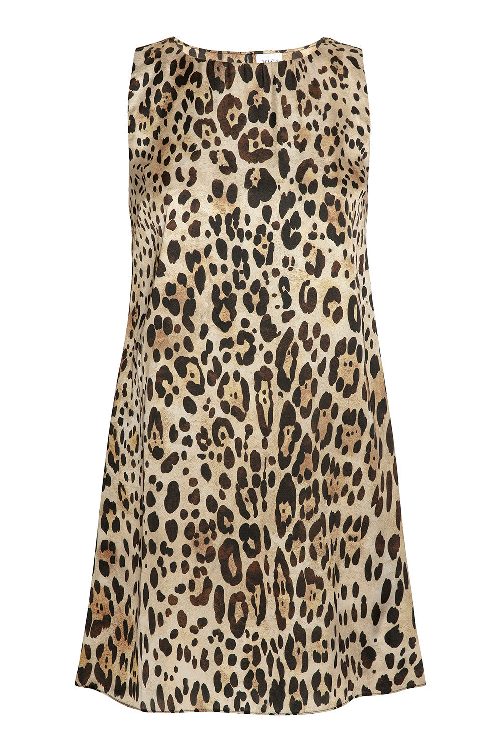 Jonah is a chic shift dress in a timeless Leopard printed satin. This mini silhouette is sleeveless with a high neckline and keyhole button-back closure. Pair with flats or dress up with heels, for a classic, versatile style.