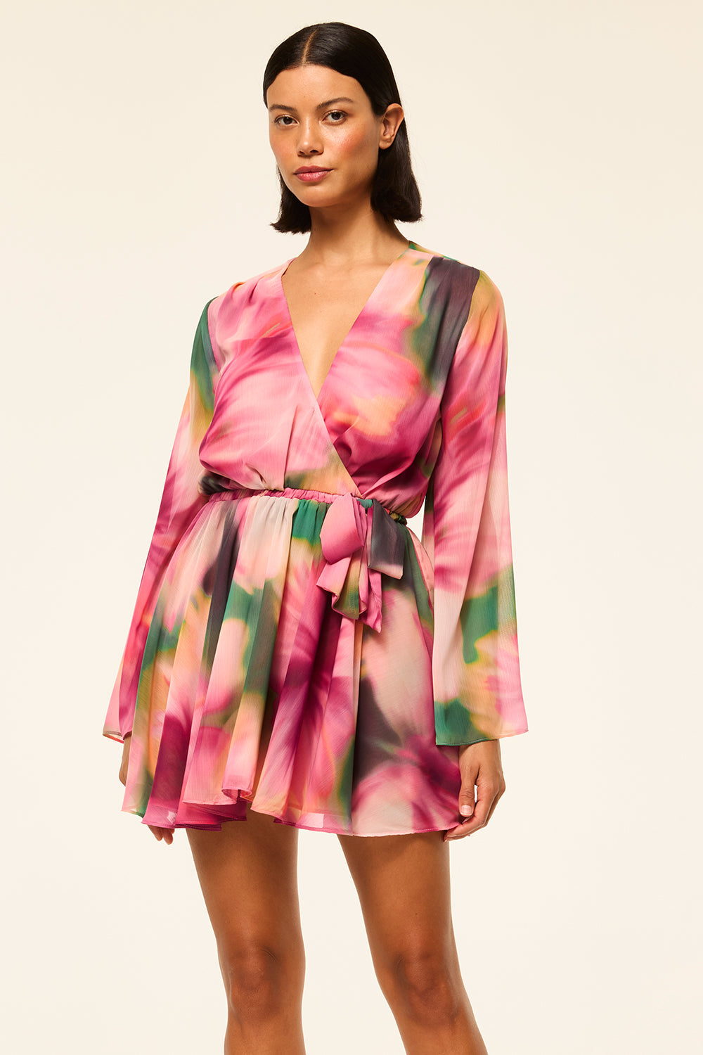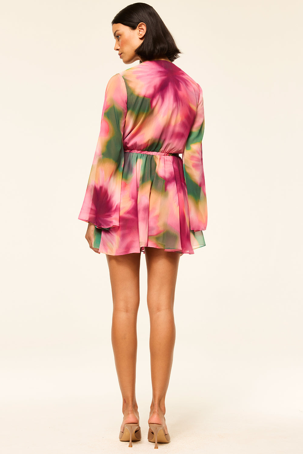Our most-loved Kaia is updated for spring in a vibrant Blurred Hibiscus print chiffon. This chic bohemian inspired mini dress includes a plunging v-neckline, bell sleeves, a flared skirt and an elastic waistband with a sewn-in-front bow accent. This standout silhouette is the perfect piece for this season and beyond.