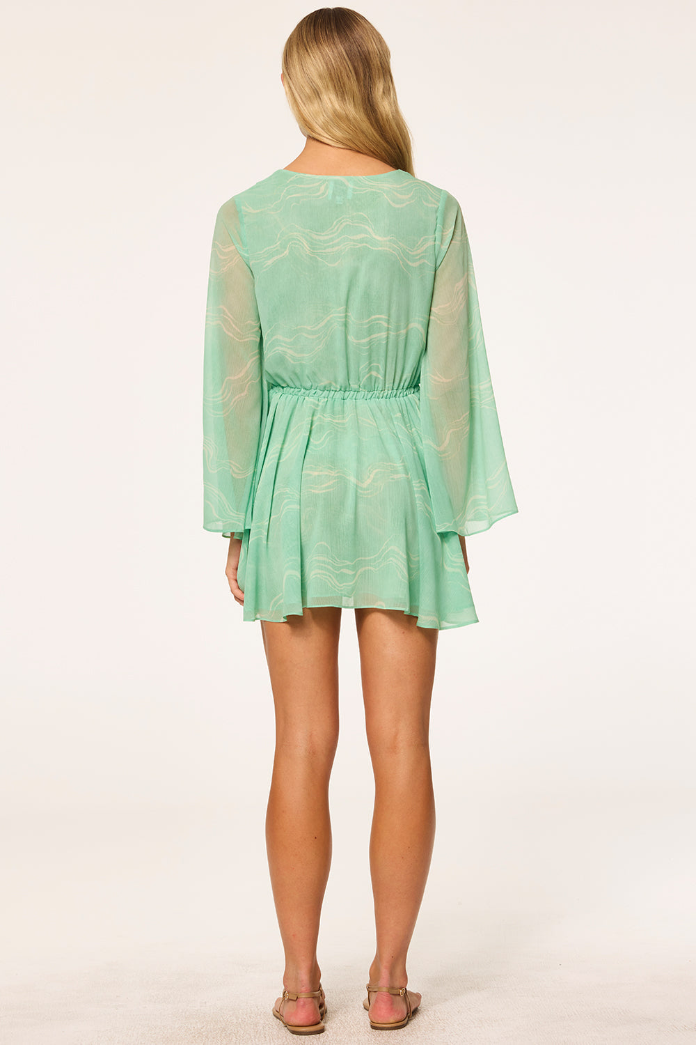Our most-loved Kaia returns in a fresh Seafoam Wave print chiffon, perfect for summer. This bohemian-inspired mini features a plunging V-neckline, airy bell sleeves, a flared skirt, and an elastic waistband finished with a sewn-in bow at the front. A standout silhouette with effortless charm—ideal for sunny days and warm nights.