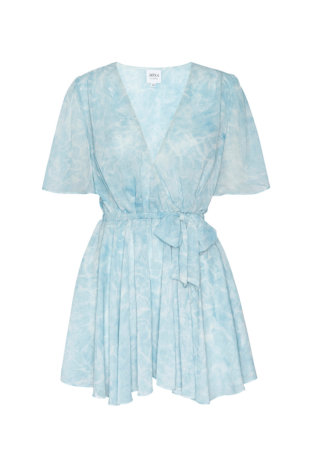 Kaila is a fresh mini silhouette cut from airy Acqua Blue chiffon. This faux wrap style features a cross V-neckline, short sheer sleeves, and a fixed bow detail set slightly off-center at the elasticated waist. A lined, flowy skirt falls to an asymmetrical hem, adding soft movement to this effortlessly charming style—perfect for warm days or casual celebrations.