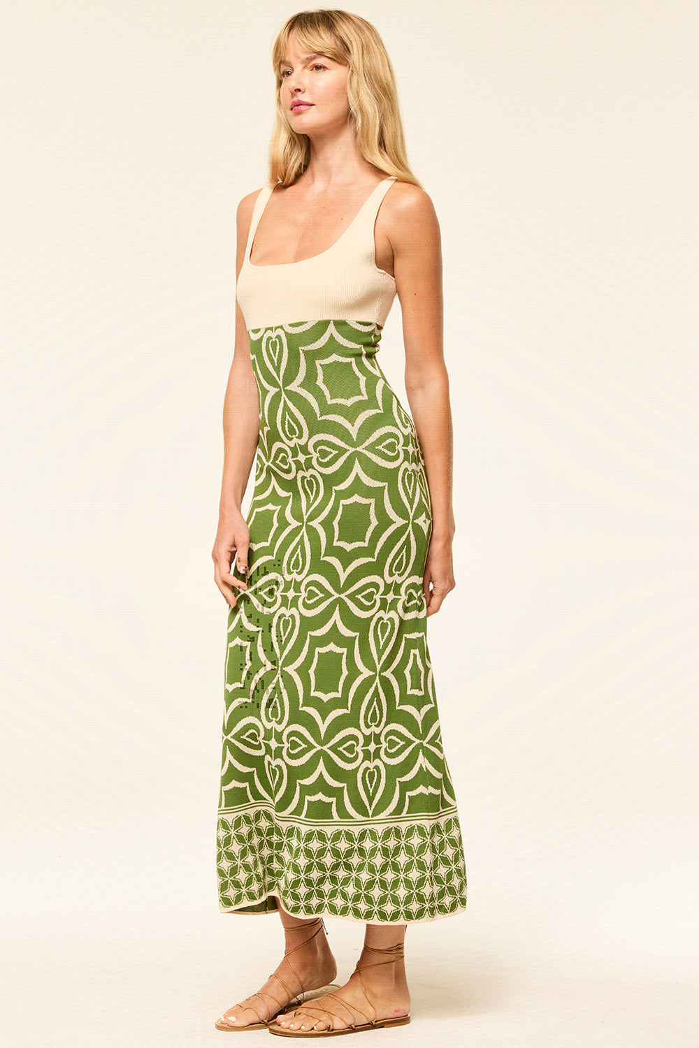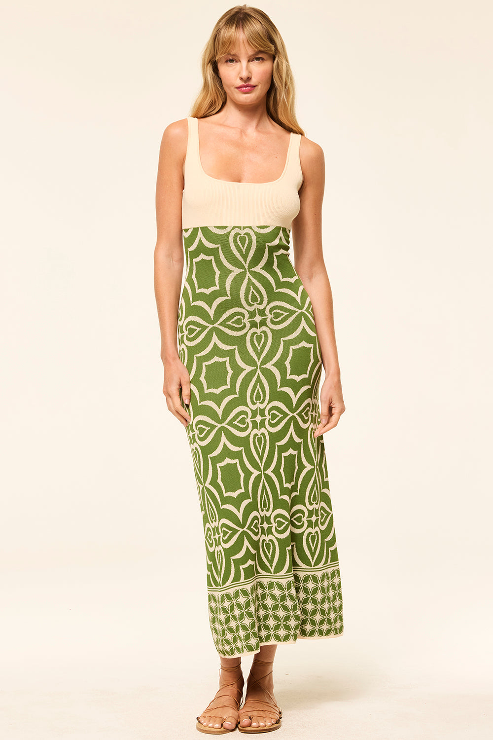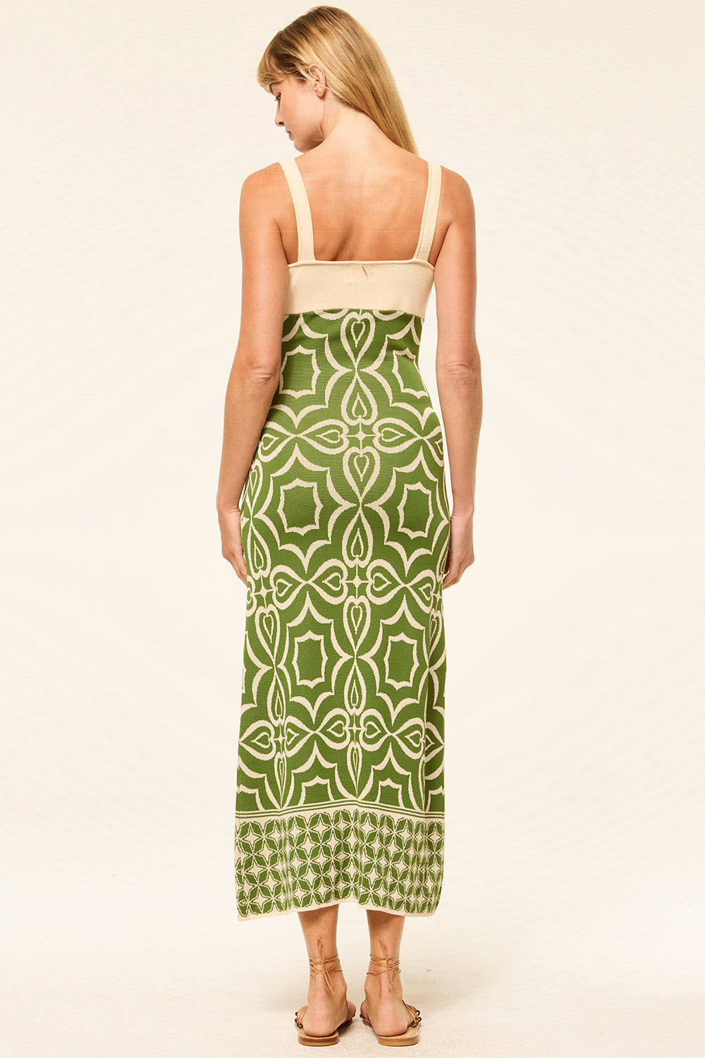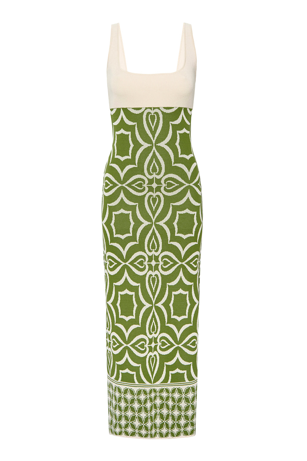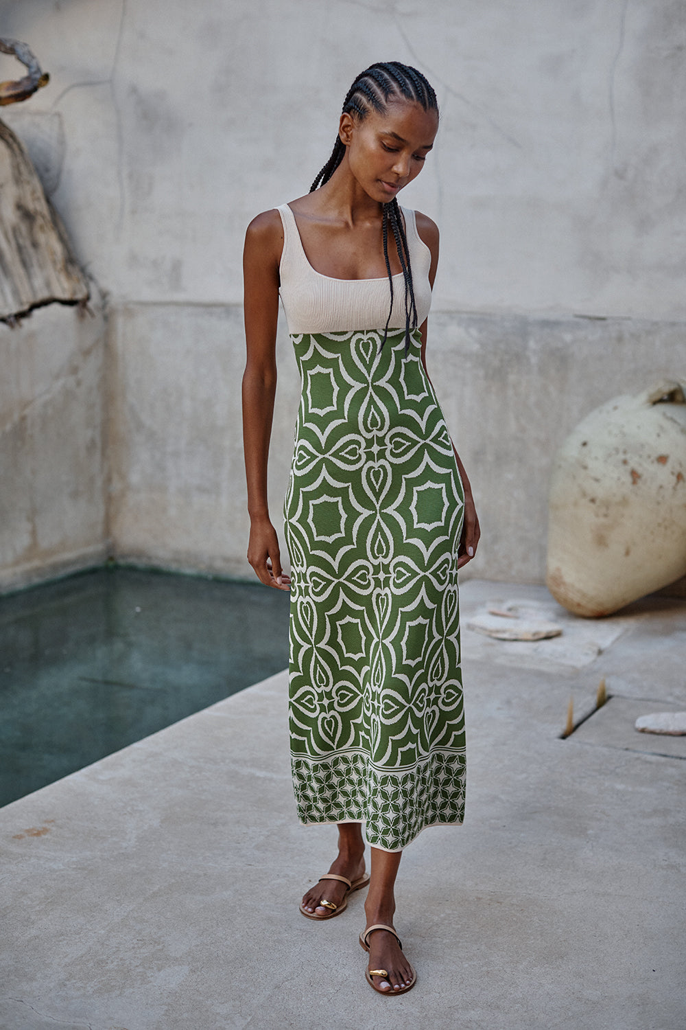 Our Kalil knit dress is a maxi length fitted silhouette in green and ivory mosaic tile print knit jacquard. Sleeveless with thin straps and a square neckline and back. Pull-on style with a ribbed bodice.