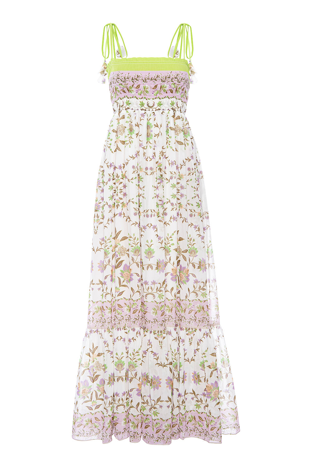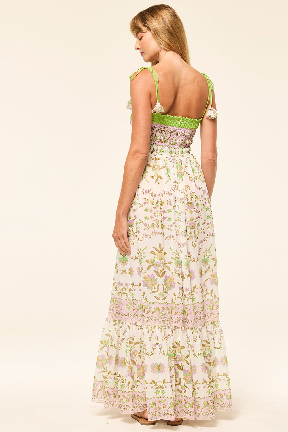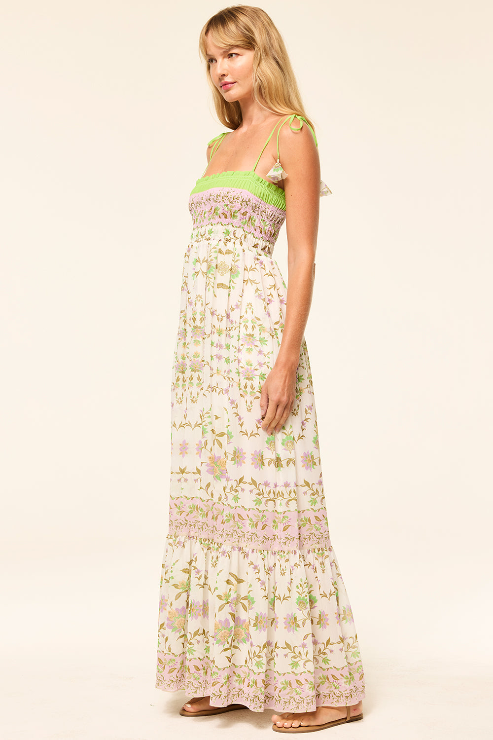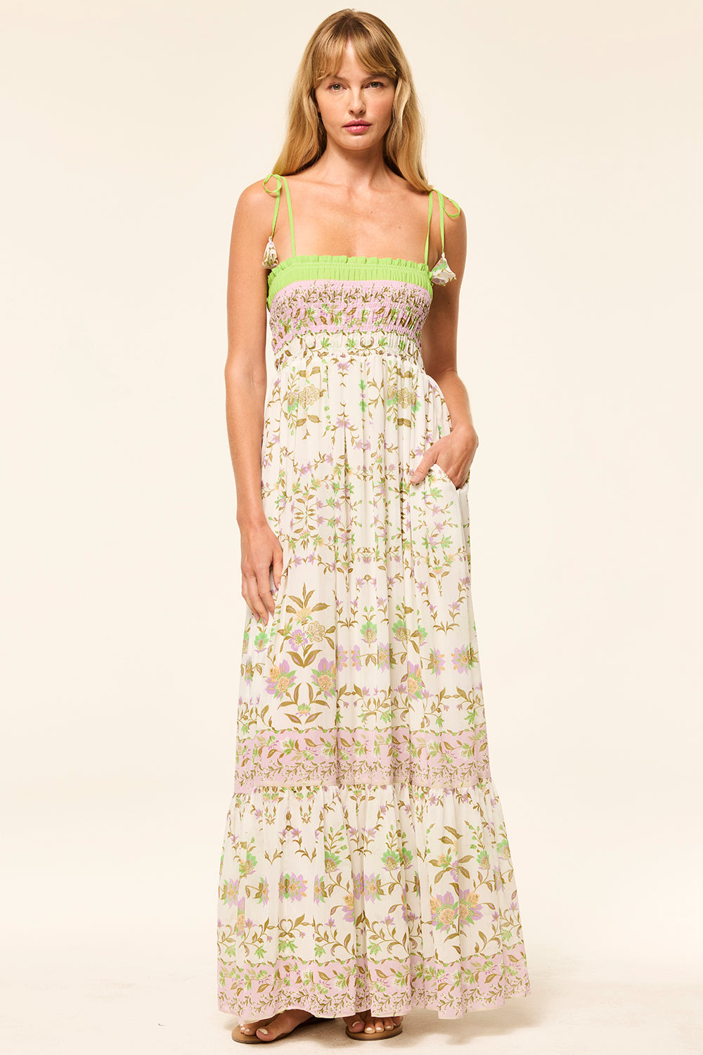 Katie is an effortless maxi dress to carry you through spring and beyond. Cut from a fresh Secret Garden printed chiffon, this sweet silhouette features a fully smocked bodice and thing spaghetti straps that tie at the shoulder. A flowing skirt with double side-slit pockets