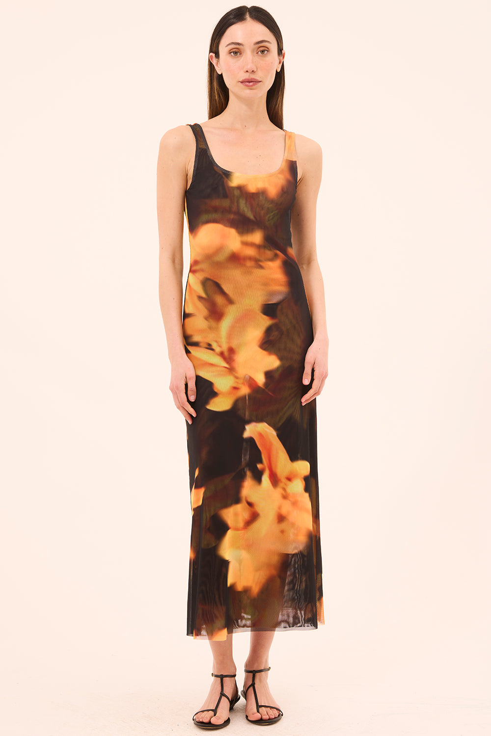 The Khloe dress is a sleek, semi-sheer maxi silhouette crafted from double-lined mesh in an eye-catching Yellow Flora print on black ground. Featuring a flattering scoop neckline and slim straps, this bodycon style is designed to contour the figure while offering a comfortable stretch. Effortlessly versatile, it's a standout piece that transitions seamlessly from day to night.
