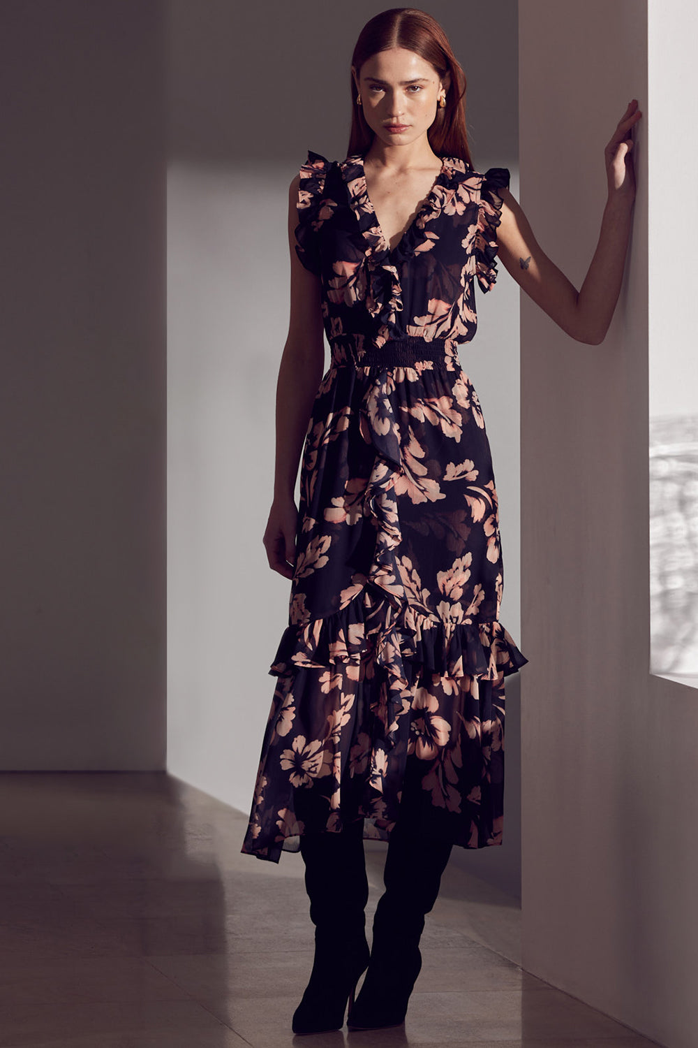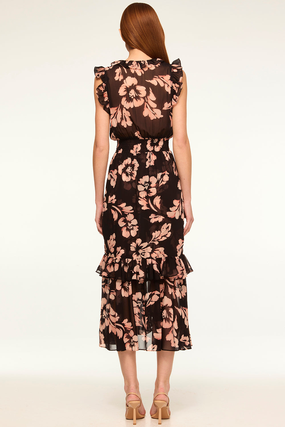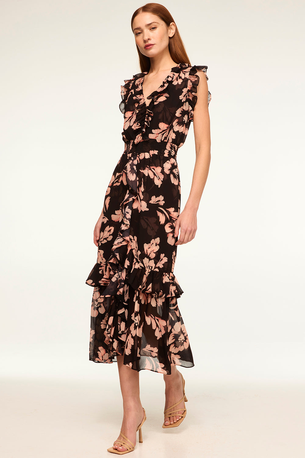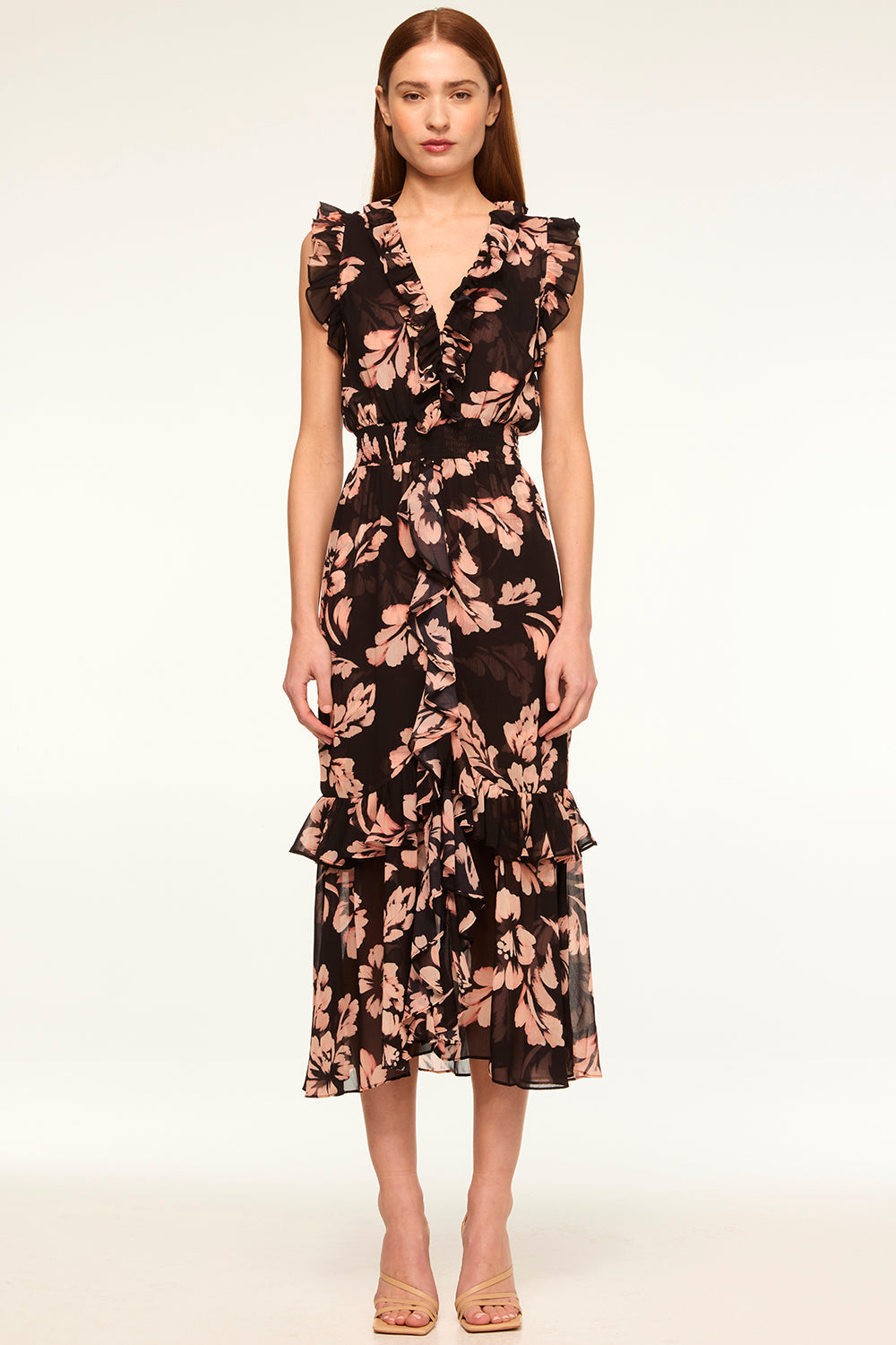 A chic update for your wardrobe, our best-selling Kidada is a gorgeous Auric Flora printed chiffon midi dress with stunning ruffles. The perfect many-moment dress featuring a v-neckline, hidden hook and eye closure with a ruffle trim that compliments the sweet ruffle detail at the shoulders. A flattering smocked waistband leads into a cascade ruffle trimmed skirt.