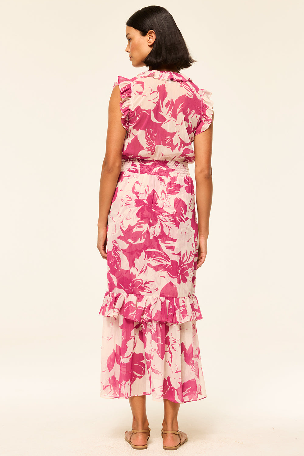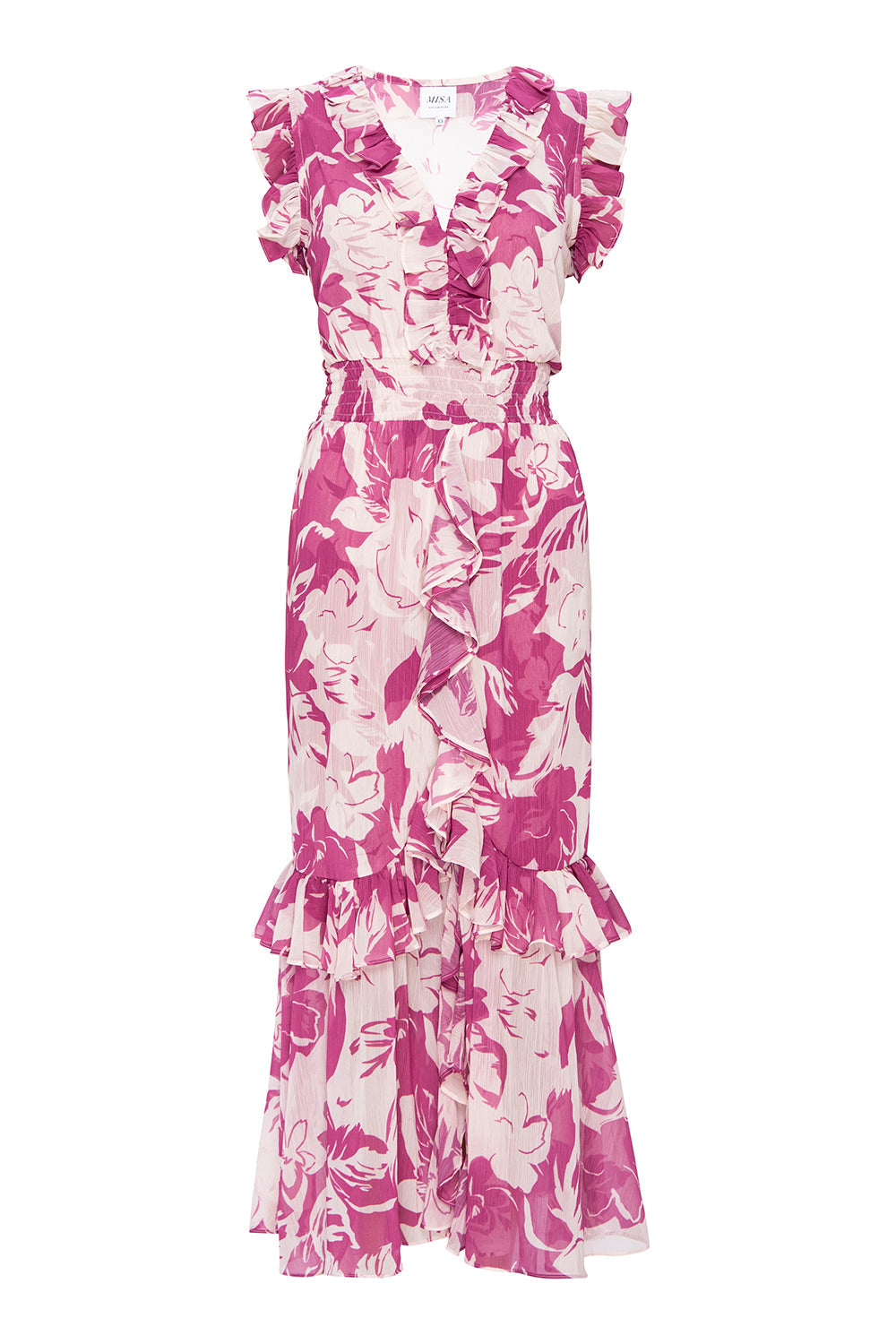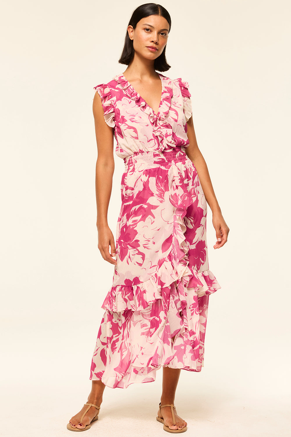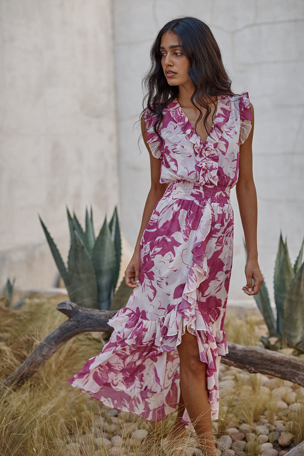 A chic update for your wardrobe, our best-selling Kidada is cut from a gorgeous Fuchsia Flora printed chiffon midi dress with stunning ruffles. The perfect many-moment dress featuring a v-neckline, hidden hook and eye closure with a ruffle trim that compliments the sweet ruffle detail at the shoulders. A flattering smocked waistband leads into a cascade ruffle trimmed skirt.
