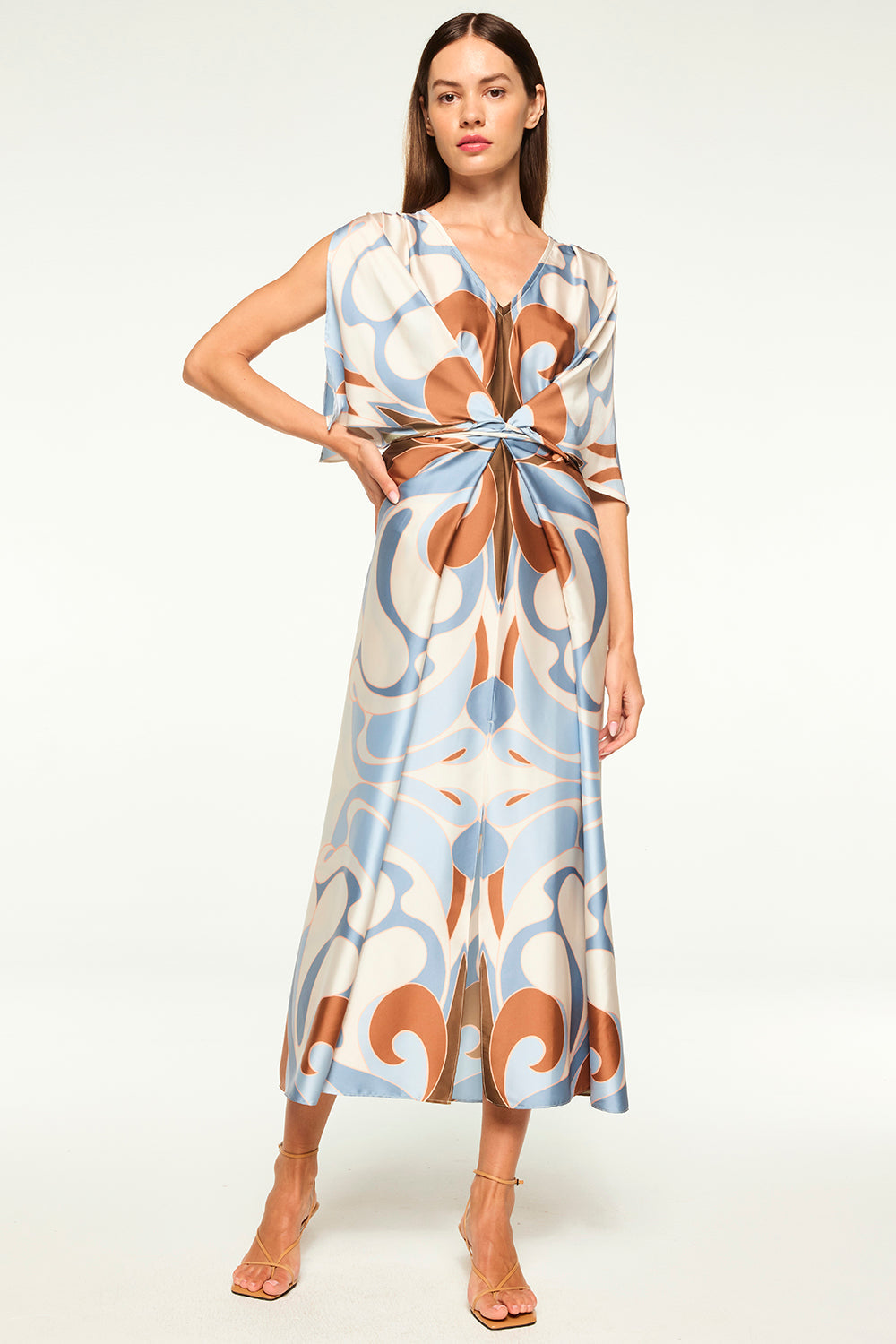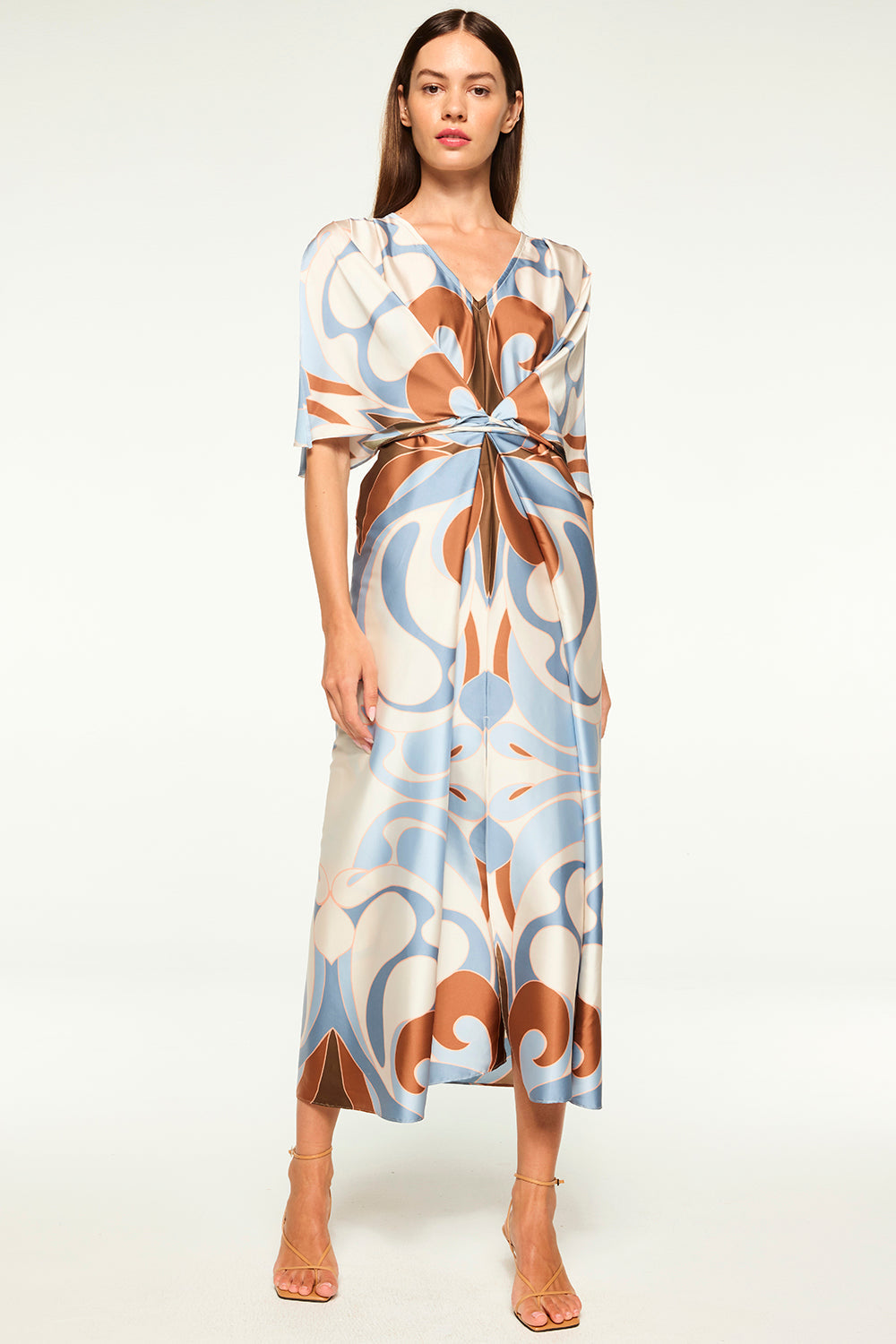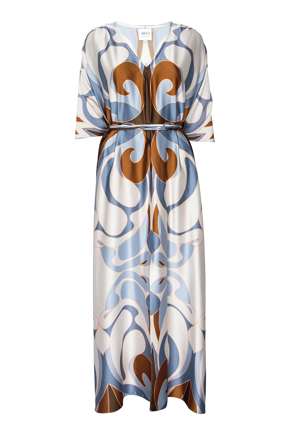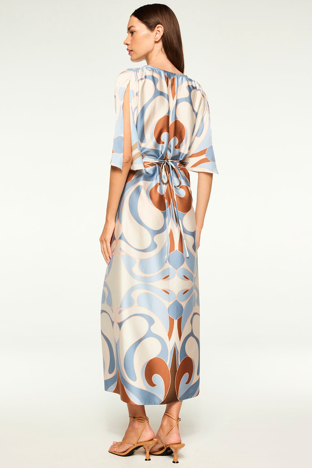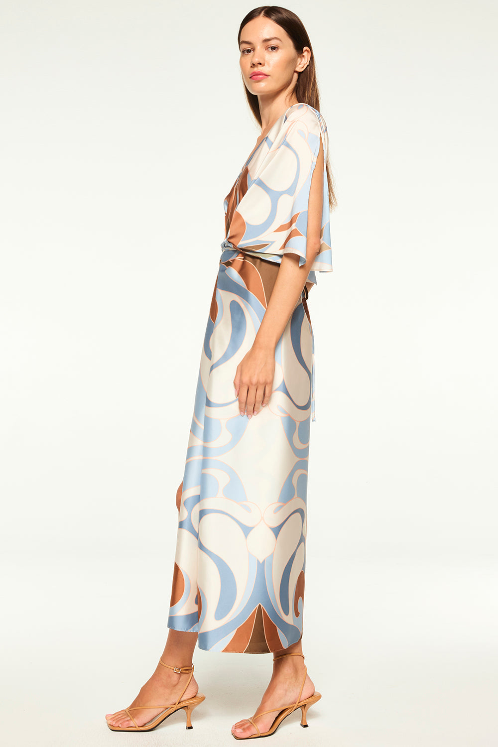 Turn heads in the Kim dress, an all new stunning midi silhouette cut from our graphic Swans print satin. Featuring a v neckline and elbow-length split kimono sleeves with ties that wrap around the waist and cinch tie in the back for a modern look.