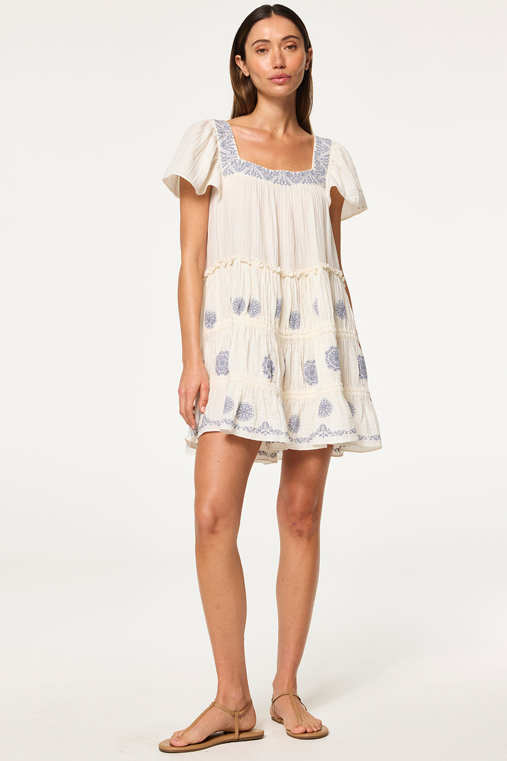 Kiran is a breezy cotton gauze mini for your next warm-weather getaway. A square neckline and back trimmed with blue embroidery leads into this babydoll silhouette with delicate ruffle trimmed tiers featuring a blue embroidered medallion motif. Short flutter sleeves. Lined.