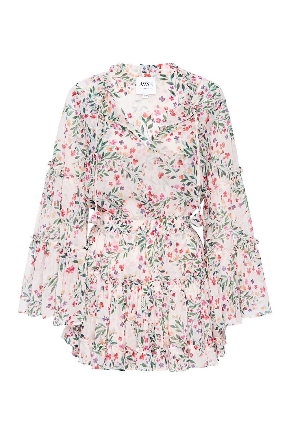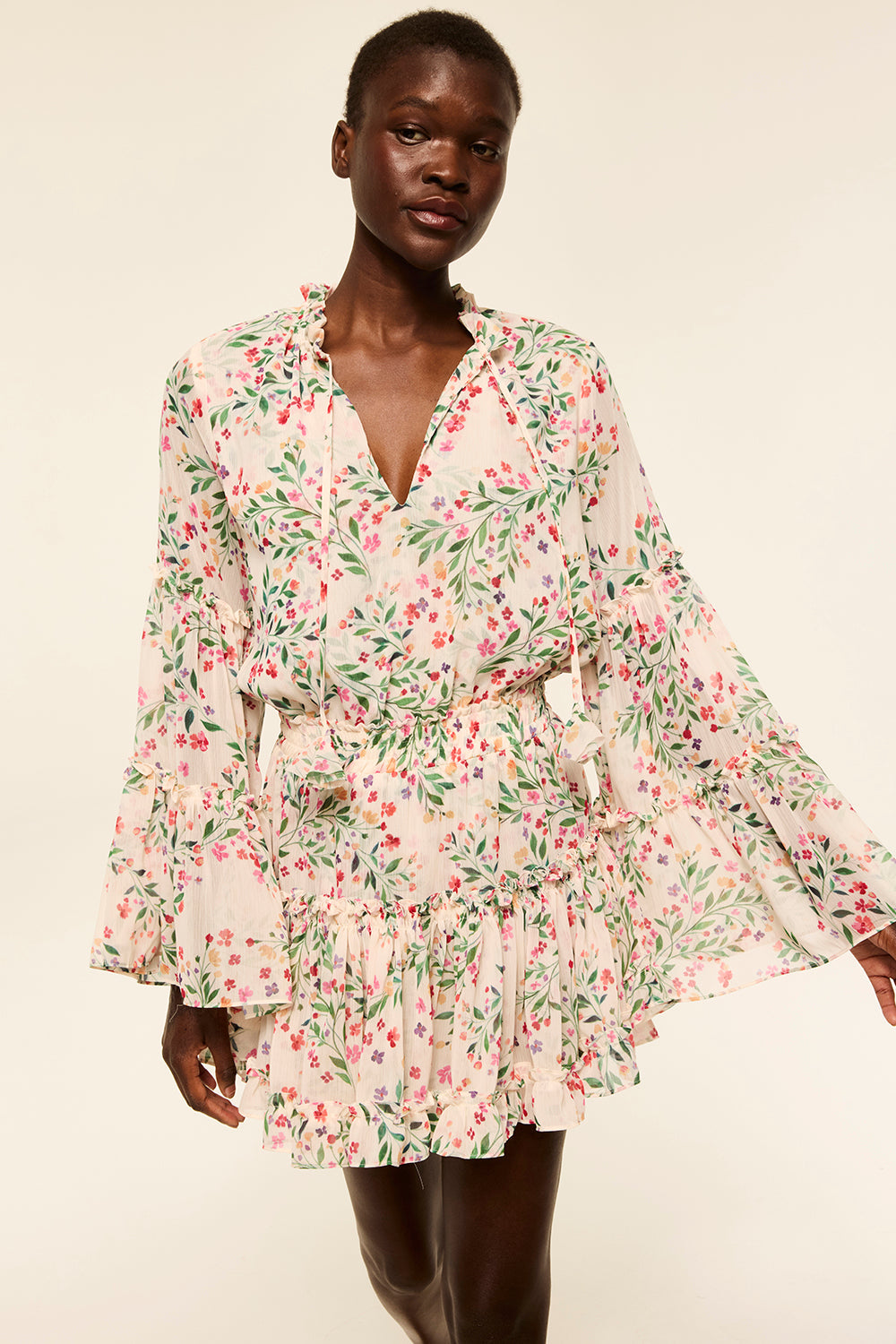 Effortlessly chic in our most-loved Leeva mini dress, back this season in a Spring Ditsy chiffon. The bodice features a split neckline with our signature petal tassel ties. Long tiered bell sleeves compliment the ruffle trimmed mini-skirt. A smocked elastic waist is comfortable and figure-flattering. Both the skirt and bodice are lined.