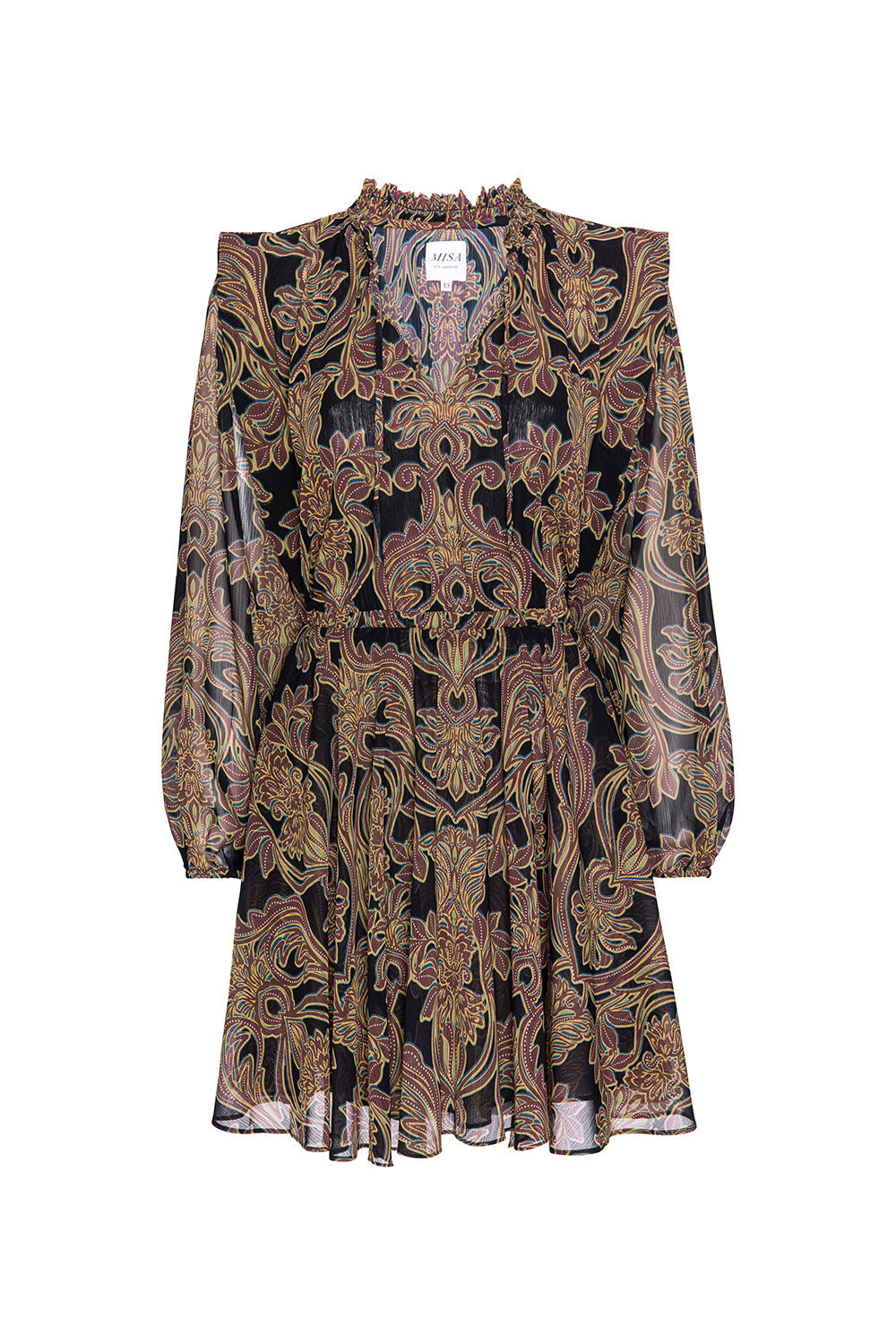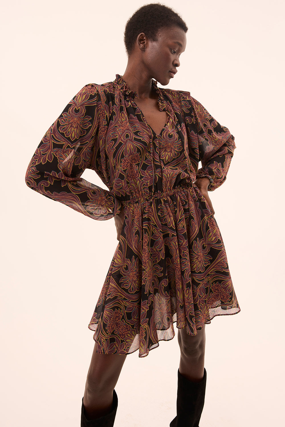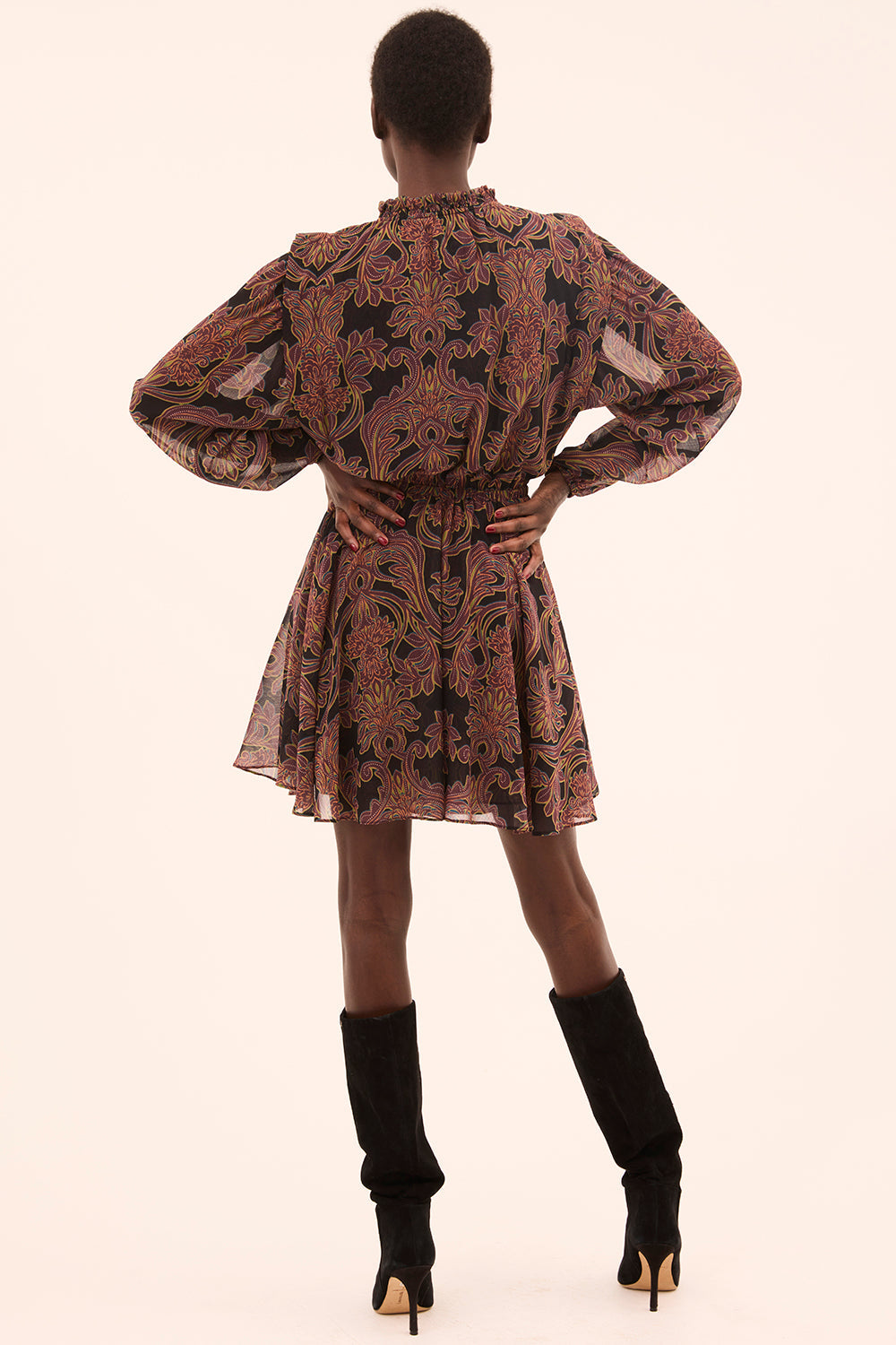 Lilly is an effortless fall mini dress cut from our gorgeous Studded Flora print chiffon. Long blouson sleeves with elasticated cuffs frame a delicate ruffle-trimmed neckline, complete with a V-front and adjustable petal tassel ties. A comfortable elasticated waist defines the silhouette, while the double-lined skirt falls in a flowing mini length. Style with everything from boots to strappy heels or ballet flats.
