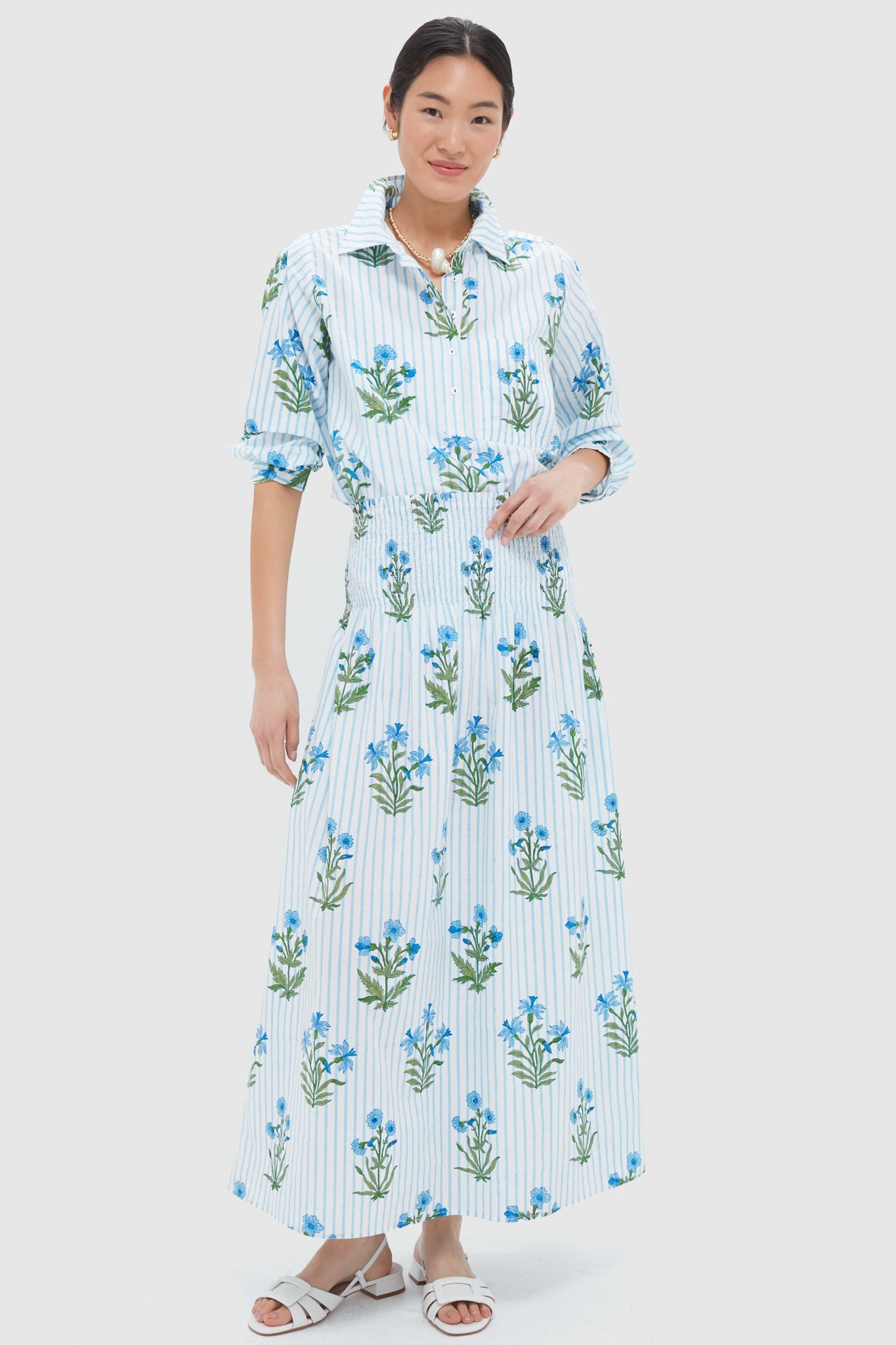 Meet the multitasker your summer wardrobe needs— the Lily Stripe Alba Skirt. This smocked beauty works as both a flowy skirt and a strapless dress. Hand block-printed on soft organic cotton in blue and green vintage-inspired buta prints, it's equal parts comfortable and charming. Pair it with a tank or the matching Alba Shirt for coordinated chic look.