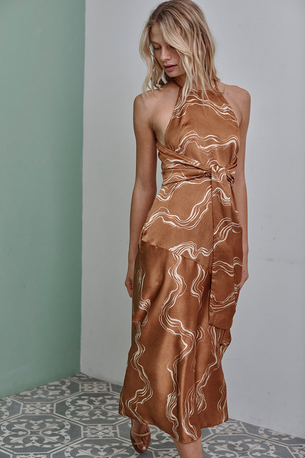 Lisa is a brand new halterneck midi silhouette cut from our Linear Wave printed satin. A back panel wraps around to be tied in the front, creating a flattering, cinched waist. Finished with a back keyhole button at the neck, side slit pockets, and a diagonal seam that leads into a flowing skirt with a side slit, it’s a perfect dress for your next event or easily dressed down with flats. A versatile style that transitions beautifully from summer into fall.