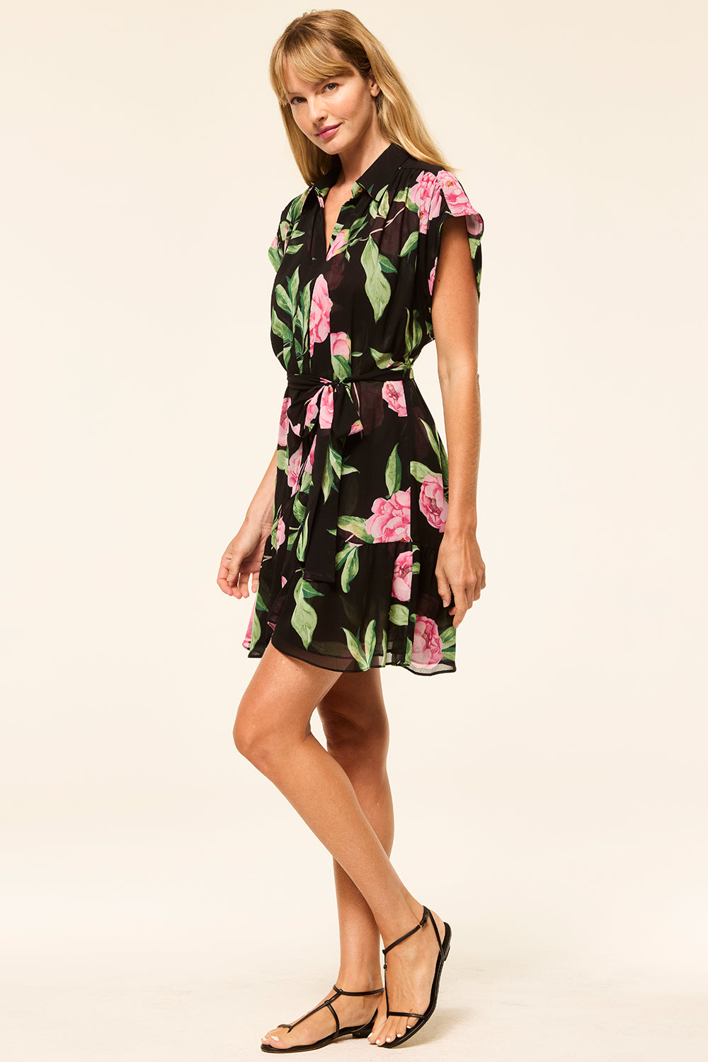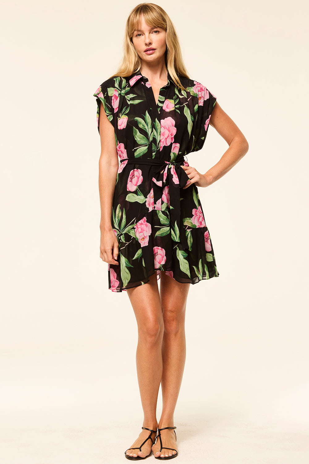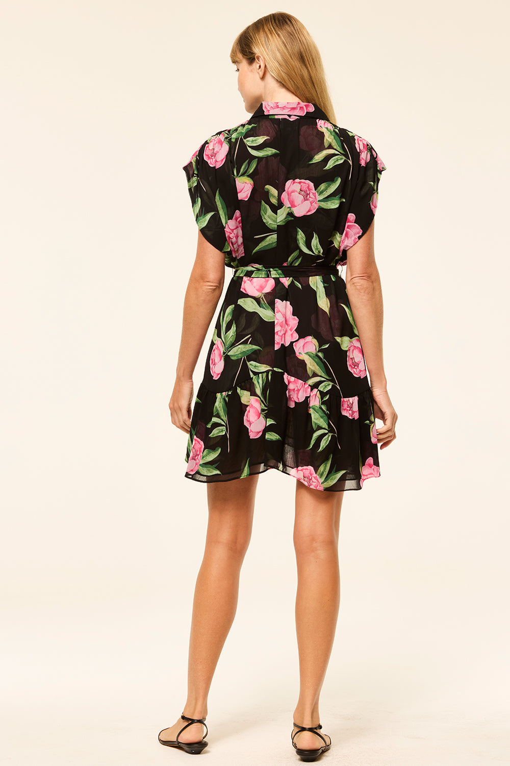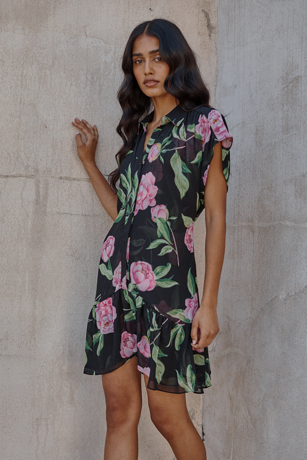 Our Lora dress is an easy mini silhouette cut from a Pink Peony printed black chiffon. A covered button front placket goes to the hem. Fold-over collar and short sleeves that are gathered at the shoulder. A curved wide ruffle hem and optional self-tie belt finish off this effortless style that will take you from this season to the next.