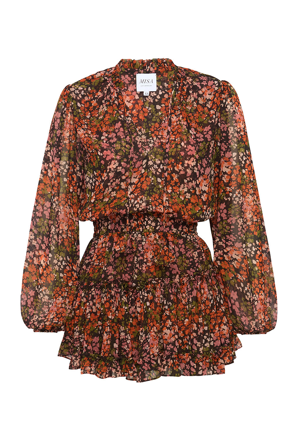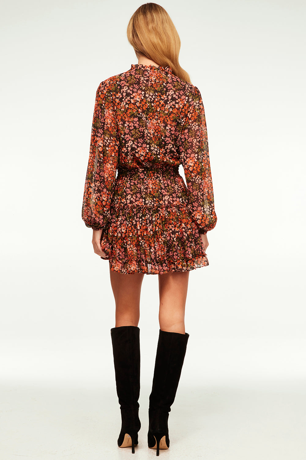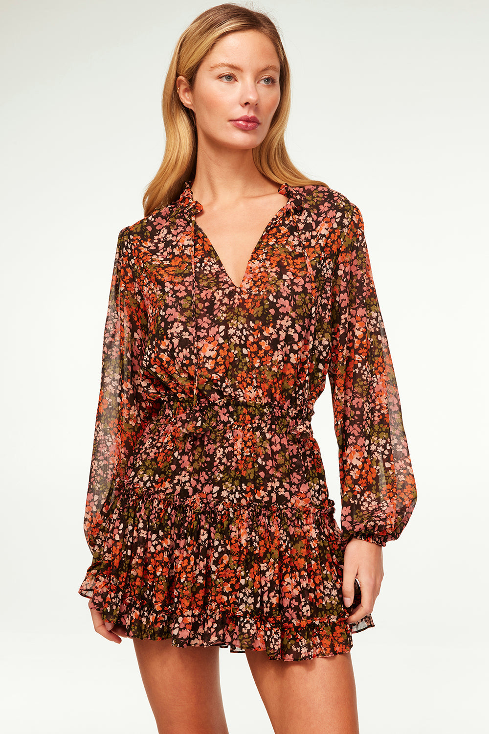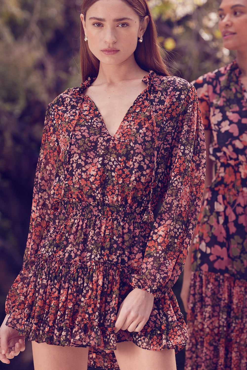 A classic style handcrafted from an effortless Autumn Flora print chiffon. Featuring a split neck opening with our signature petal string ties, this playful long sleeve mini dress is double-lined throughout with an elastic waist and a tiered skirt. Pair with suede boots for the cooler months ahead.