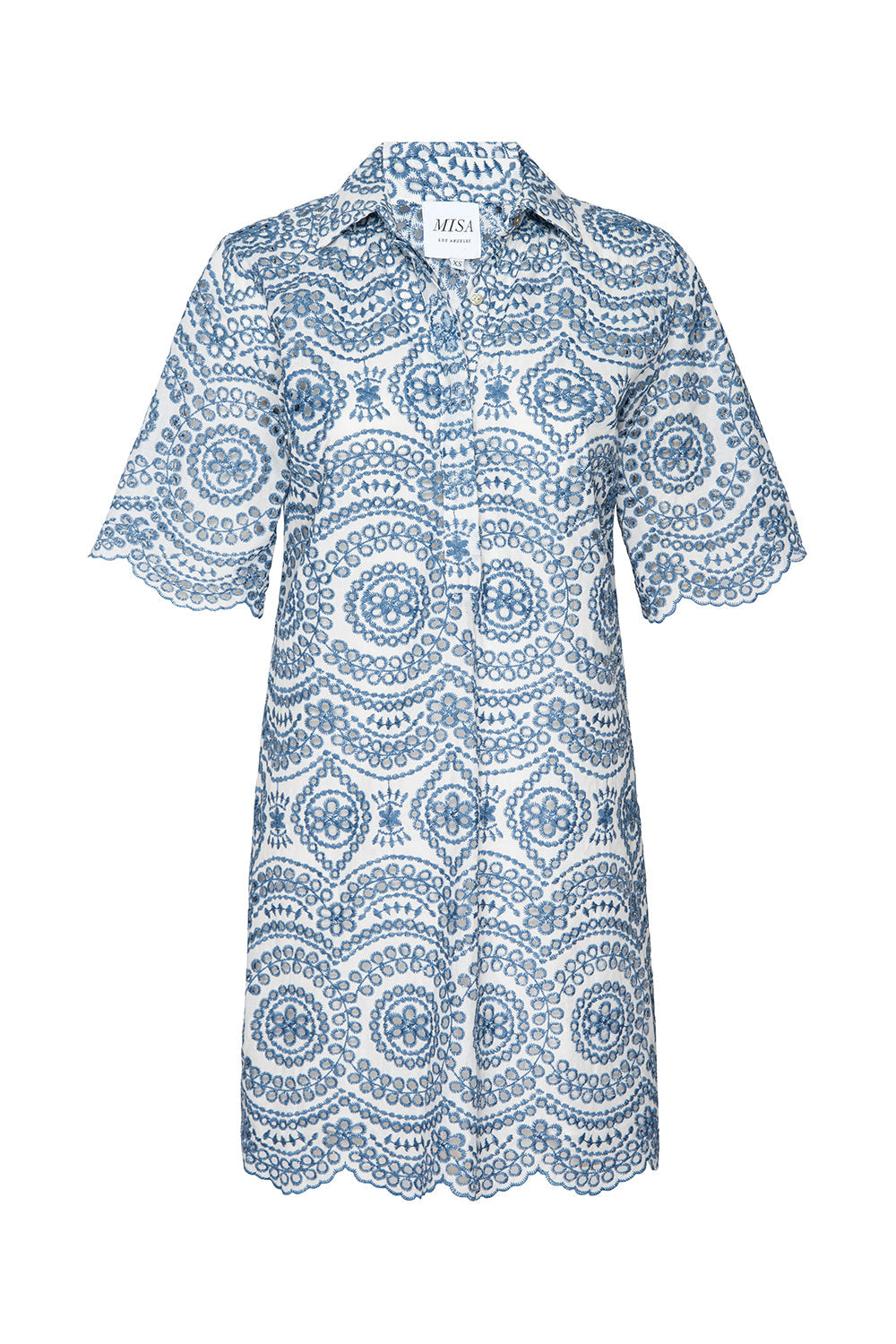 Lucia is a lovely mini silhouette in our embroidered blue cotton eyelet. Elbow length sleeves with a scallop trim. Fold collar with a covered half button placket. Scalloped hemline. Features an optional white camisole dress to wear underneath.