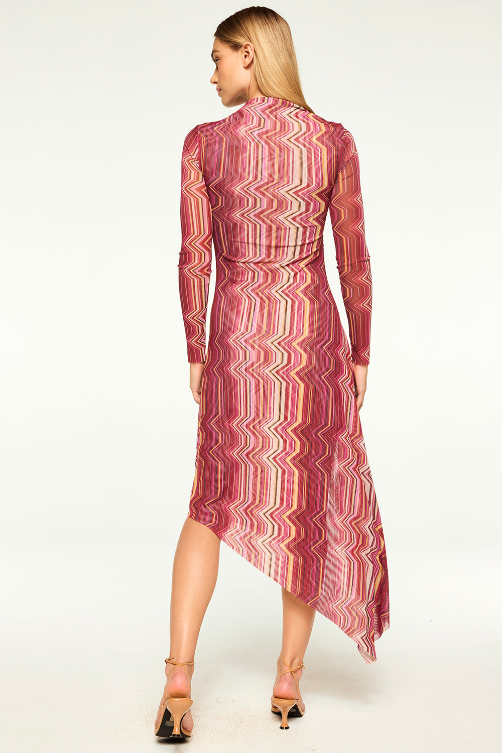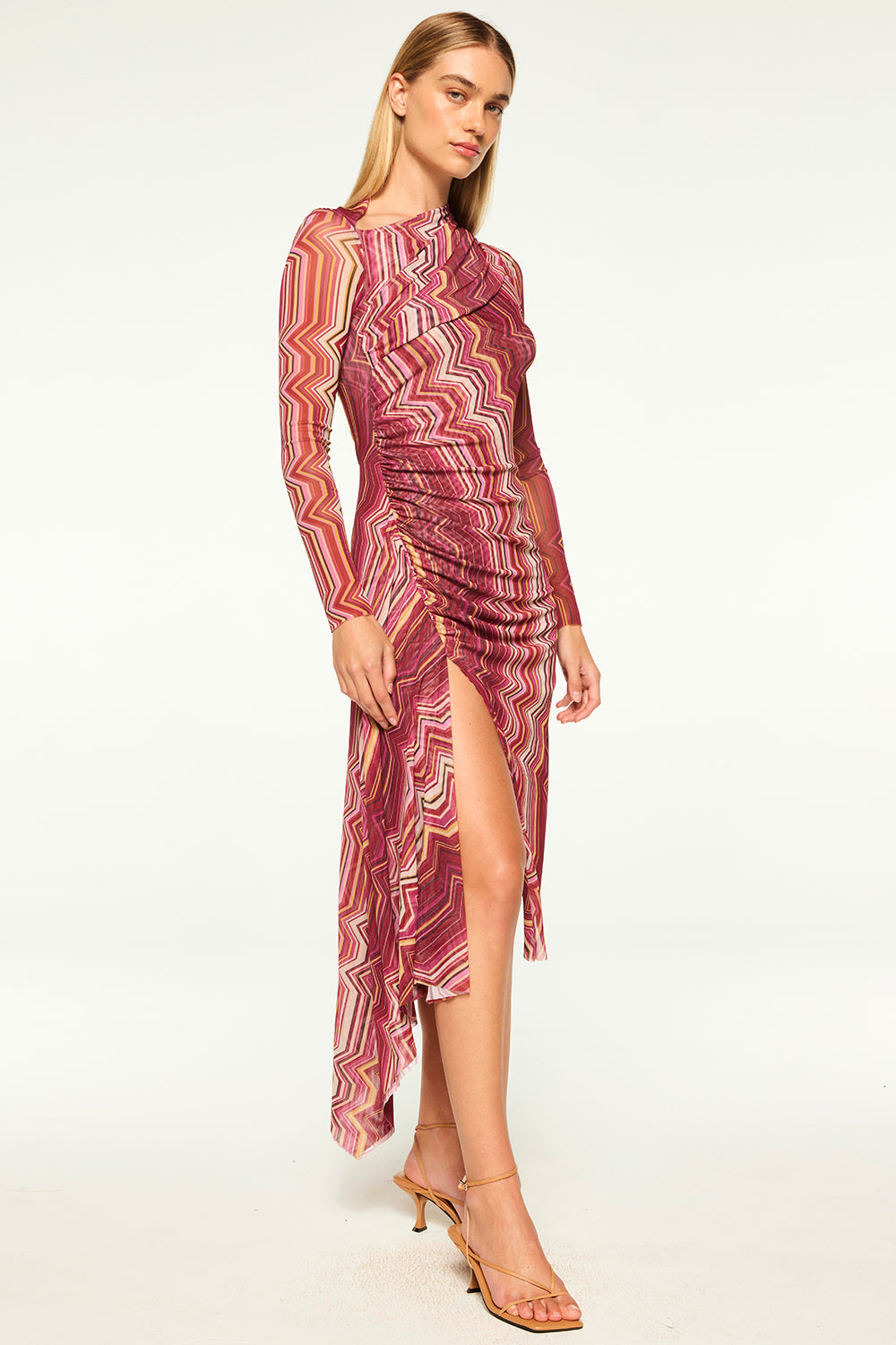 Our Marina dress is a chic midi silhouette in our La Banda Crimson mesh. A fitted bodice with high gathered neckline is double lined and leads into an asymmetric handkerchief hem. Long fitted sheer sleeves. Gathered ruched details at the bust and diagonal across hip provide a flattering fit. Pair with boots during the colder months and strappy heels when it warms up.