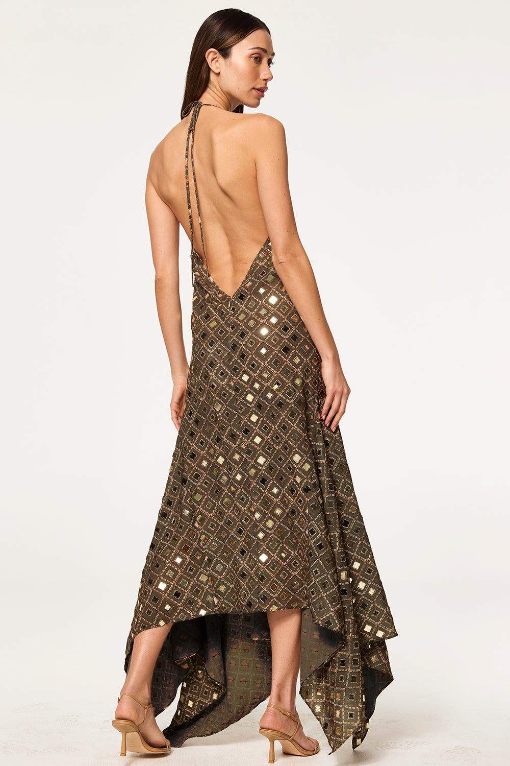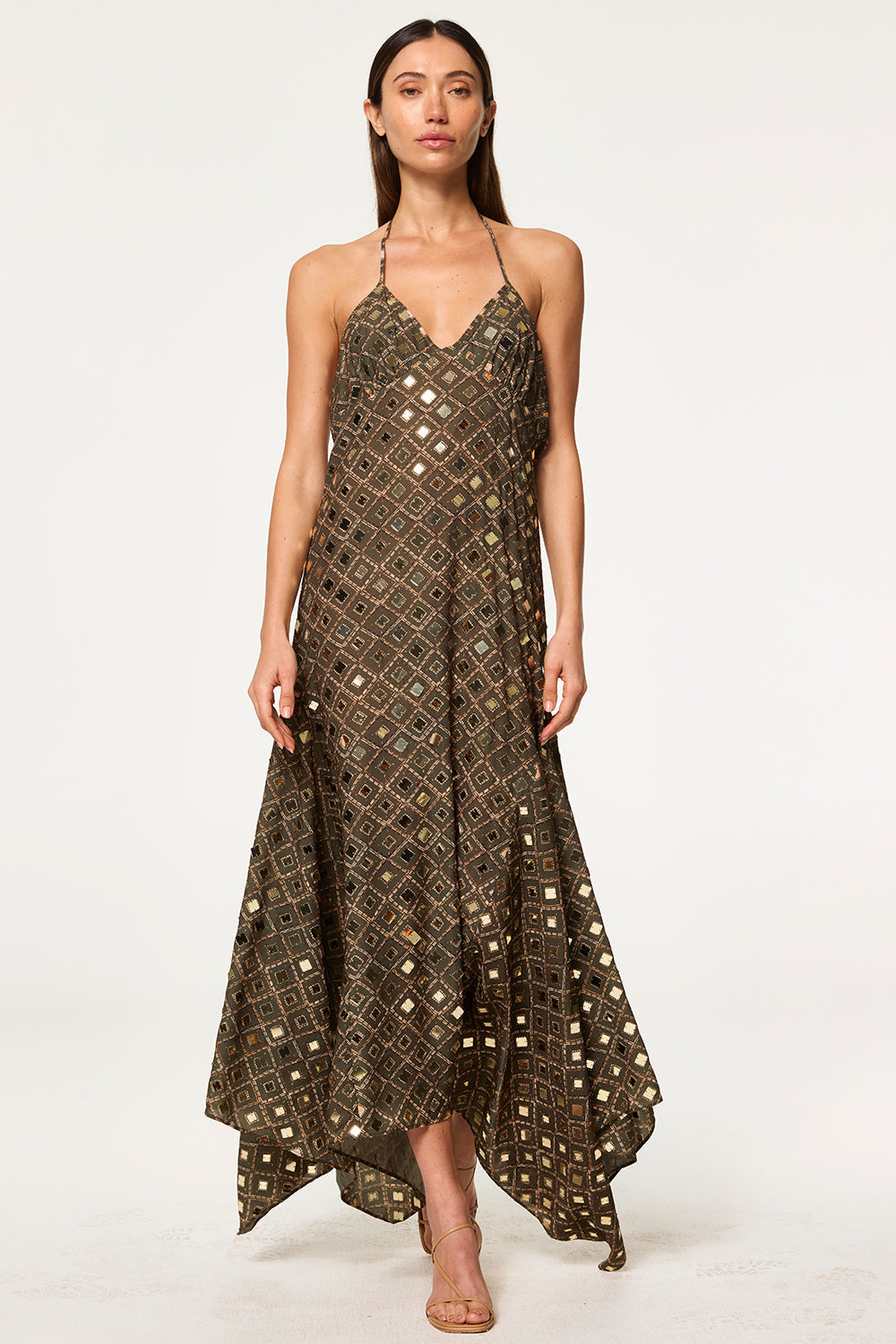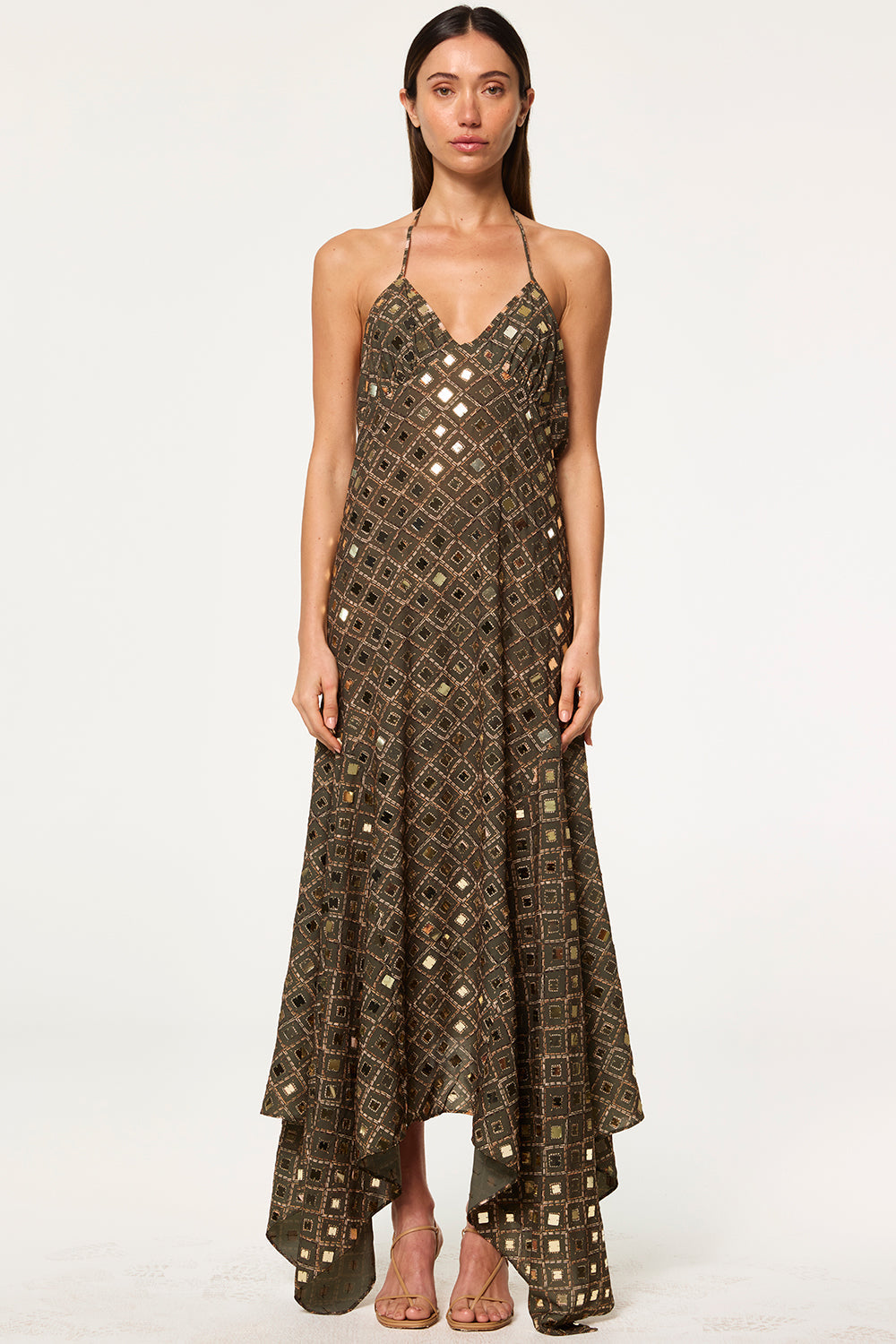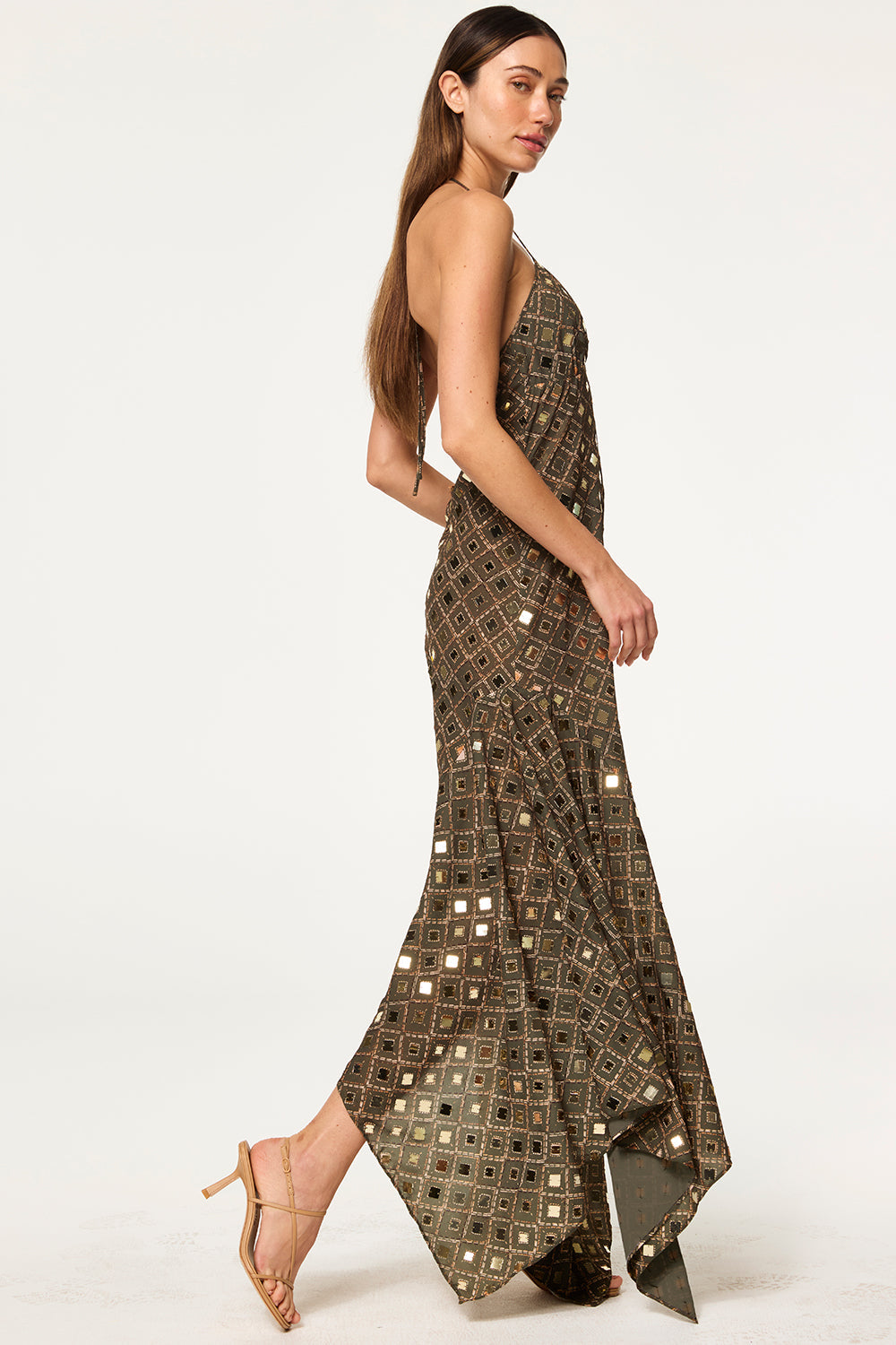 Mattias is a striking olive maxi dress fully adorned with sewn-on mirrored tile details for a shimmering finish. Hidden back-zip closure. Designed with a halter V-neckline that ties at the neck, a gathered bustline, and a deep V open back, this silhouette is finished with a staggered handkerchief hem for added movement and drama.