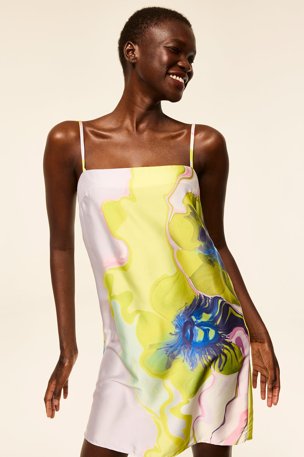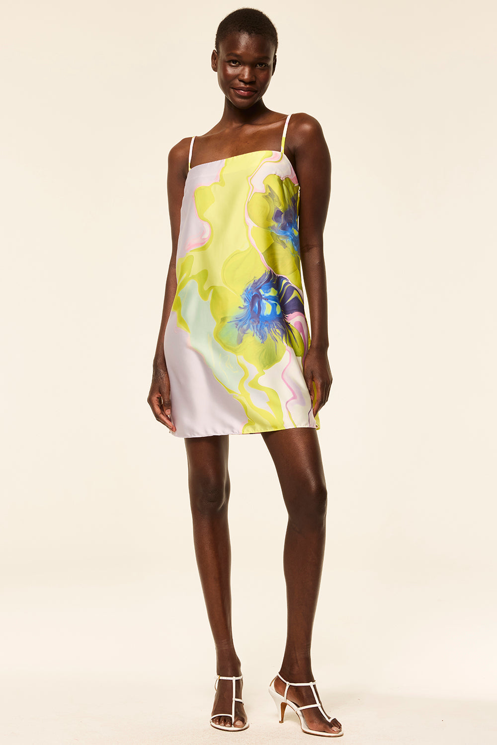 Maxine is an all-new mini silhouette cut from a vibrant Marble Flora printed satin. This 90’s inspired dress features a straight neckline with adjustable spaghetti straps. Hidden side zip closure. Pair this chic and simple style with everything from heels to flats.