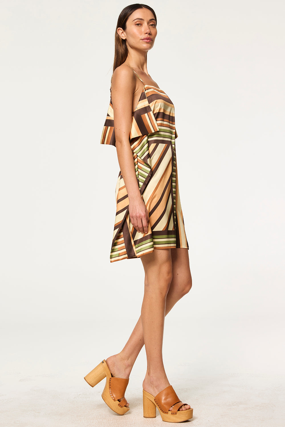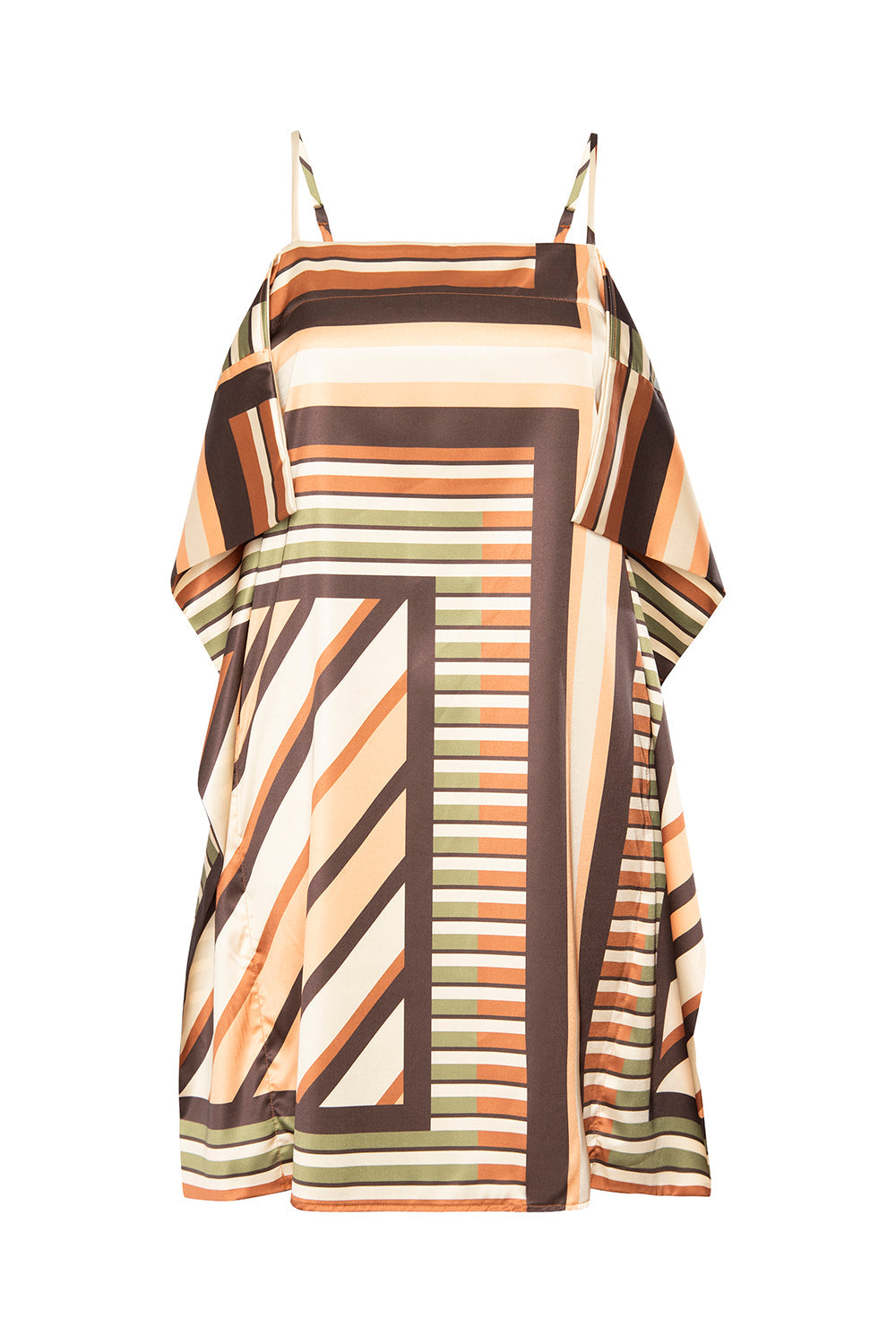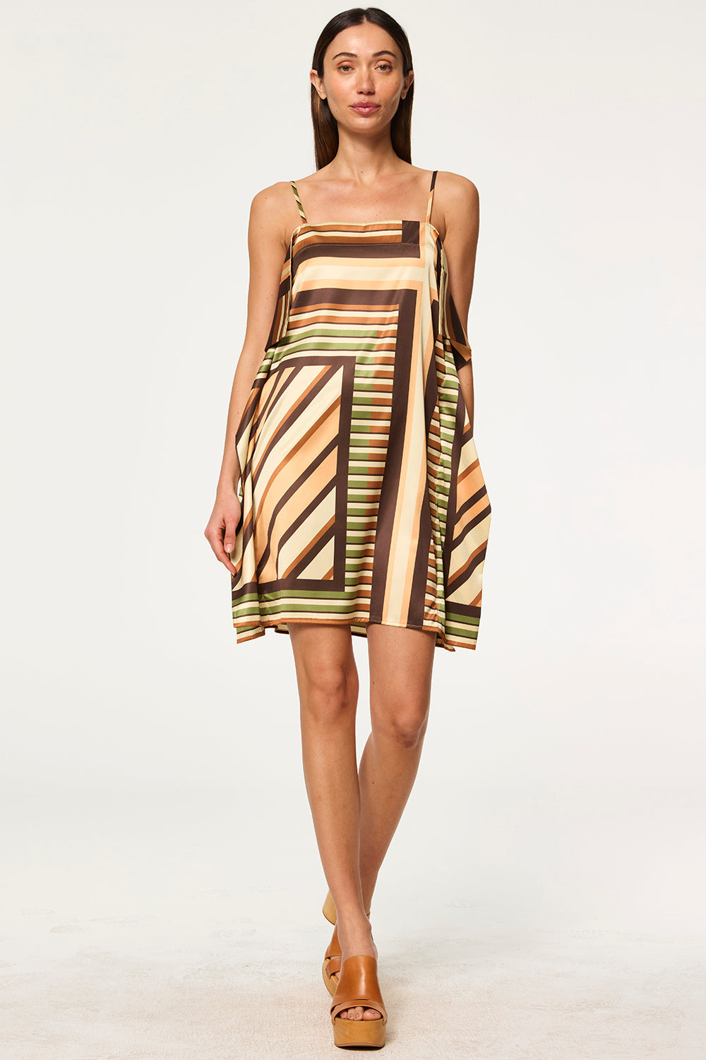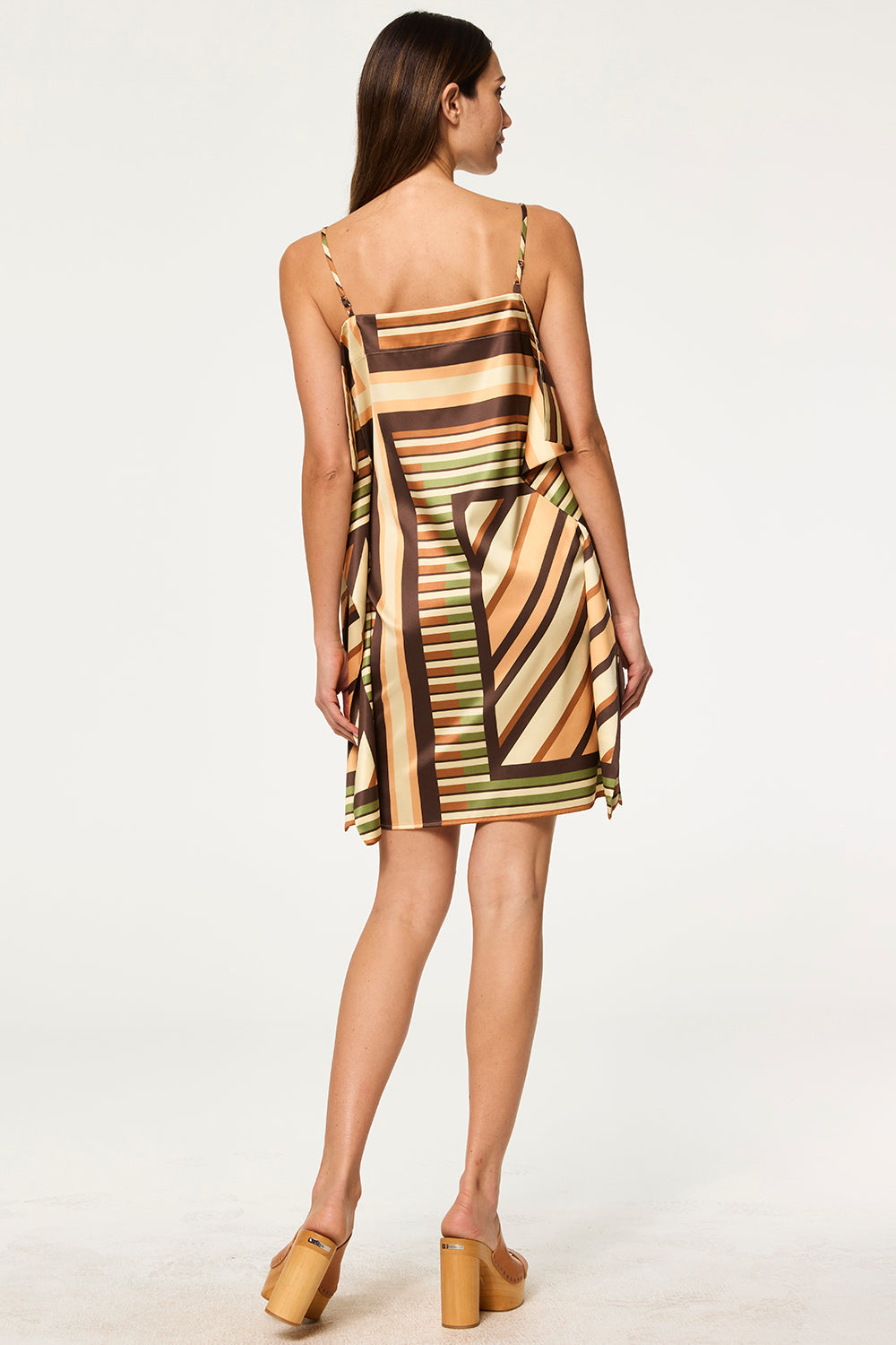 Mayam is a chic and modern shift-style mini slip dress cut from Geo Scarf printed satin. Featuring a straight neckline, adjustable spaghetti straps, and a pullover design, this effortless silhouette is detailed with scarf-inspired panels along both sides for added movement. A versatile piece that pairs easily with everything from flats to heels.