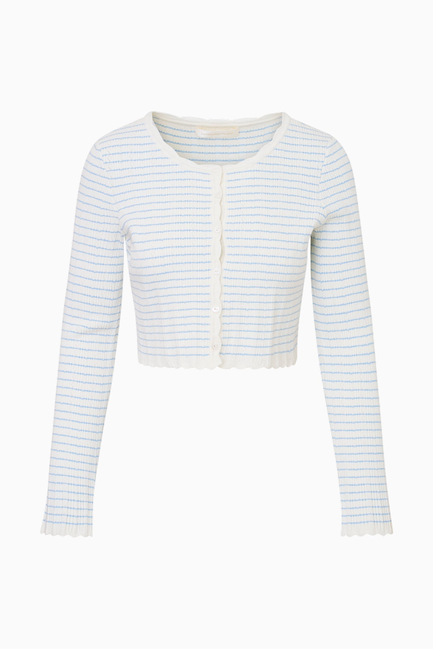 Introducing the Media Cardigan. This lightweight layer debuts with our best-selling pointelle yarn with a nice stretch and extra soft feel. With an all-over rib pointelle, the cardigan has little stripes knitted throughout with lurex for our signature shimmer. The sweater has a slim crop fit, pointelle scallop edges, and a pointelle scallop placket adorned with our custom bow shell buttons down the front.