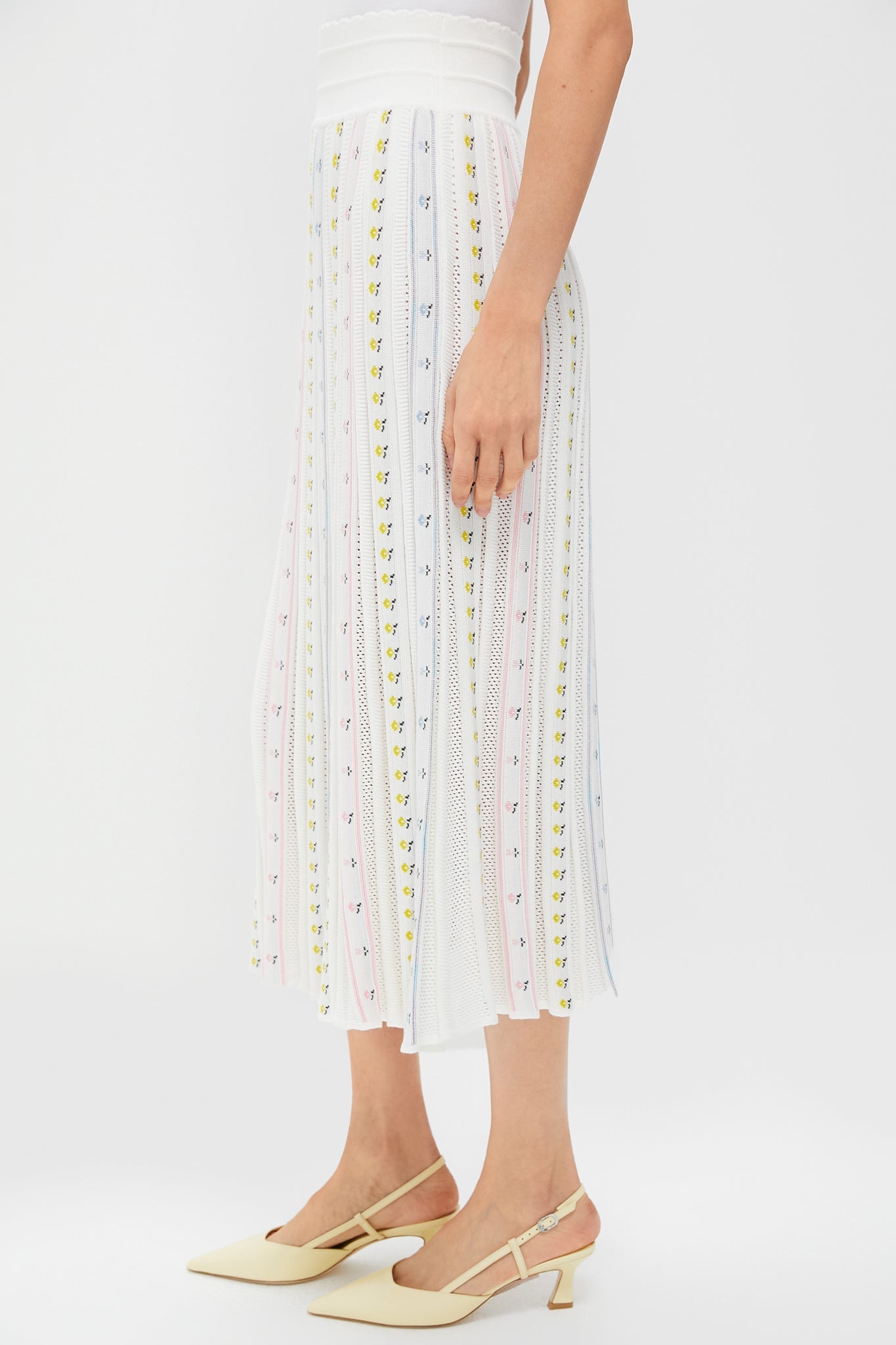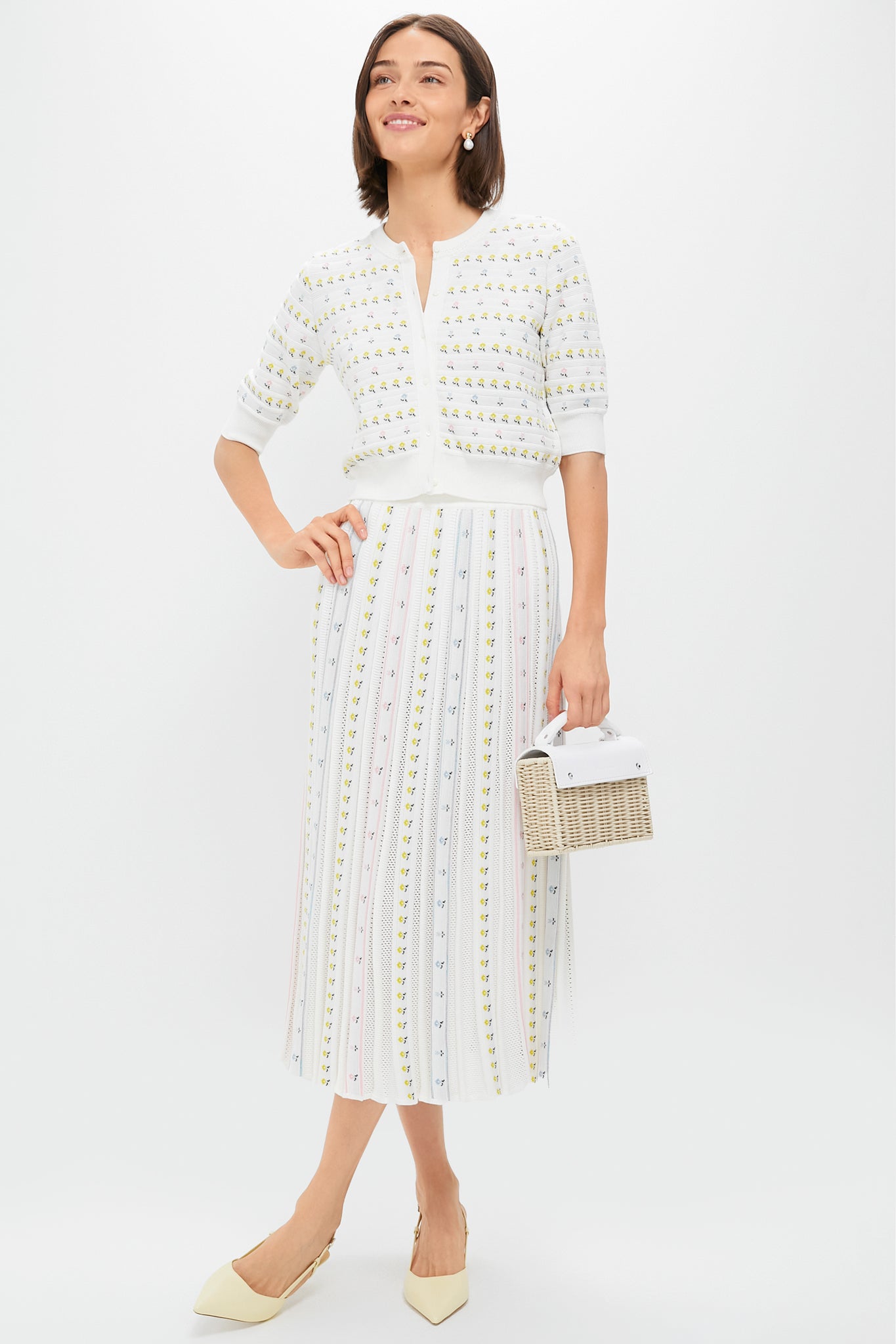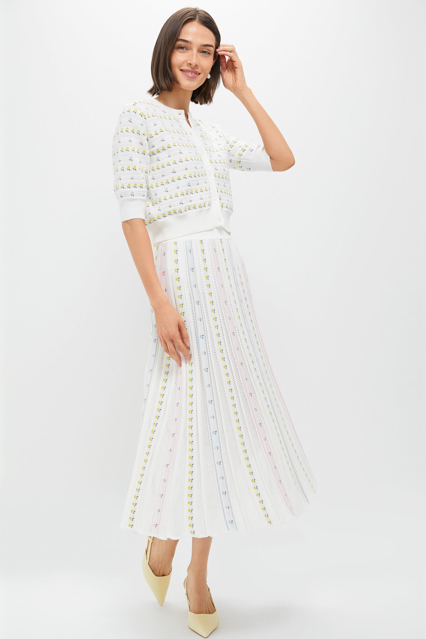 Knitted in a blend of cotton and pure extra-fine wool yarns for optimal comfort, the Milk Clochette Skirt features a small floral jacquard pattern inspired by "plant motifs". The garter stitch creates texture while the alternating pointelle and flat knit stitches add a lovely texture. Molli's iconic waistband emphasizes the silhouette and offers a subtle, fluid movement. Pair with the matching Milk Crocus Top, heels, and a clutch for a coordinated springtime look!