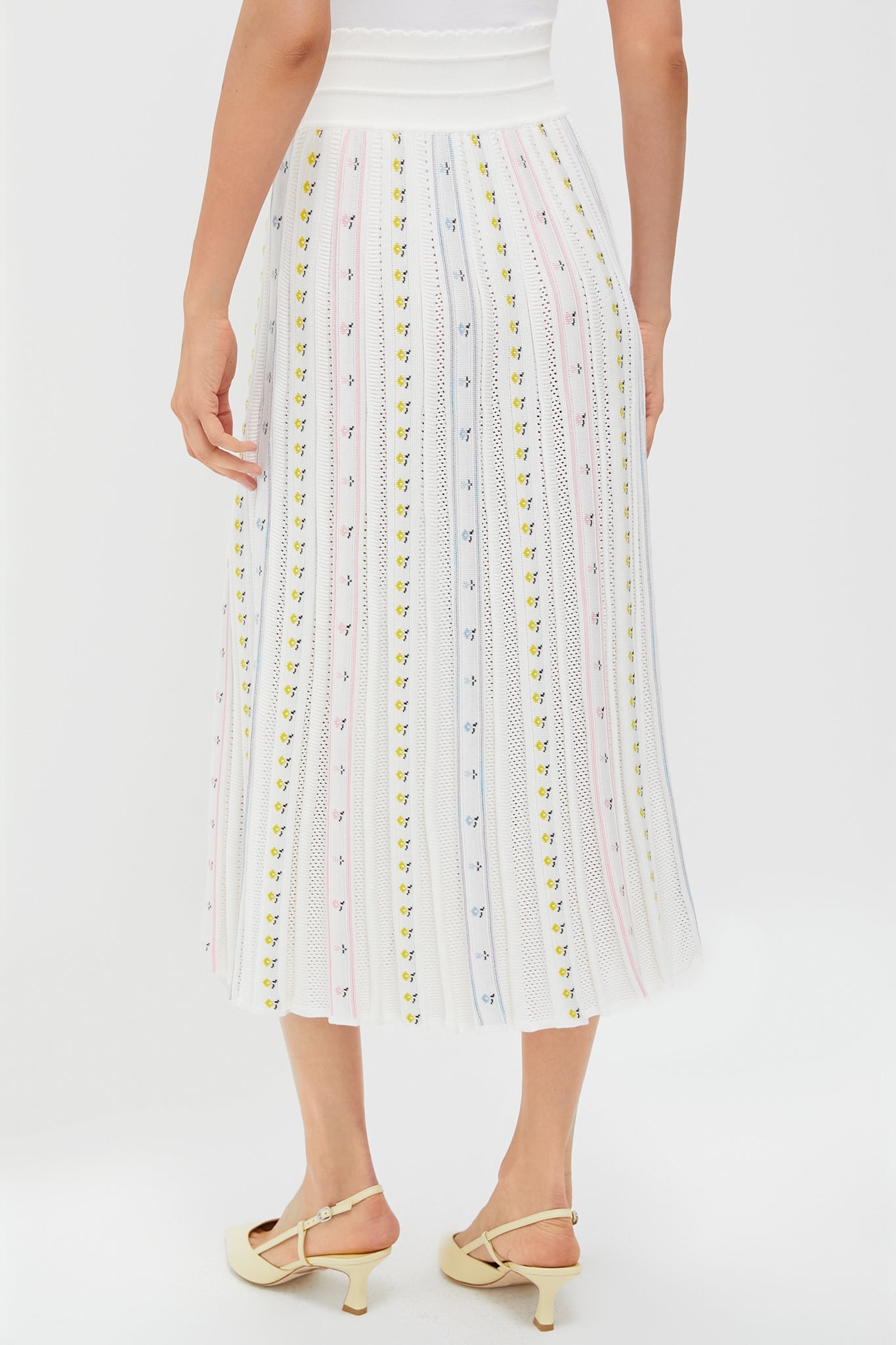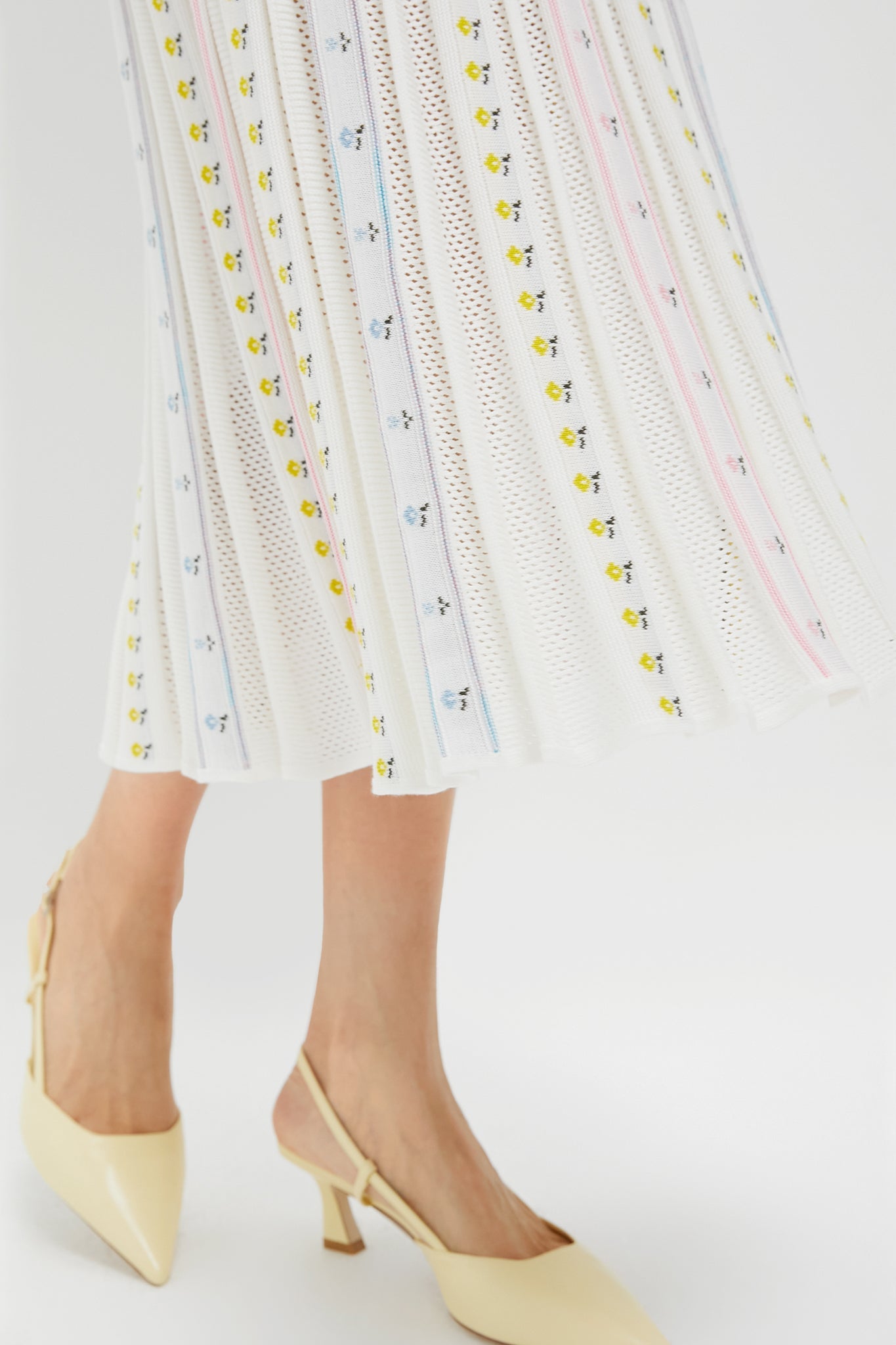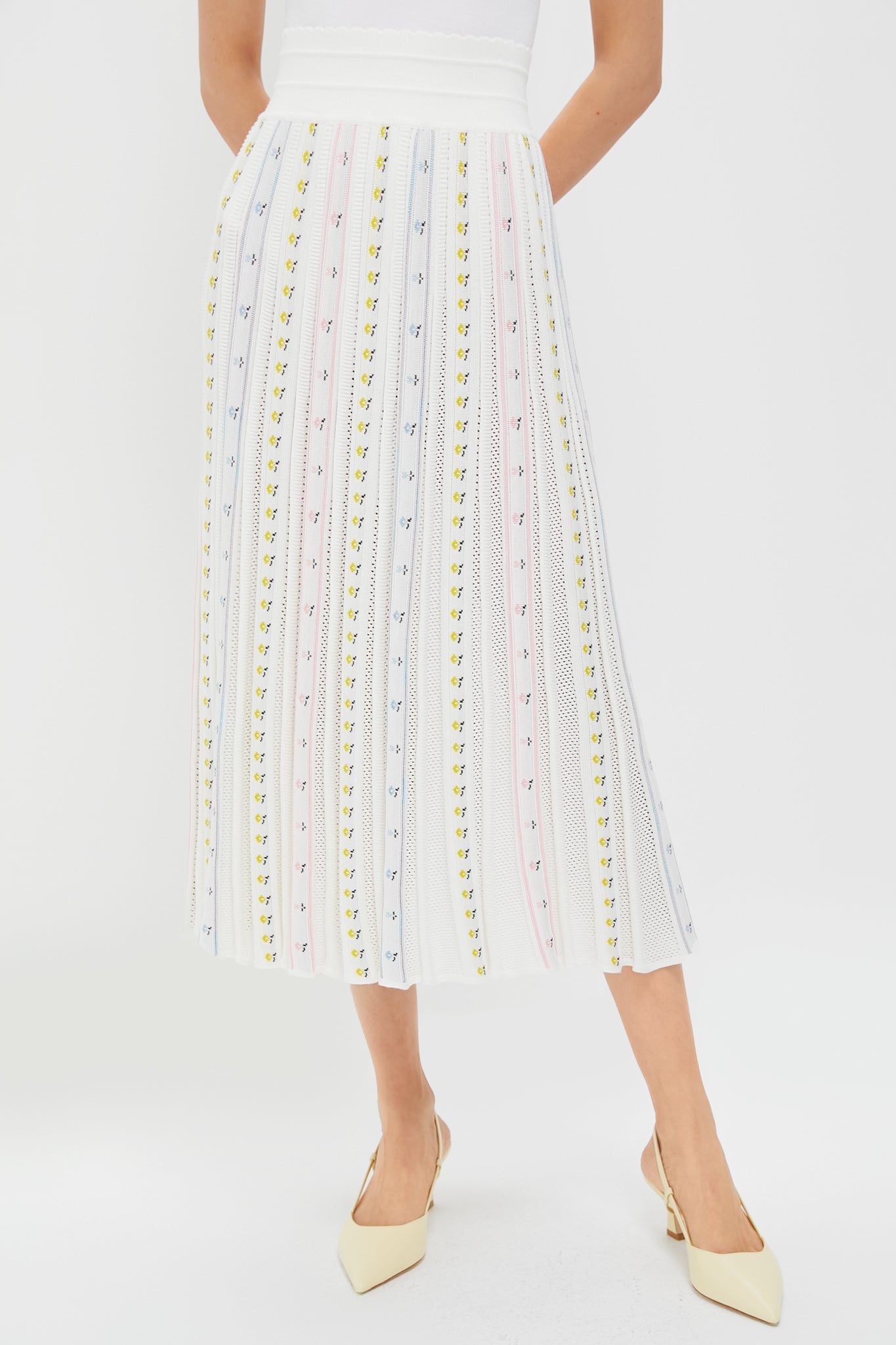 Knitted in a blend of cotton and pure extra-fine wool yarns for optimal comfort, the Milk Clochette Skirt features a small floral jacquard pattern inspired by "plant motifs". The garter stitch creates texture while the alternating pointelle and flat knit stitches add a lovely texture. Molli's iconic waistband emphasizes the silhouette and offers a subtle, fluid movement. Pair with the matching Milk Crocus Top, heels, and a clutch for a coordinated springtime look!