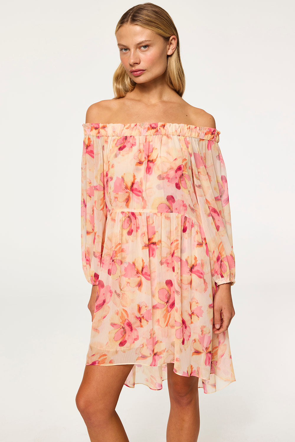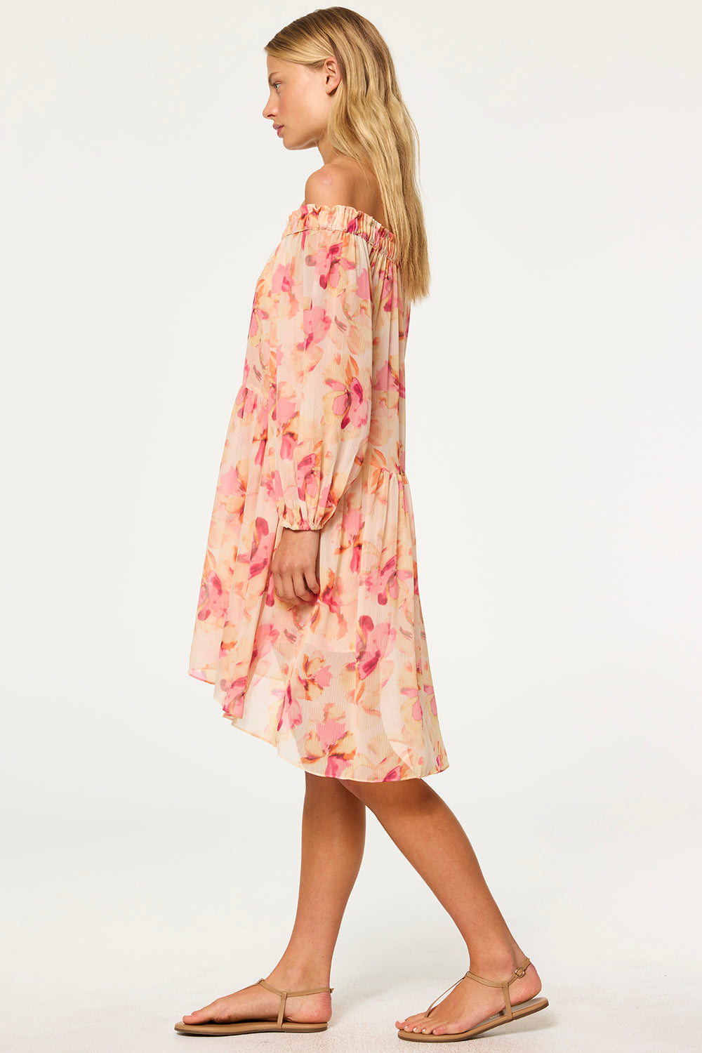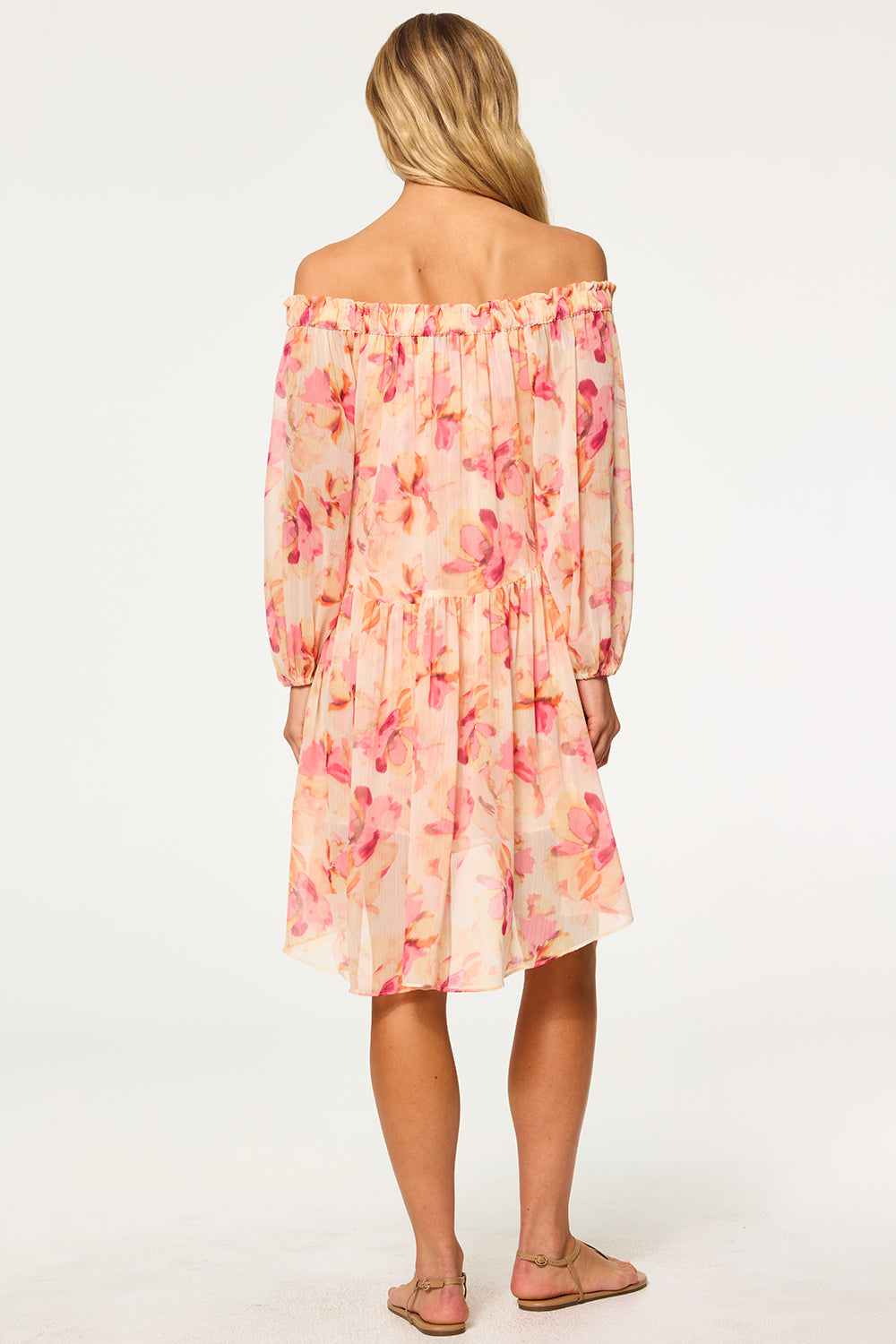 Millie is a romantic, bohemian-inspired off-the-shoulder mini dress cut from dreamy Watercolor Floral chiffon. Featuring an elasticated neckline, long billowy semi-sheer sleeves with elastic cuffs, and a loose, flowing fit, this double-lined silhouette hits at mid-thigh with a subtle high-low hem. The perfect warm-weather dress—easy to style with everything from flats to heels for your next event.