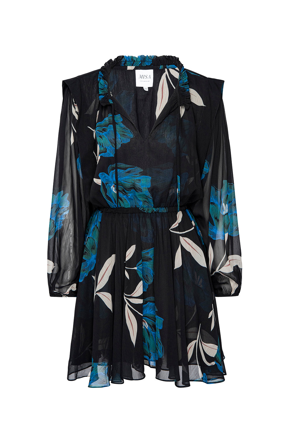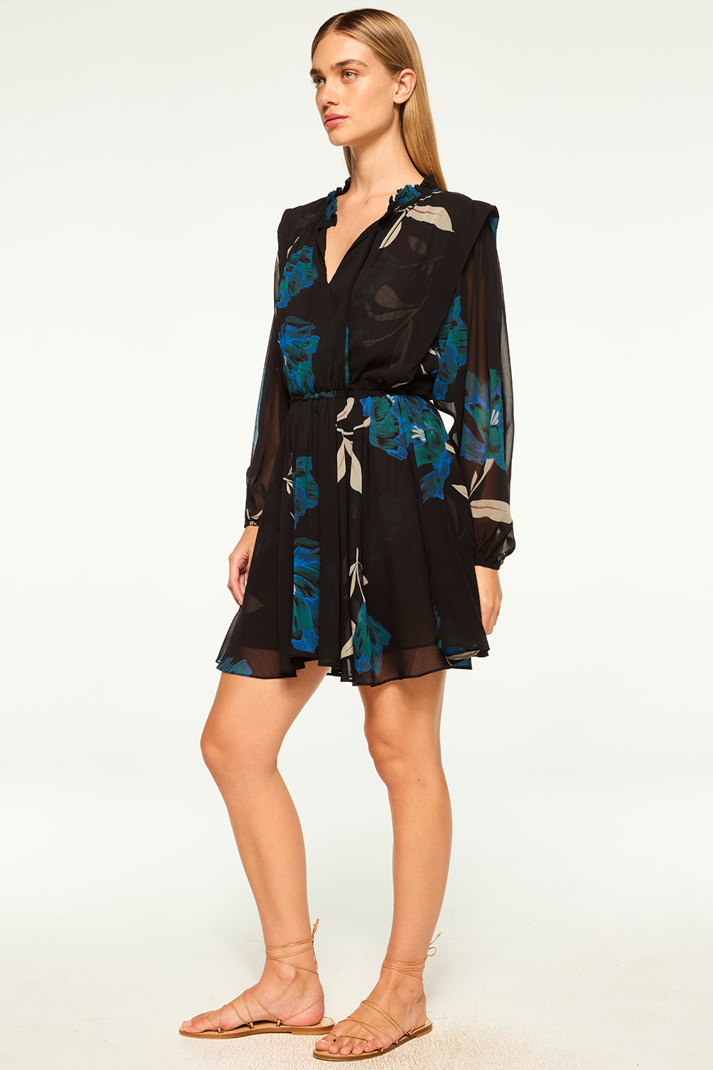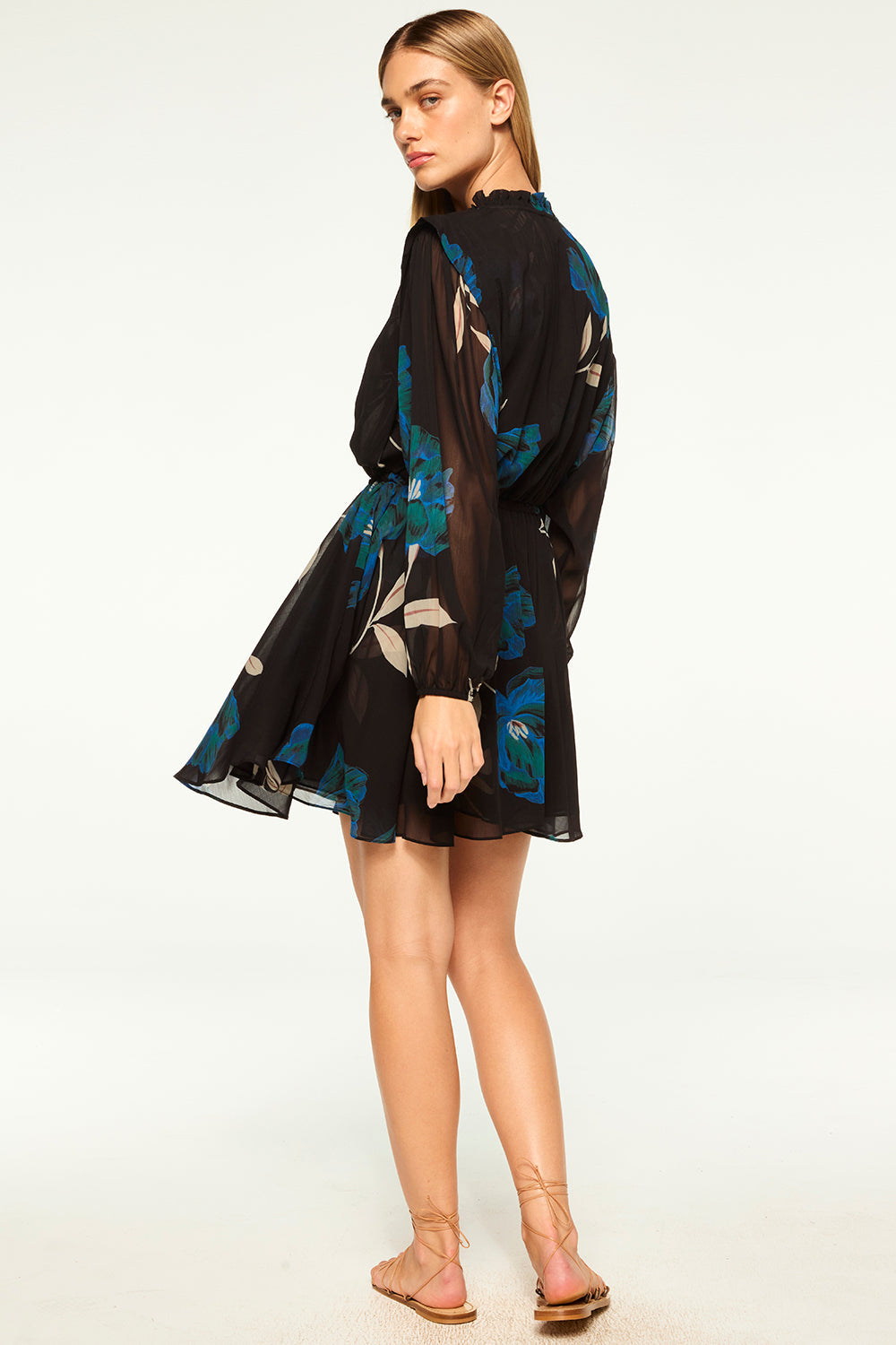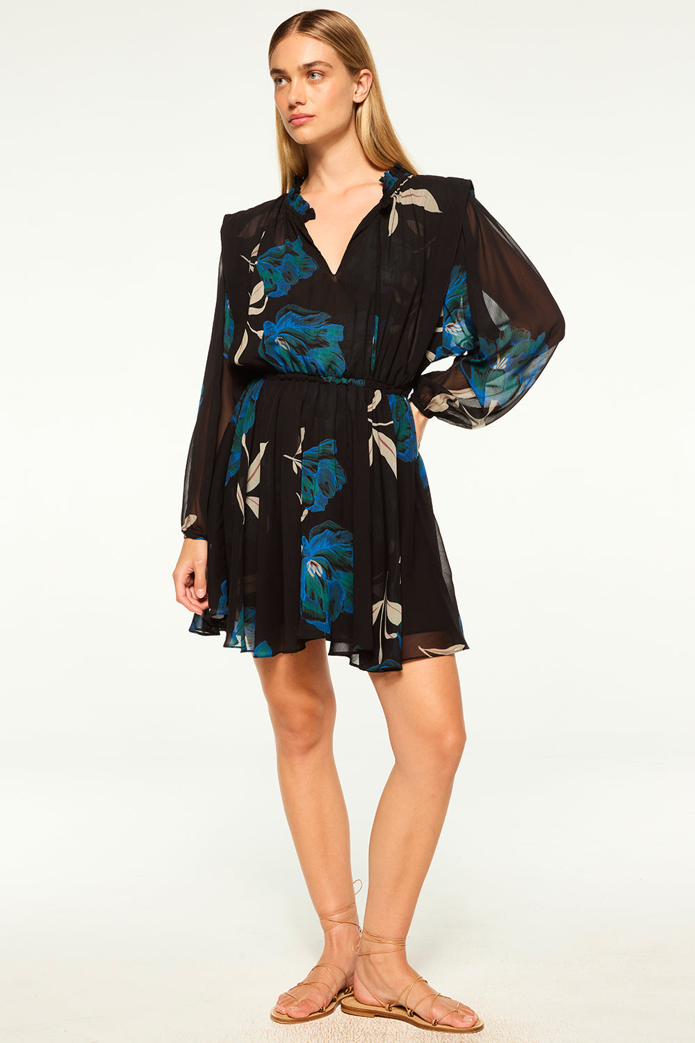 Our new Molly dress is cut from our new transitional Nightshade Flora printed chiffon. A split neckline features a small ruffle detail and our signature petal tassel ties. Long blouson sleeves and elastic cuffs. An elasticized waist leads into a flowing, double lined skirt that hits above the knees. Embrace the changing seasons in this easy dress that pairs with everything from flats to a strappy heel.