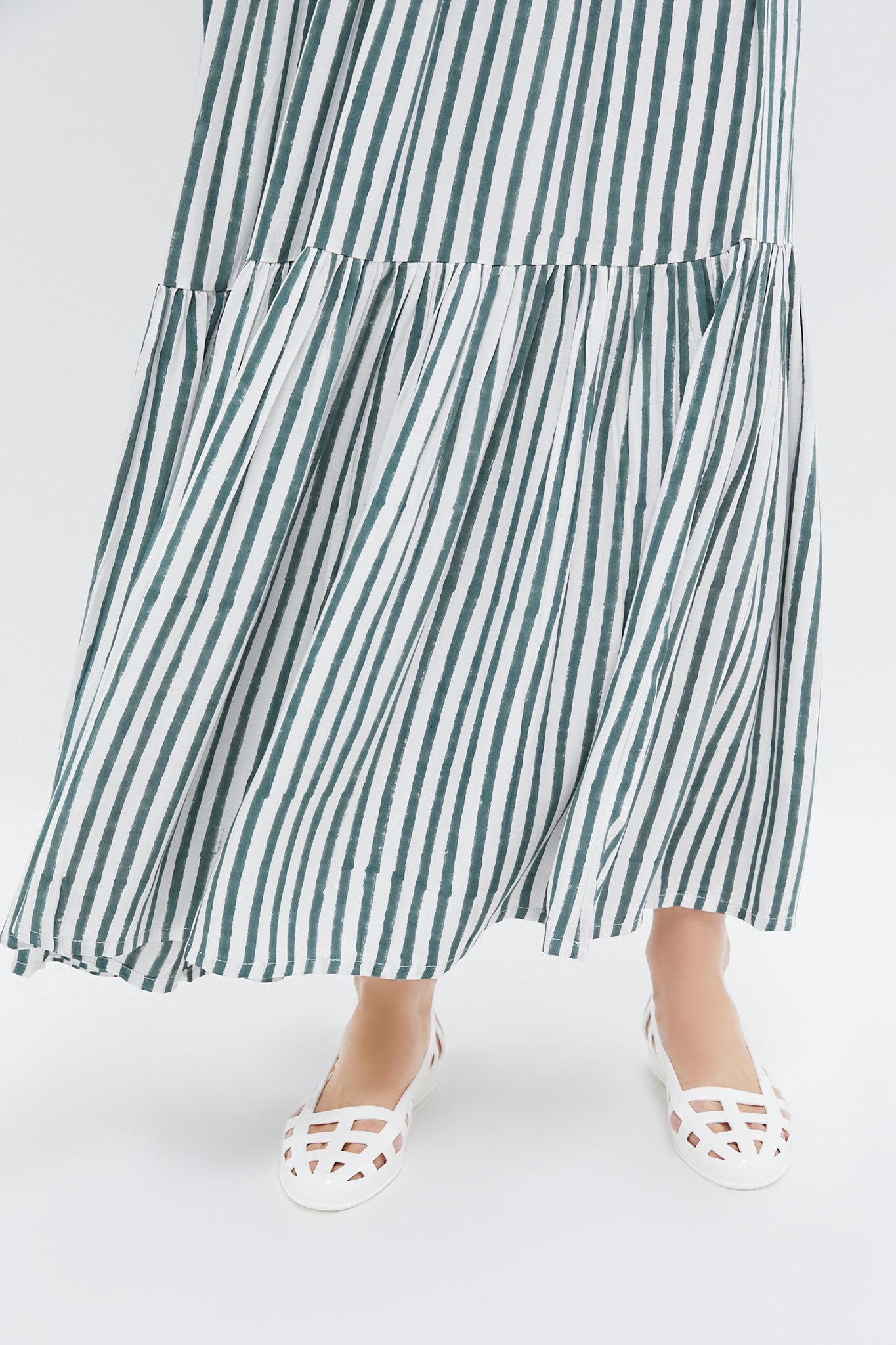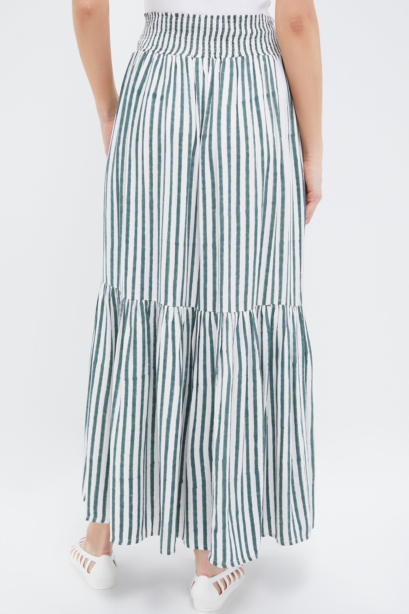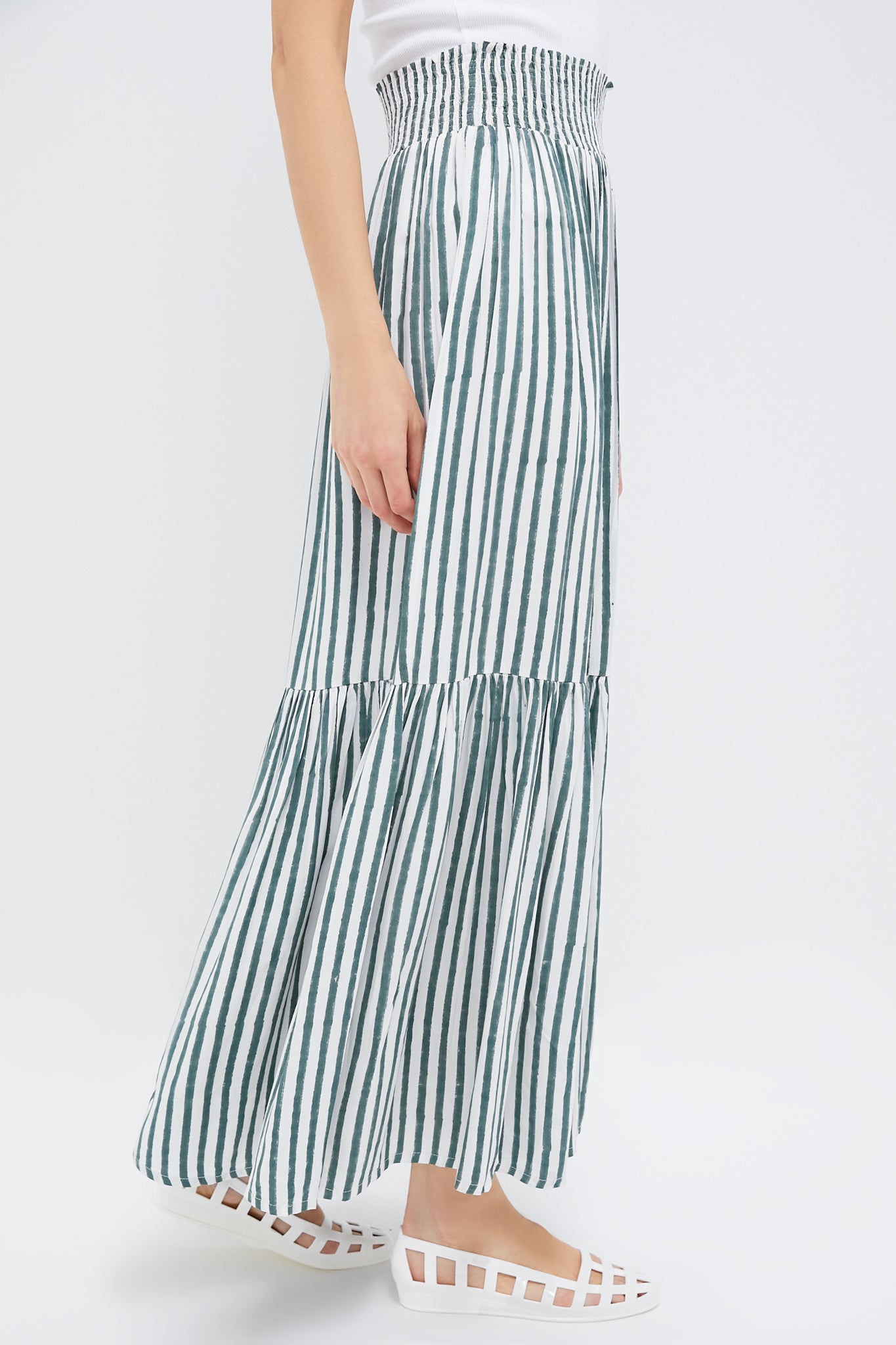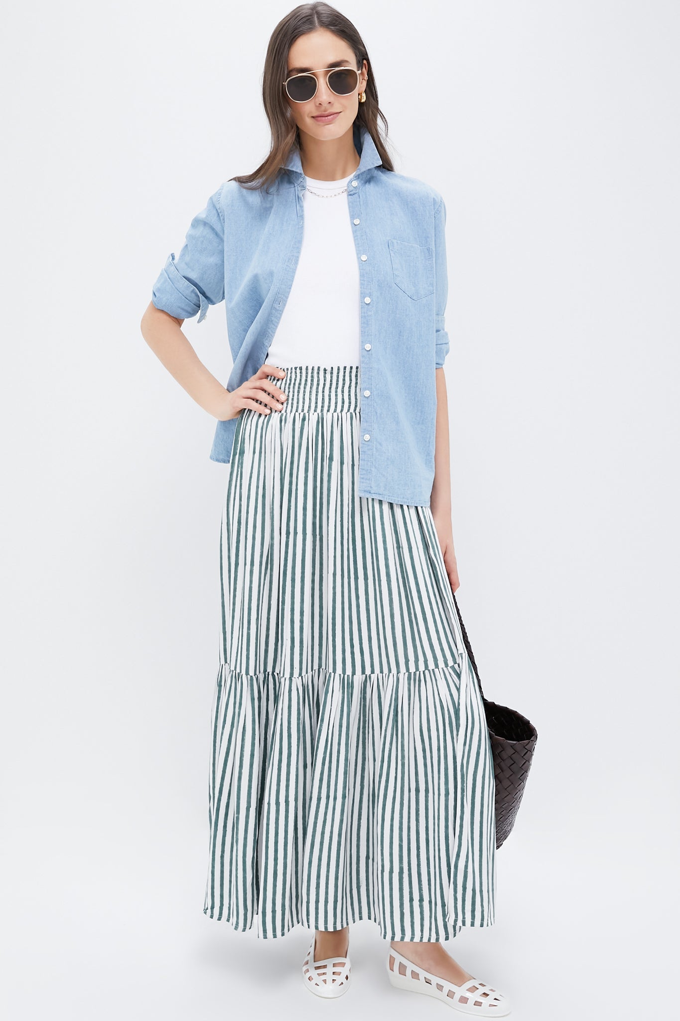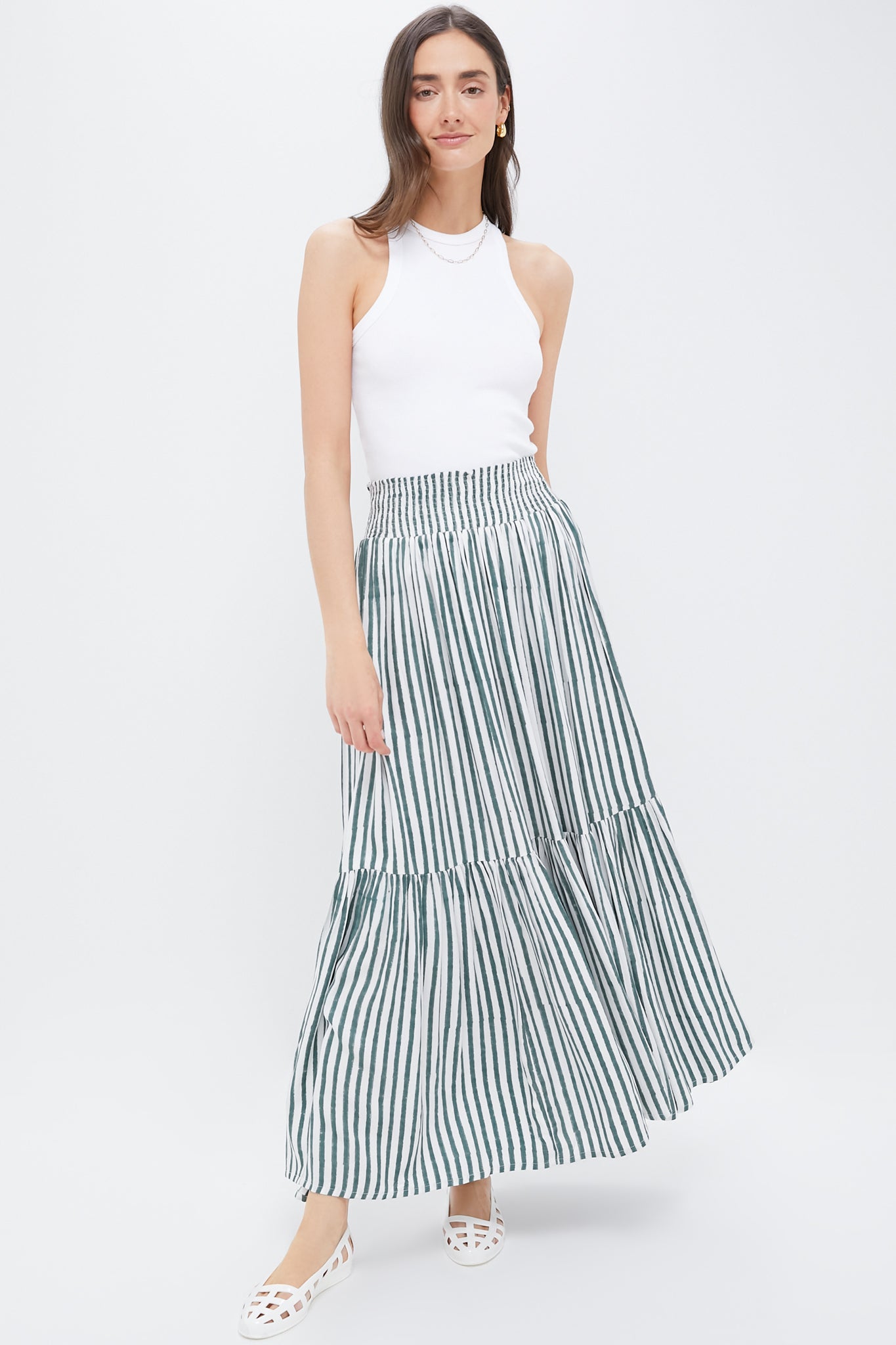 The Moss Stripe Shirred Skirt is the definition of effortless elegance. This maxi features an elastic shirred waist band, a tiered body, and a breezy modal fabric in a classic striped pattern. Pair with a tank and sandals for a look that can take you from brunch, to errands, to date nights.