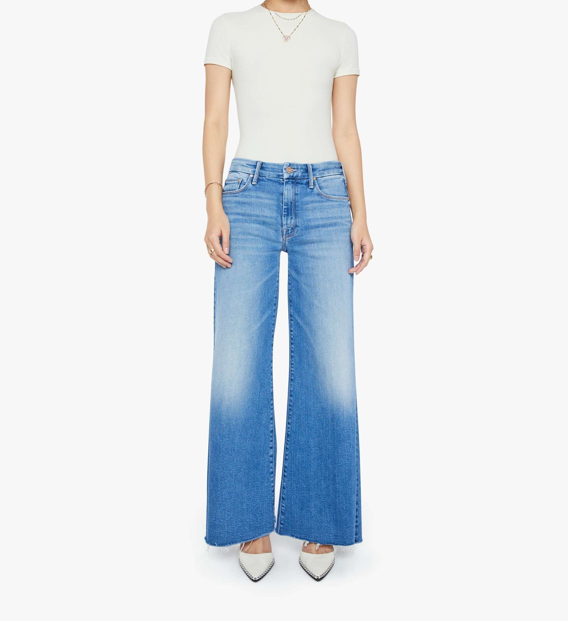 The MOTHER Lil Roller Fray features a high-waisted, wide-leg silhouette with a 29-inch inseam and a distinctive frayed hem. Crafted from stretch denim, this mid-blue pair showcases subtle whiskering and fading at the knee, combining comfort with a lived-in aesthetic. Ideal for those seeking a blend of classic style and modern edge.