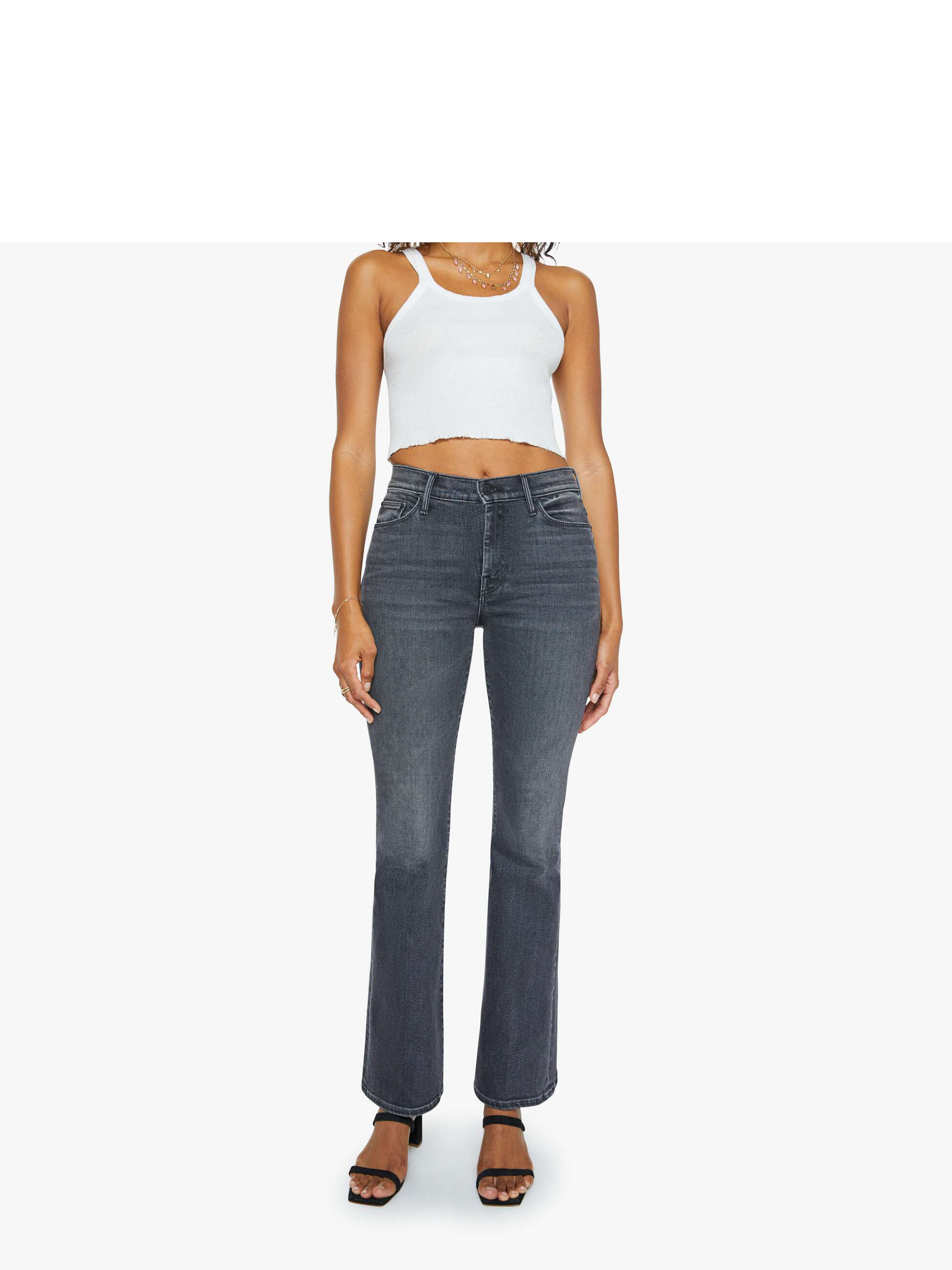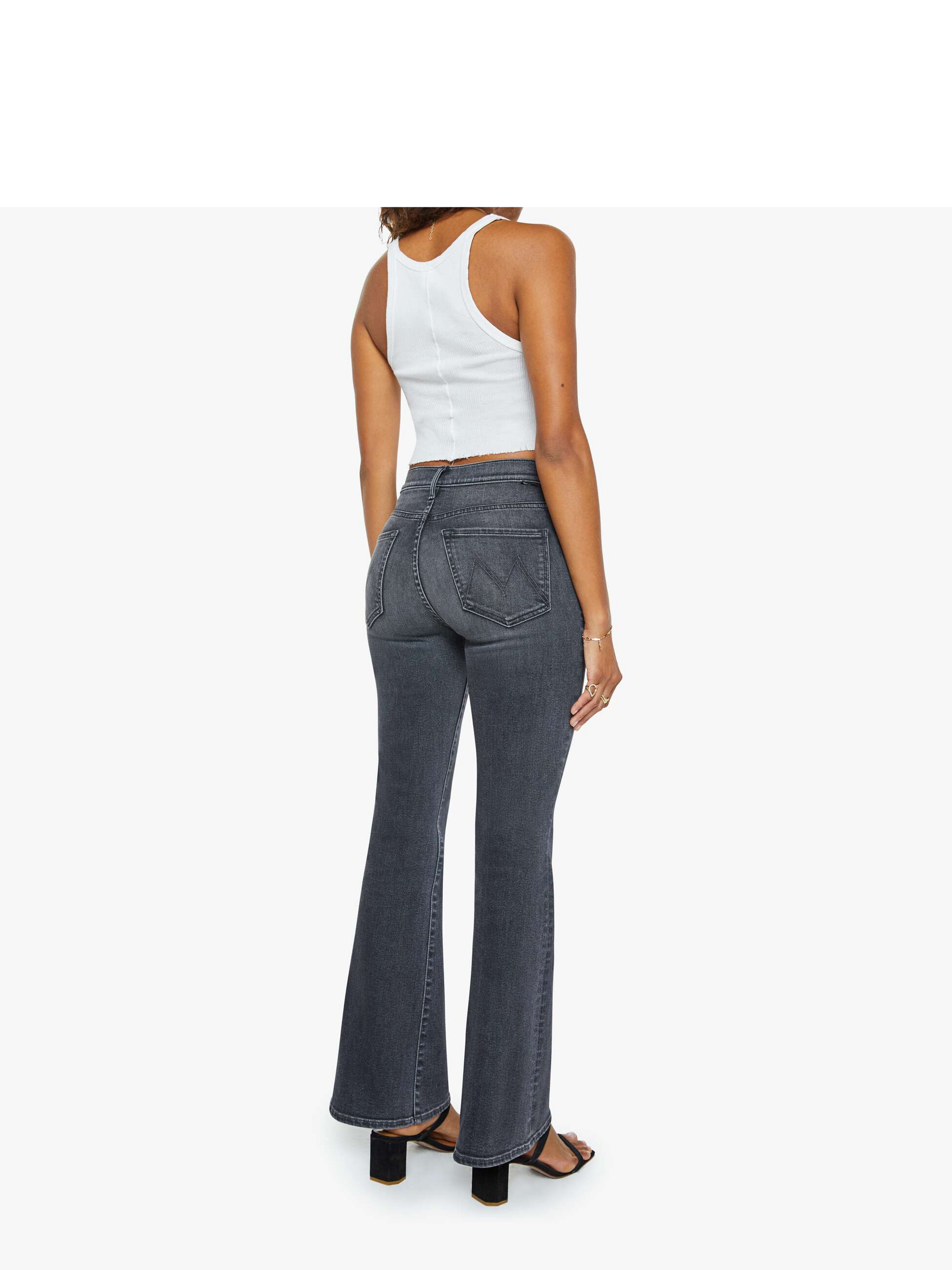 MOTHER The Weekender flare jeans feature a mid-rise fit and a 31-inch inseam with a clean hem, crafted from denim that includes a slight stretch for comfort and movement. The faded black wash is enhanced by subtle whiskering and fading, complemented by tonal hardware for a refined, understated look. These jeans combine classic style with modern details, making them a versatile addition to any wardrobe.