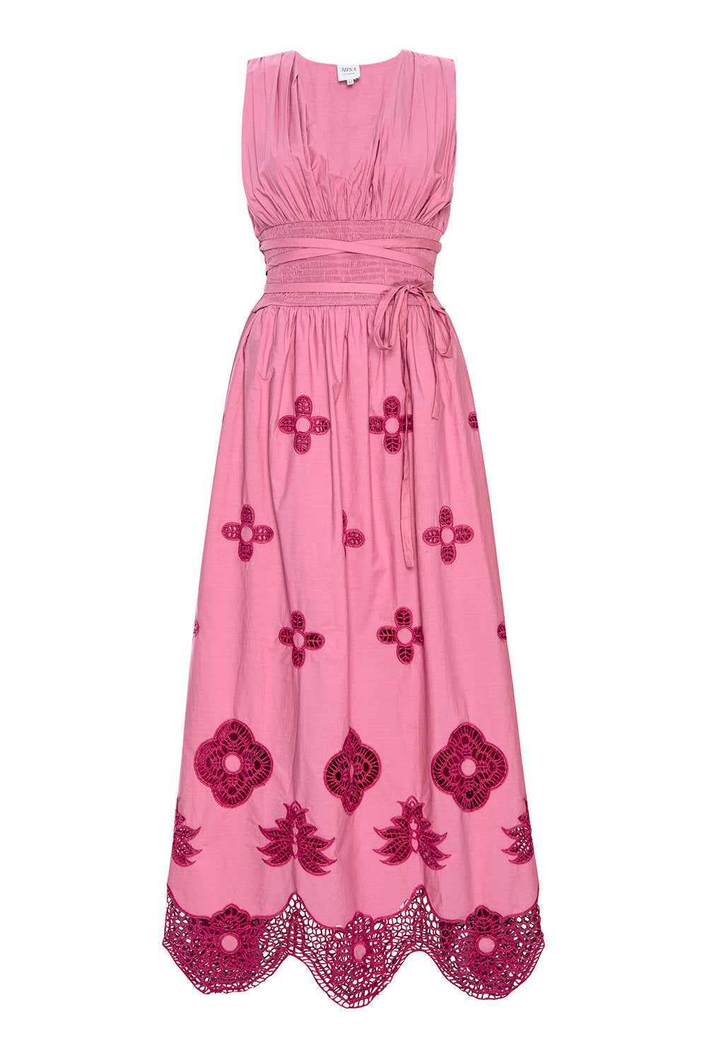 Our Myrtle dress is a new midi style in a vibrant fuchsia cotton poplin with gorgeous tonal lace embroidery on the skirt and hem. Sleeveless with a v neckline and a gathered bodice and wide smocked waistband with an optional tie detail for a truly feminine look. This perfect day to dinner style will carry you through spring and beyond.