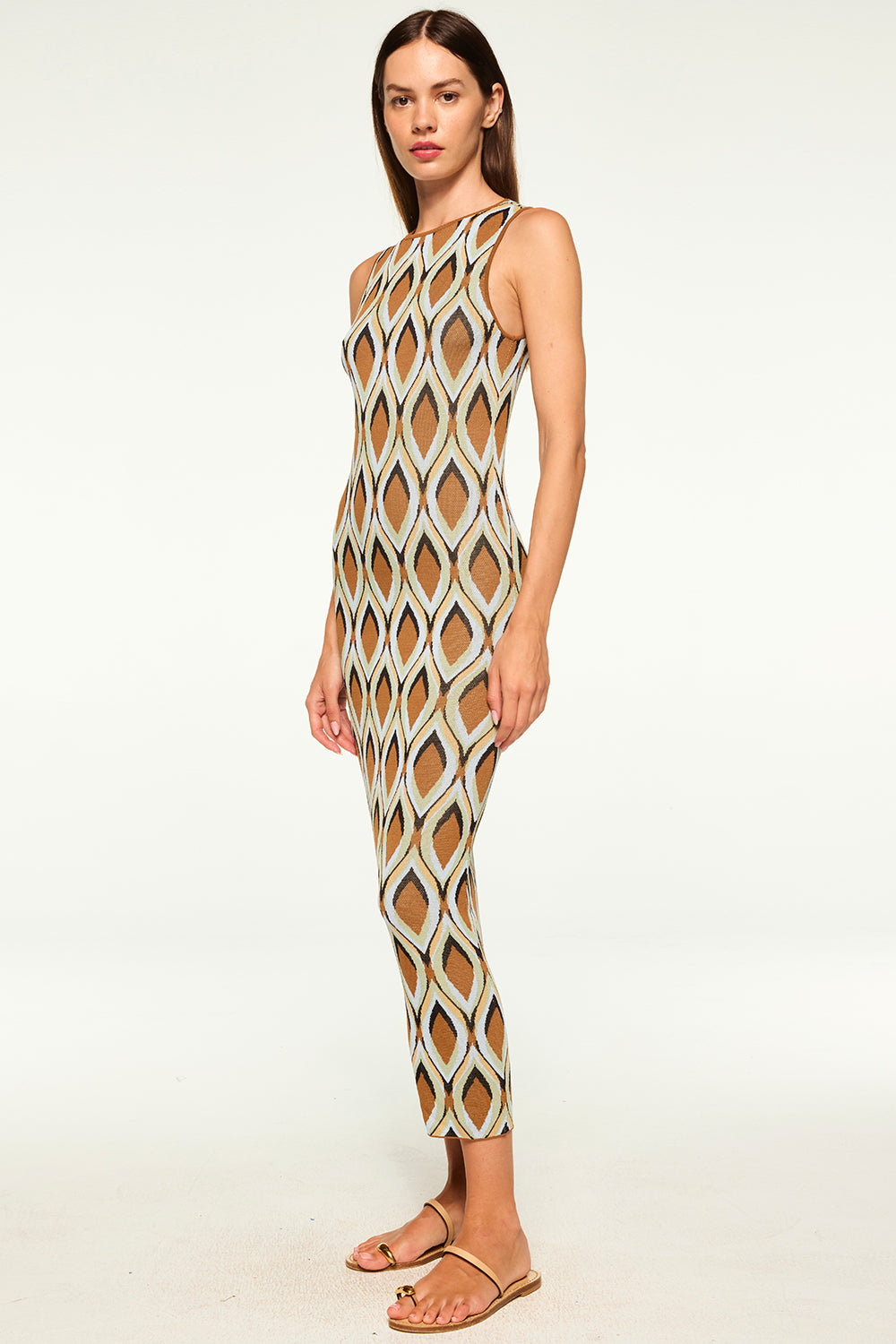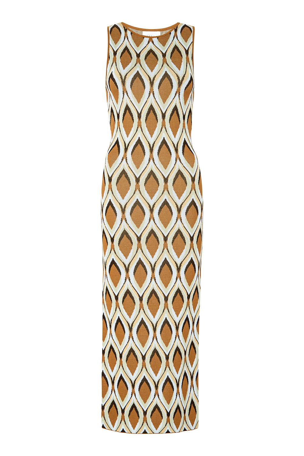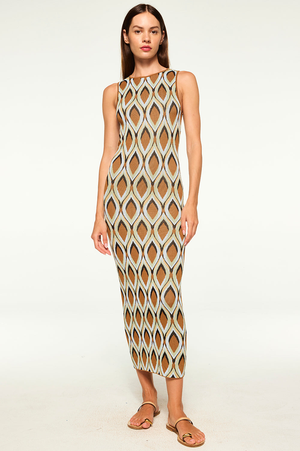 Our best-selling Nakia dress is back in a printed brown mix stretch jacquard knit. This figure-hugging sleeveless silhouette features a high neckline and thigh baring side slit. Pull-on style. Pair with everything from boots and a jacket to flat sandals as the weather warms up.