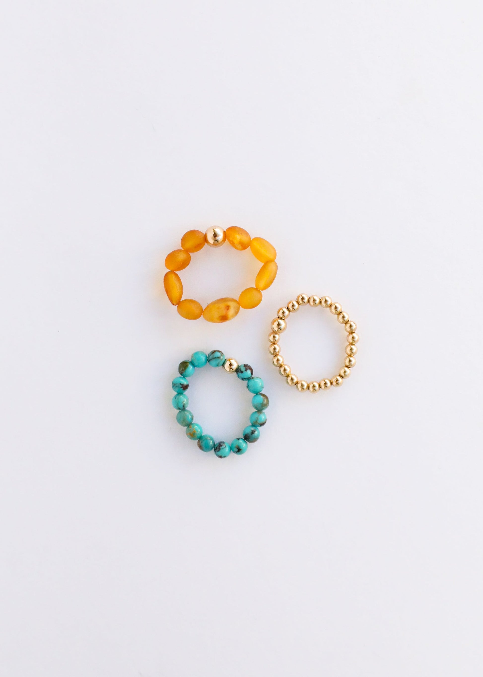 Natural Turquoise + 14k Gold Filled + Honey Amber || Ring Set Trio ||