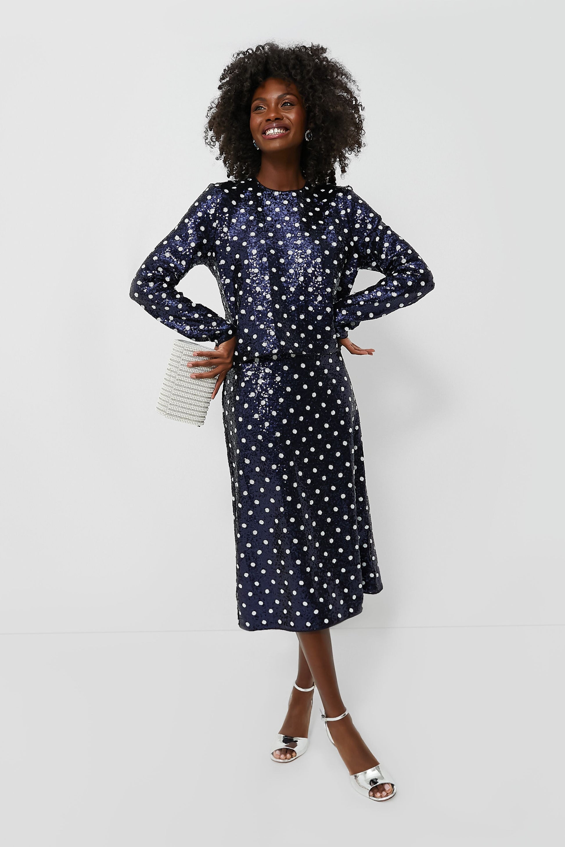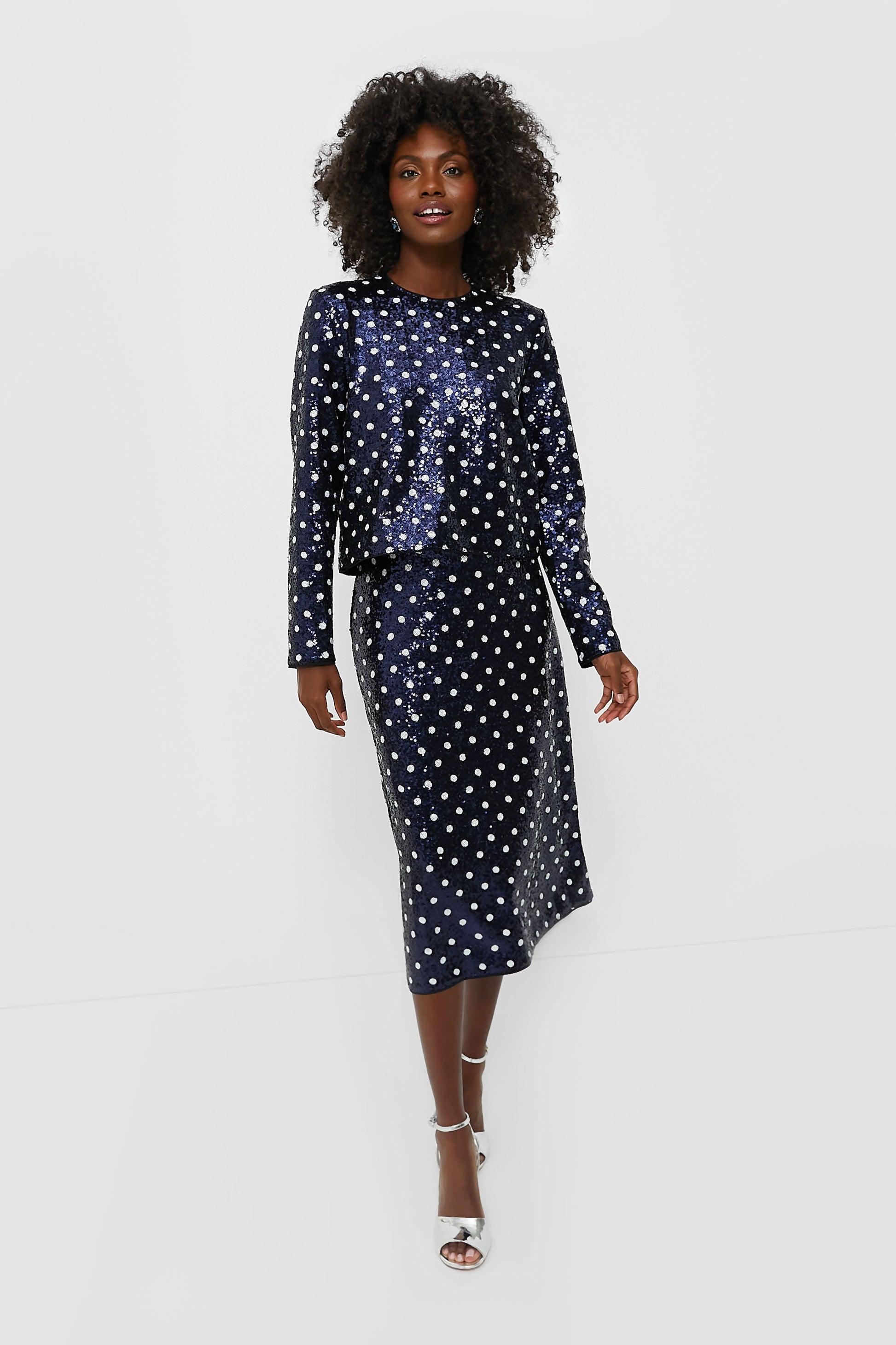 Make a sparkling impression at your next soiree in the Navy Dotted Sequence Jily Skirt! We adore the classic pencil silhouette with a hint of stretch for all-day wearability, and that fun yet understated print for a touch of intrigue. Style with the matching Jiza Shirt for a stunning statement, or pair with a cozy knit and boots for a dynamic office look.