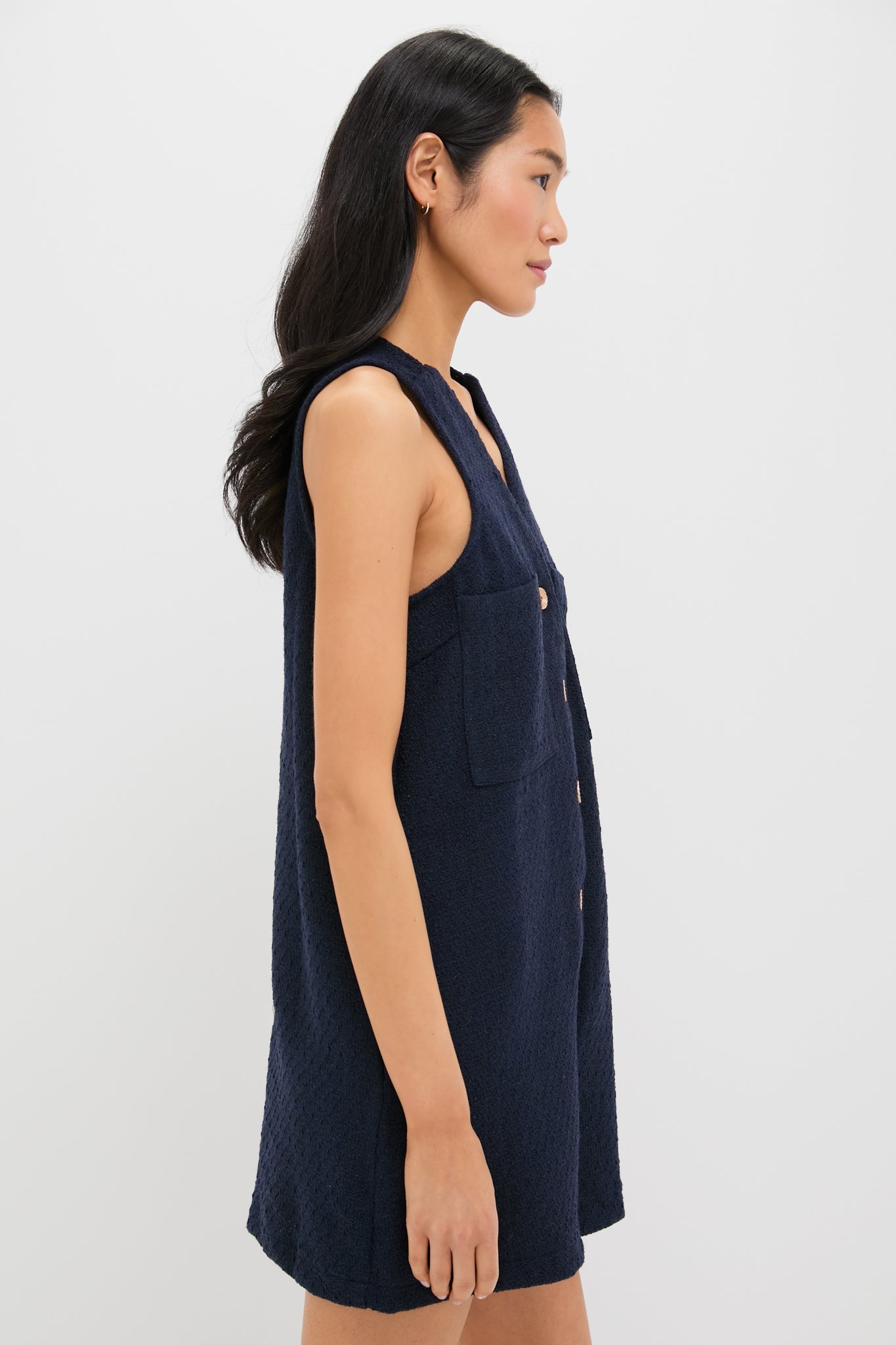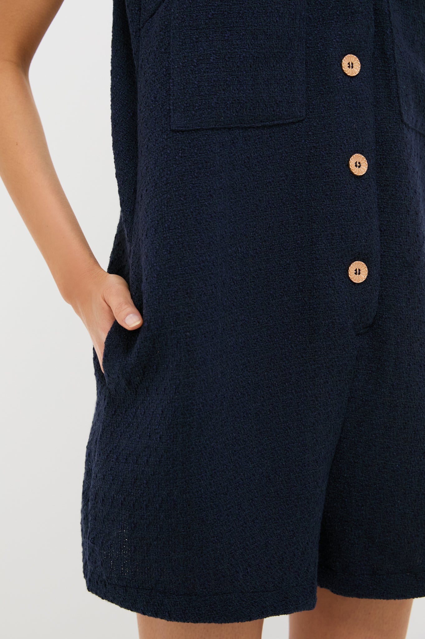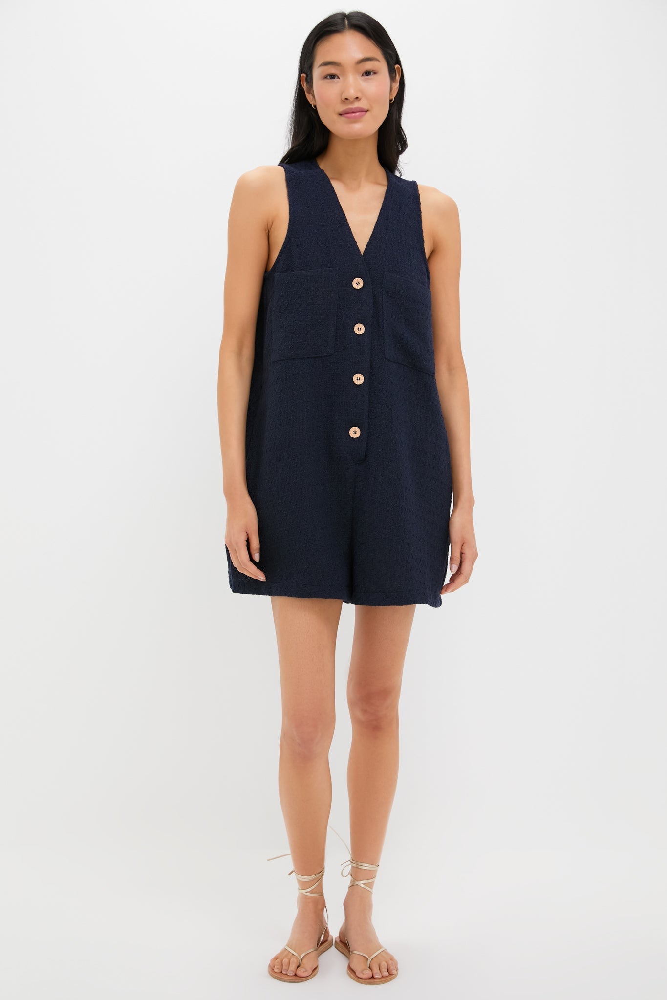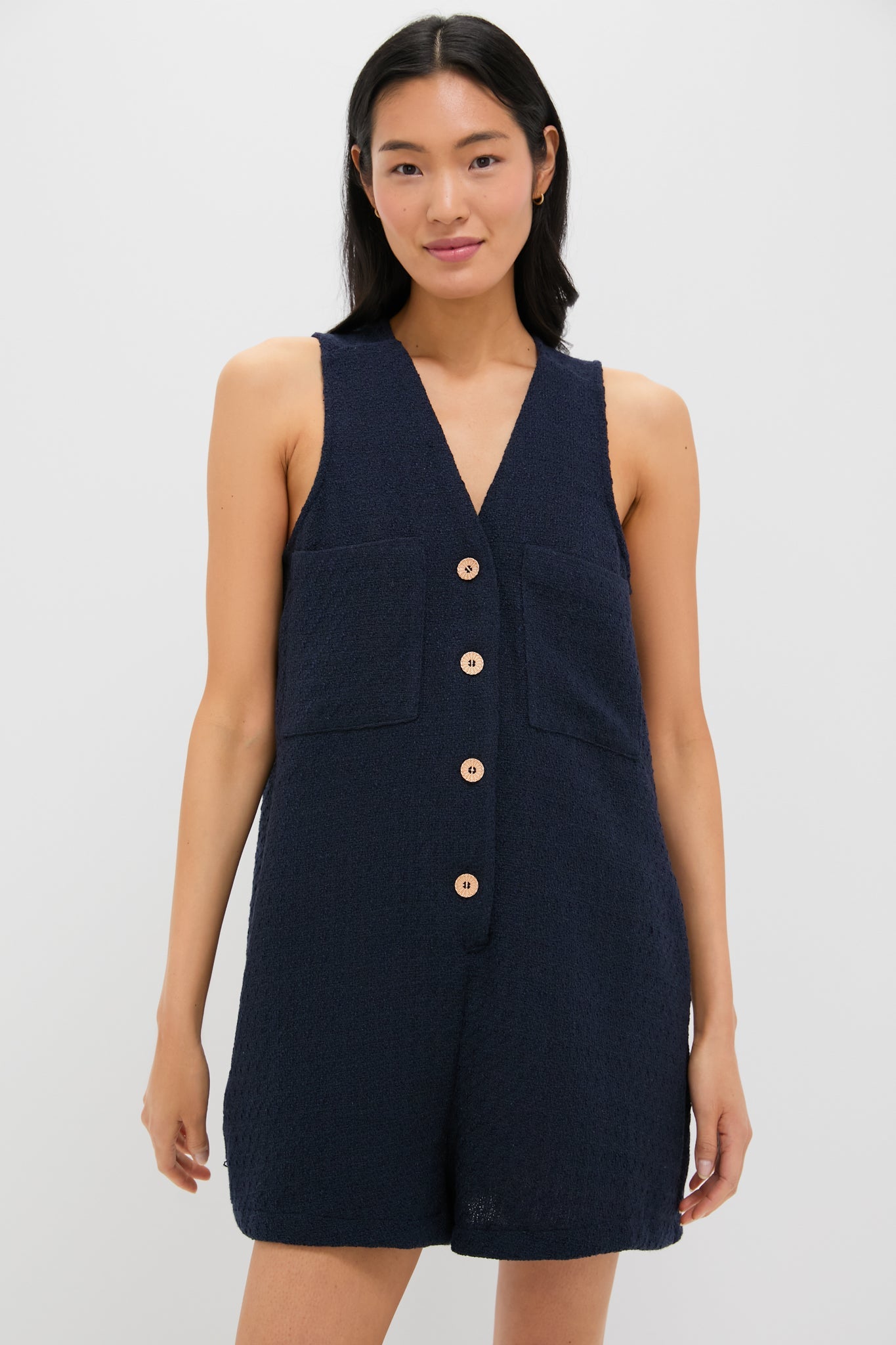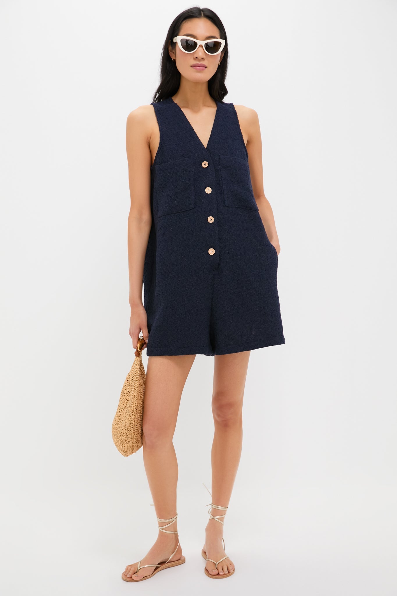 Effortlessly chic, this one-piece is perfect for anything and everything! From brunches and get togethers to happy hours and vacations, this easy yet elevated style has you covered. The Navy Myla Romper features two front pockets at the chest, gold button detailing for some extra shine, and a textured fabric to create cool contrast. Pair with glitzy flats and bold accessories for glamorous dinners on your next getaway!